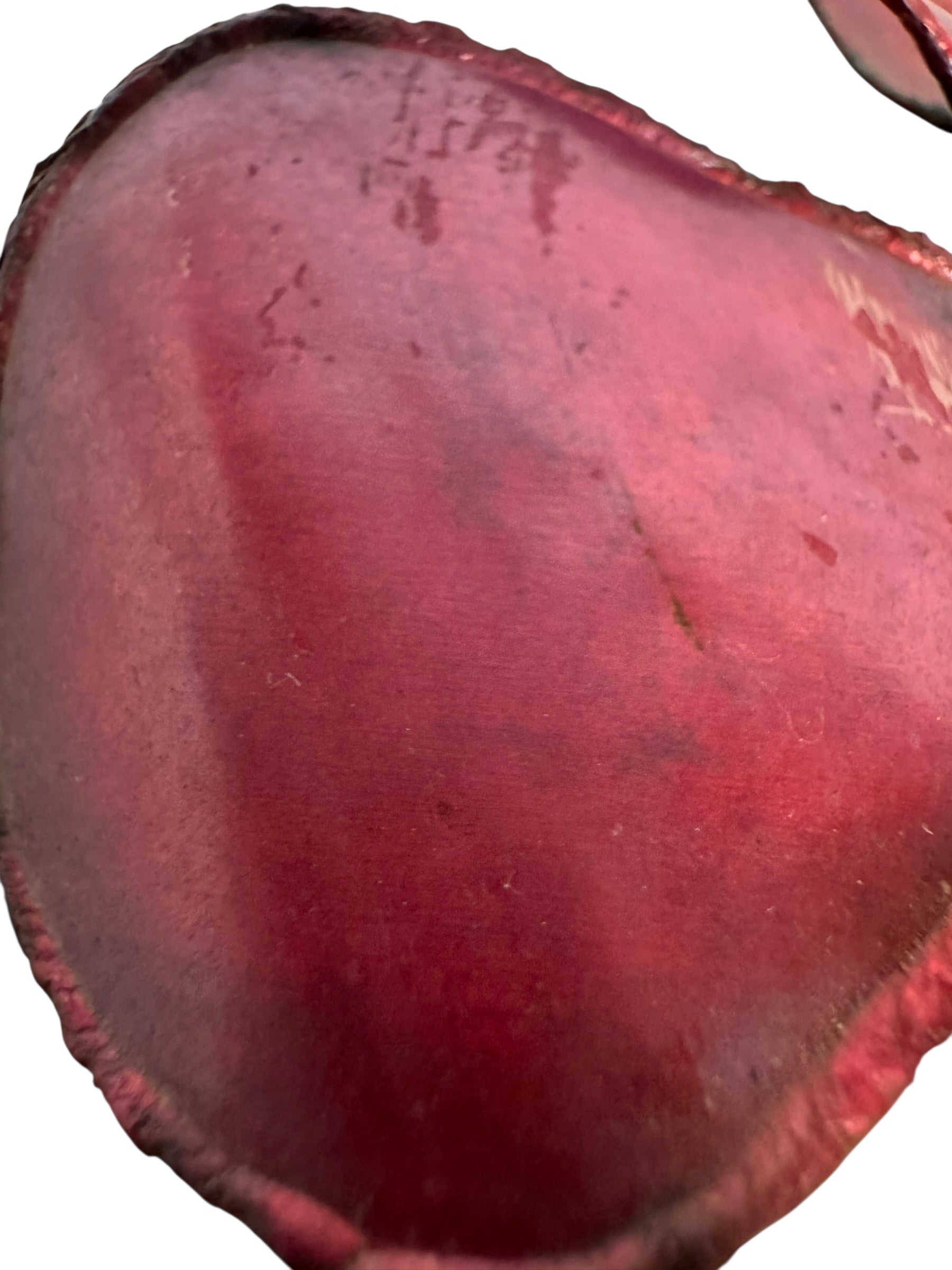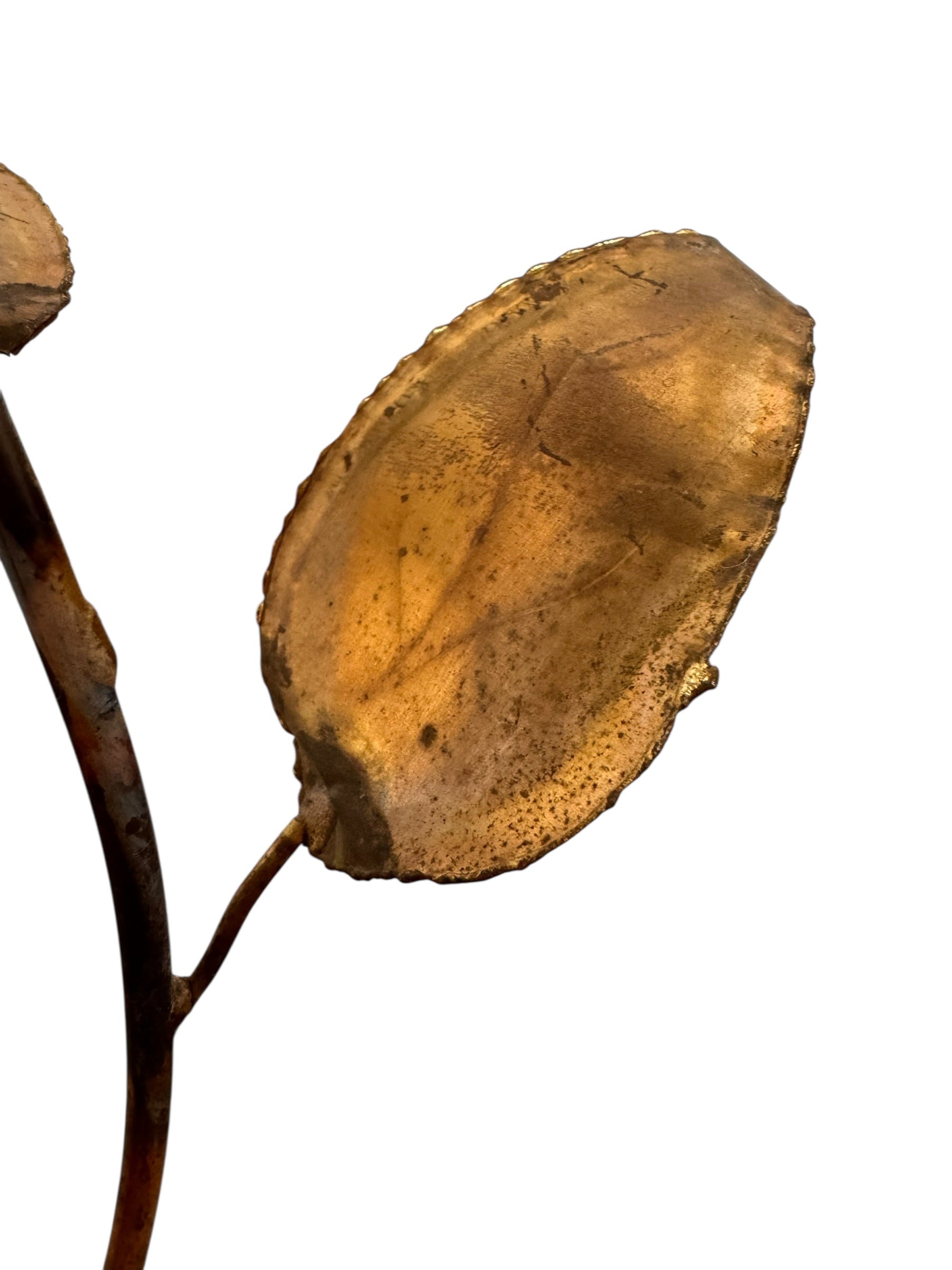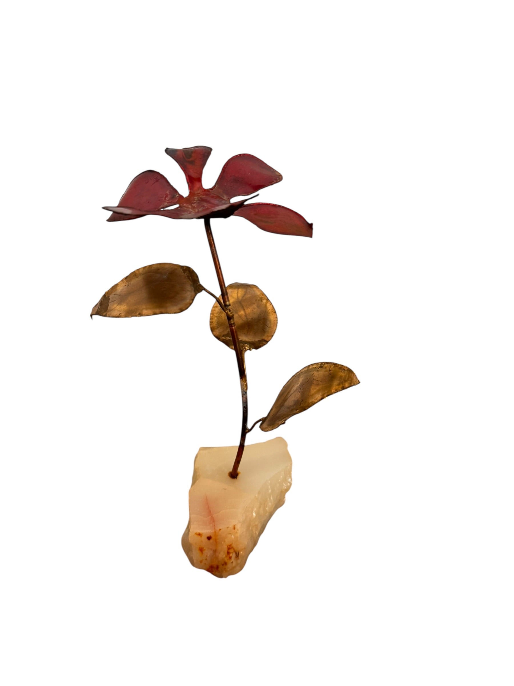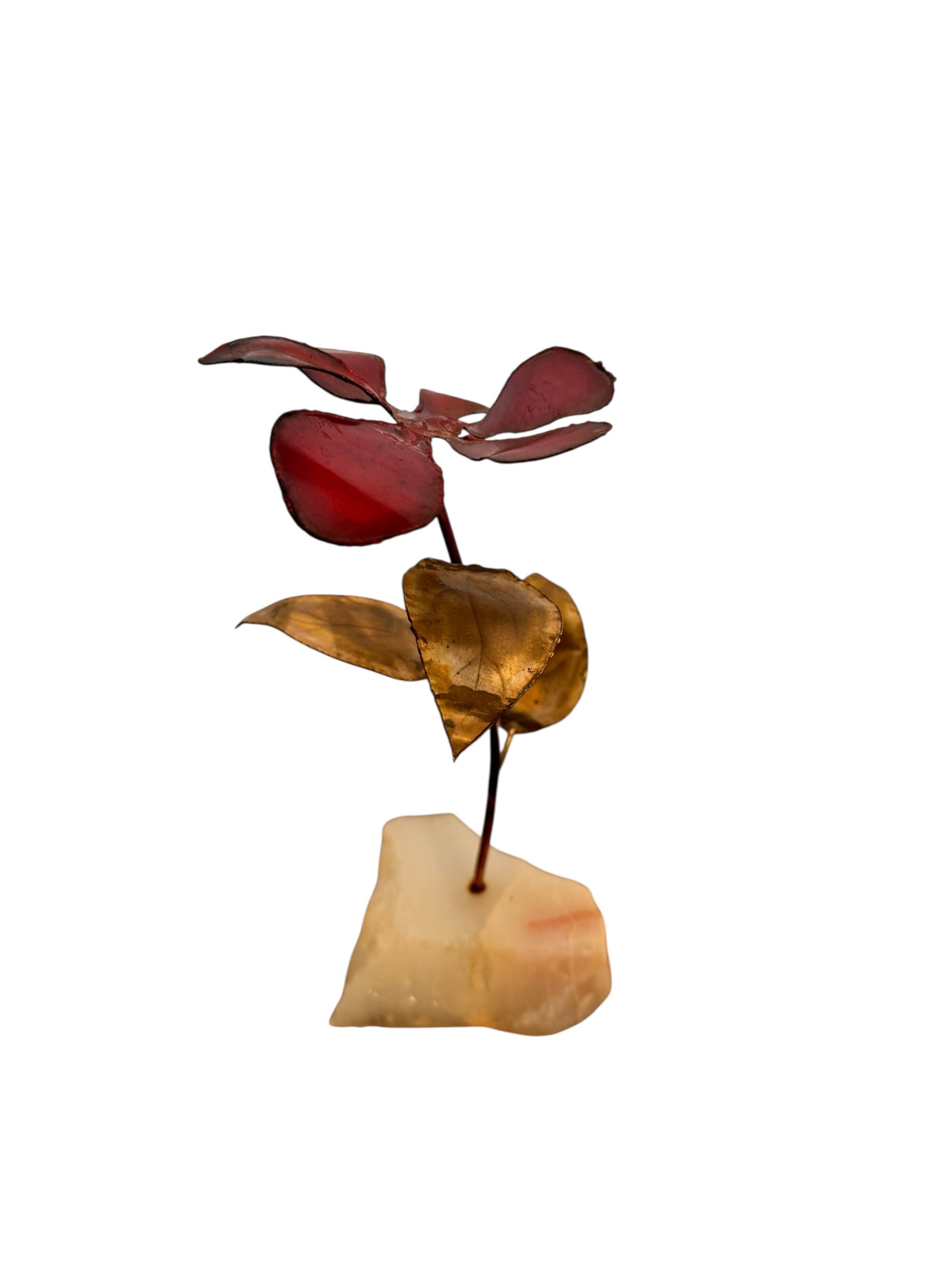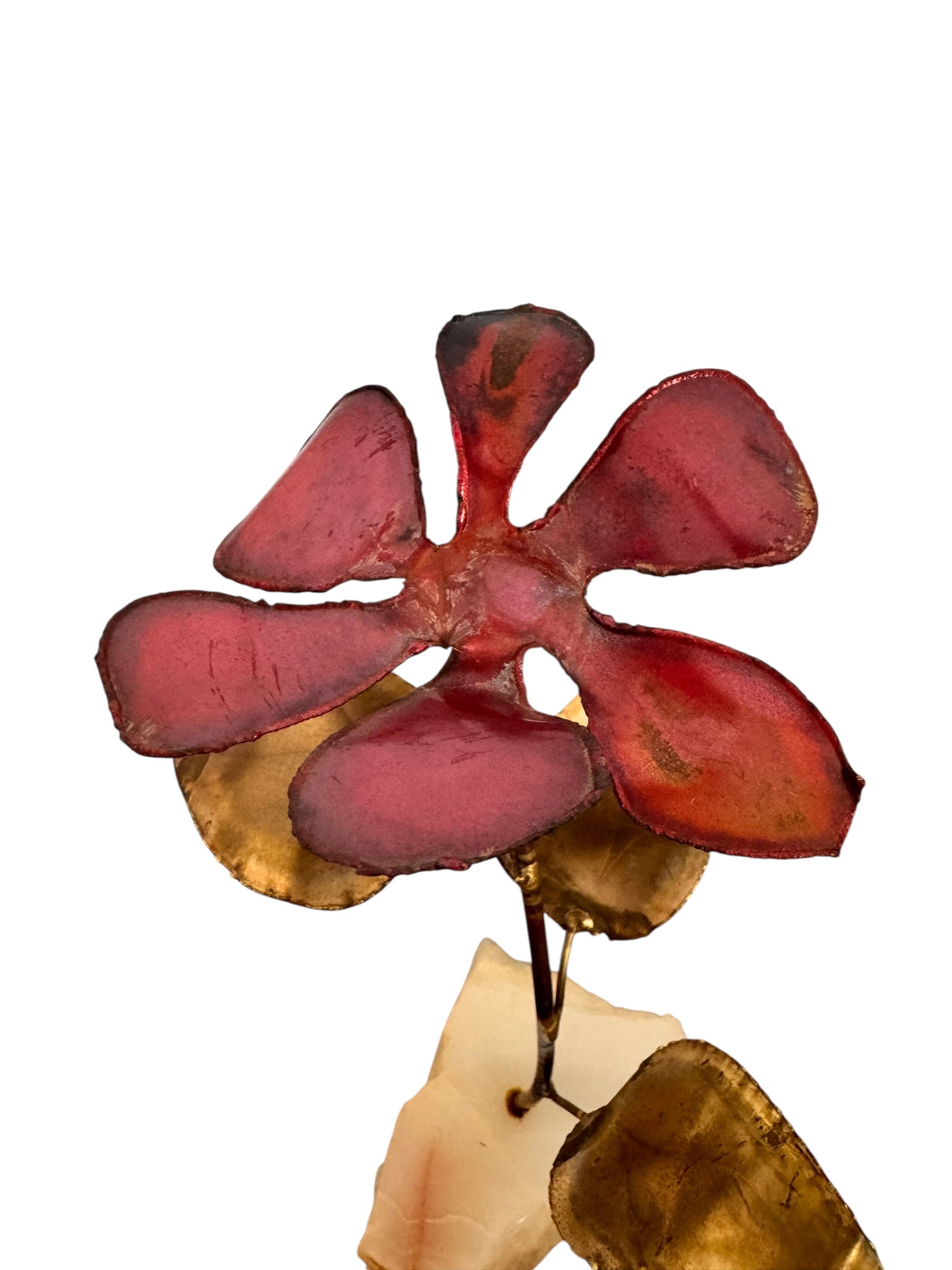 This vintage sculptural work offers a sophisticated study in textural contrast and organic geometry, capturing the expressive spirit of mid-century metalwork. The hand-formed petals feature a deep, saturated bordeaux finish with a soft luster that catches the light, while the stem and foliage display a rich, authentic patina and natural oxidation consistent with its decades of history. The construction reveals the raw, visible solder points and scorched edges synonymous with the brutalist movement, lending the piece a distinct sense of the artist's hand and a rugged, industrial charm.