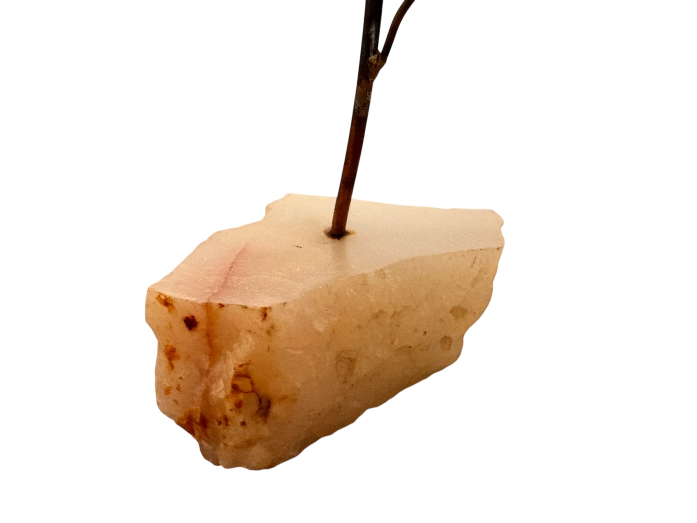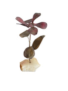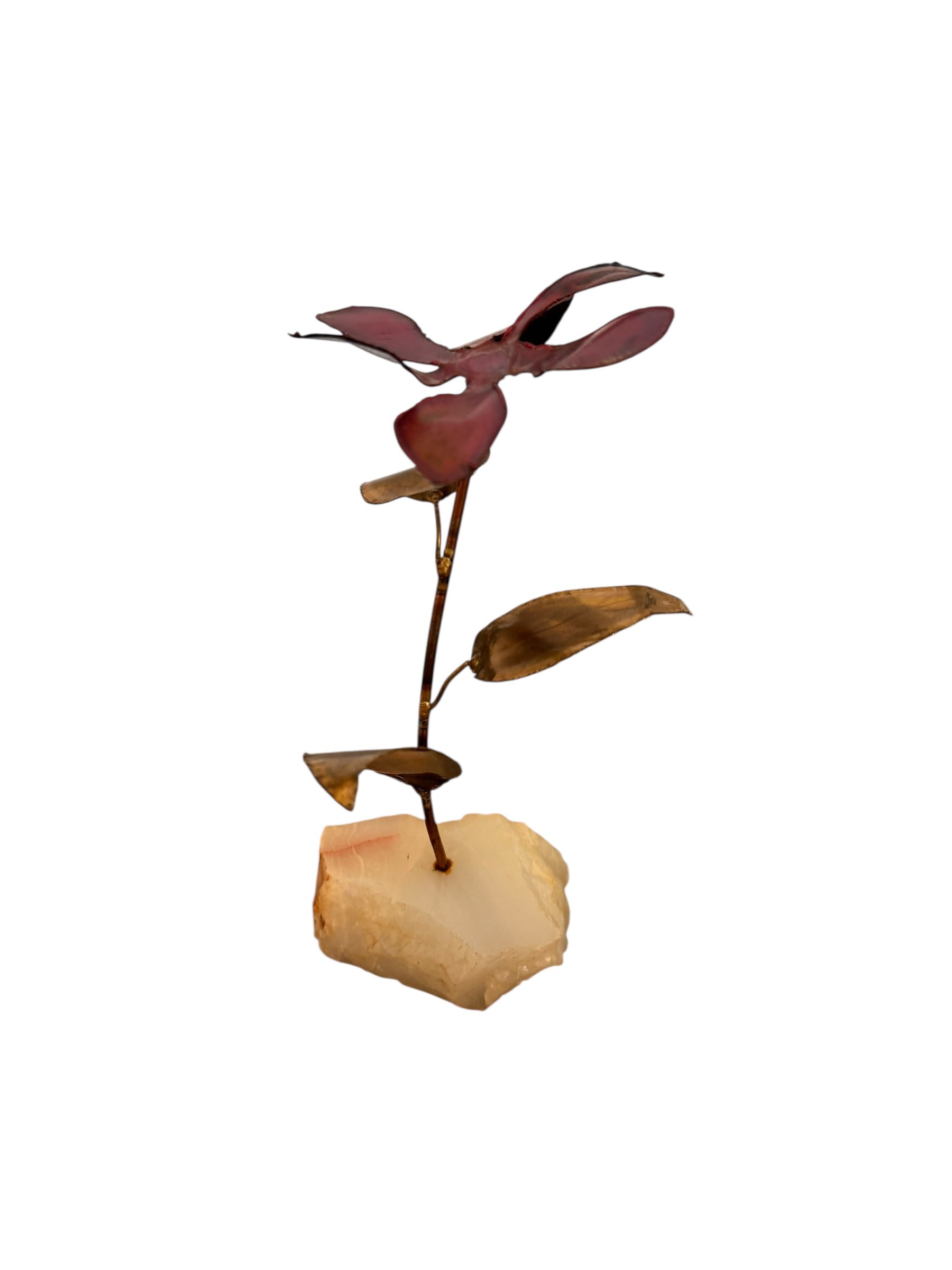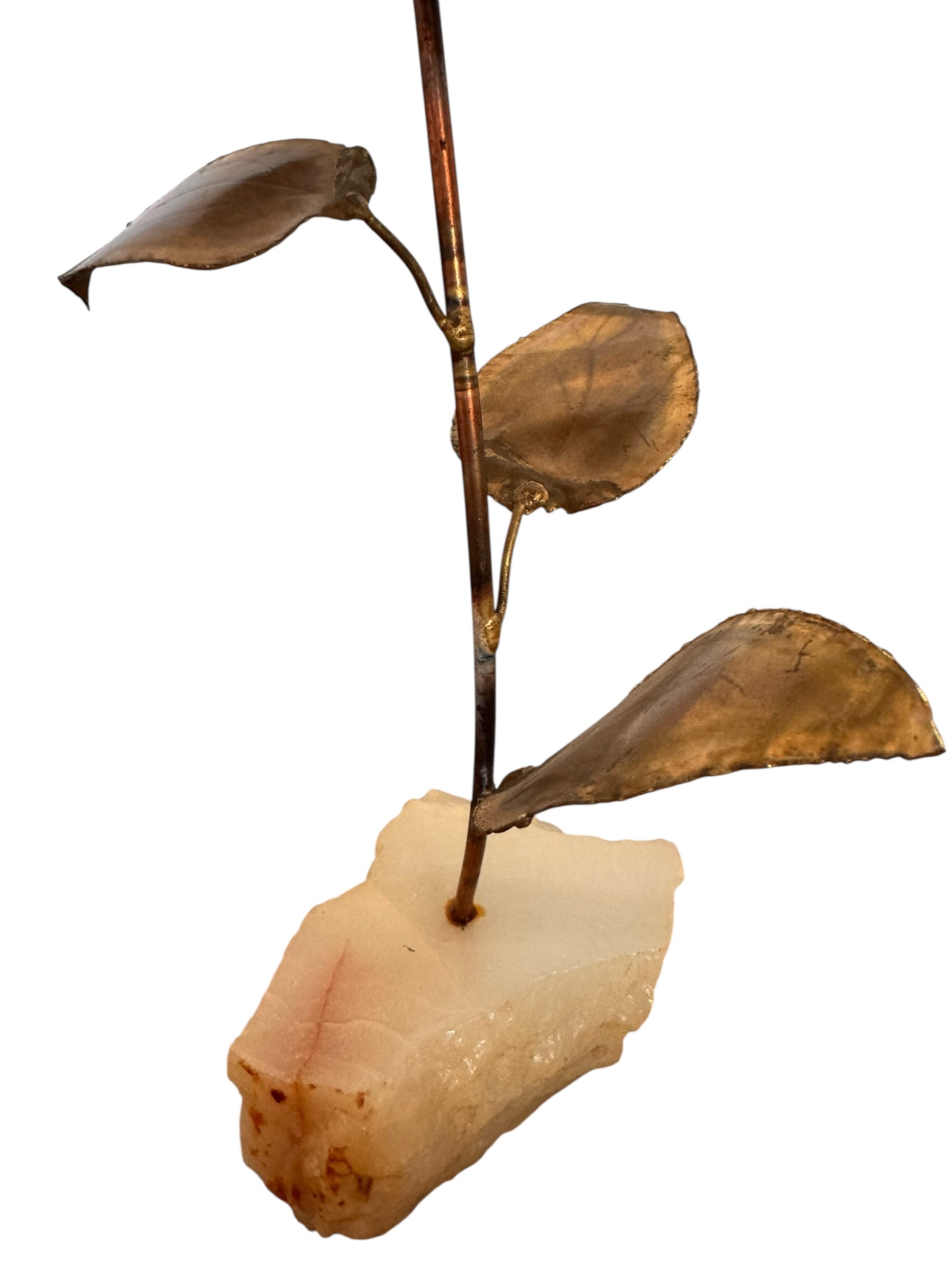 The floral form is permanently anchored into a substantial base of raw, unpolished quartz, creating a balanced silhouette that juxtaposes warm, weathered metals against the cold, translucent mineral. Presented in excellent vintage condition, the sculpture retains its structural integrity while showcasing an age-appropriate character that enhances its overall aesthetic. The quartz base remains solid and distinctive, featuring original crystalline inclusions and a jagged, natural form.