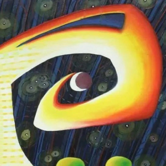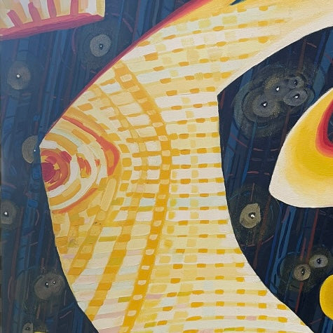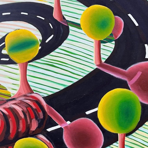 This artwork features a winding road lined with vibrant green trees, which contrasts with a dark, starry or cosmic background. A large, swirling, glowing form—possibly representing light or energy—dominates the top of the composition, curving toward the center of the scene. The bright colors and geometric forms give it a dreamlike or fantastical quality, while the road may symbolize a journey or transition.