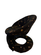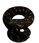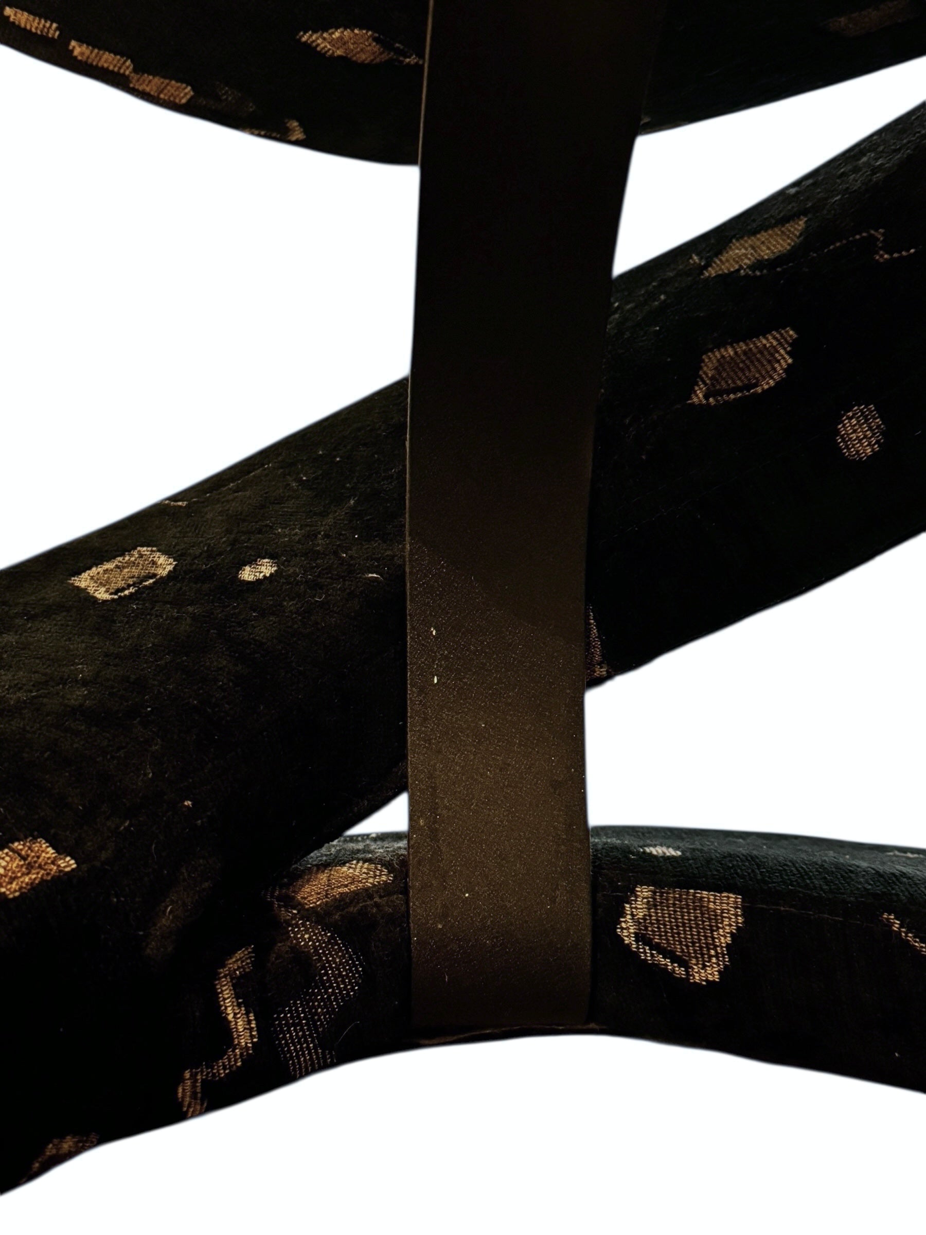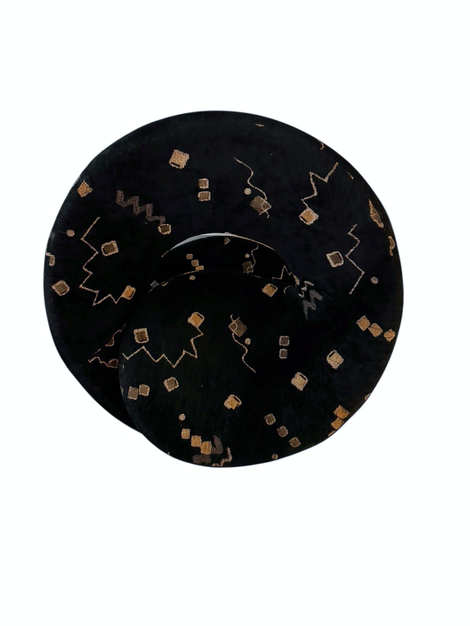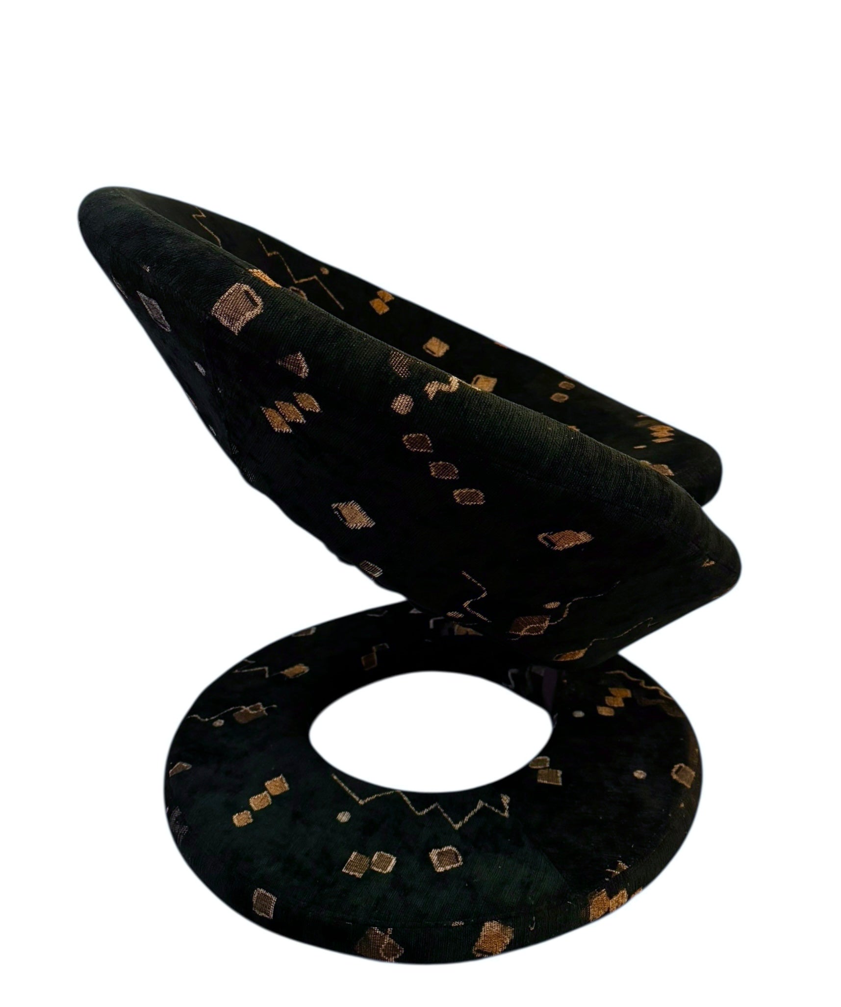 These examples are distinguished by their pristine, original upholstery—a textured black plush velour that serves as a canvas for a striking Memphis-style motif. The fabric features floating geometric confetti—cubes, spheres, and zig-zagging "squiggles"—rendered in metallic gold and taupe threads against the deep noir background. The close-up detail reveals a high-quality woven construction where the metallic elements catch the light, adding depth and movement to the piece.