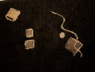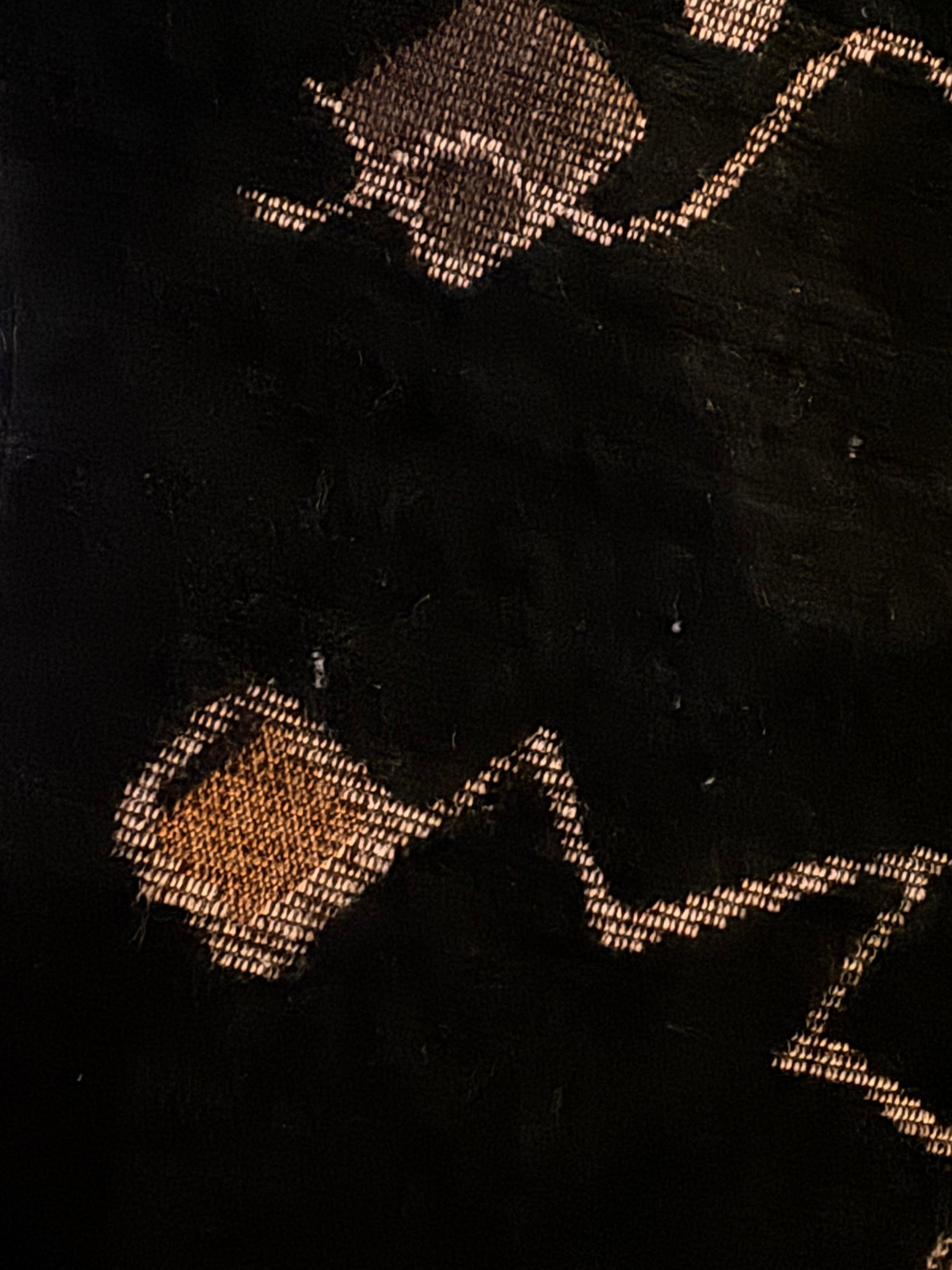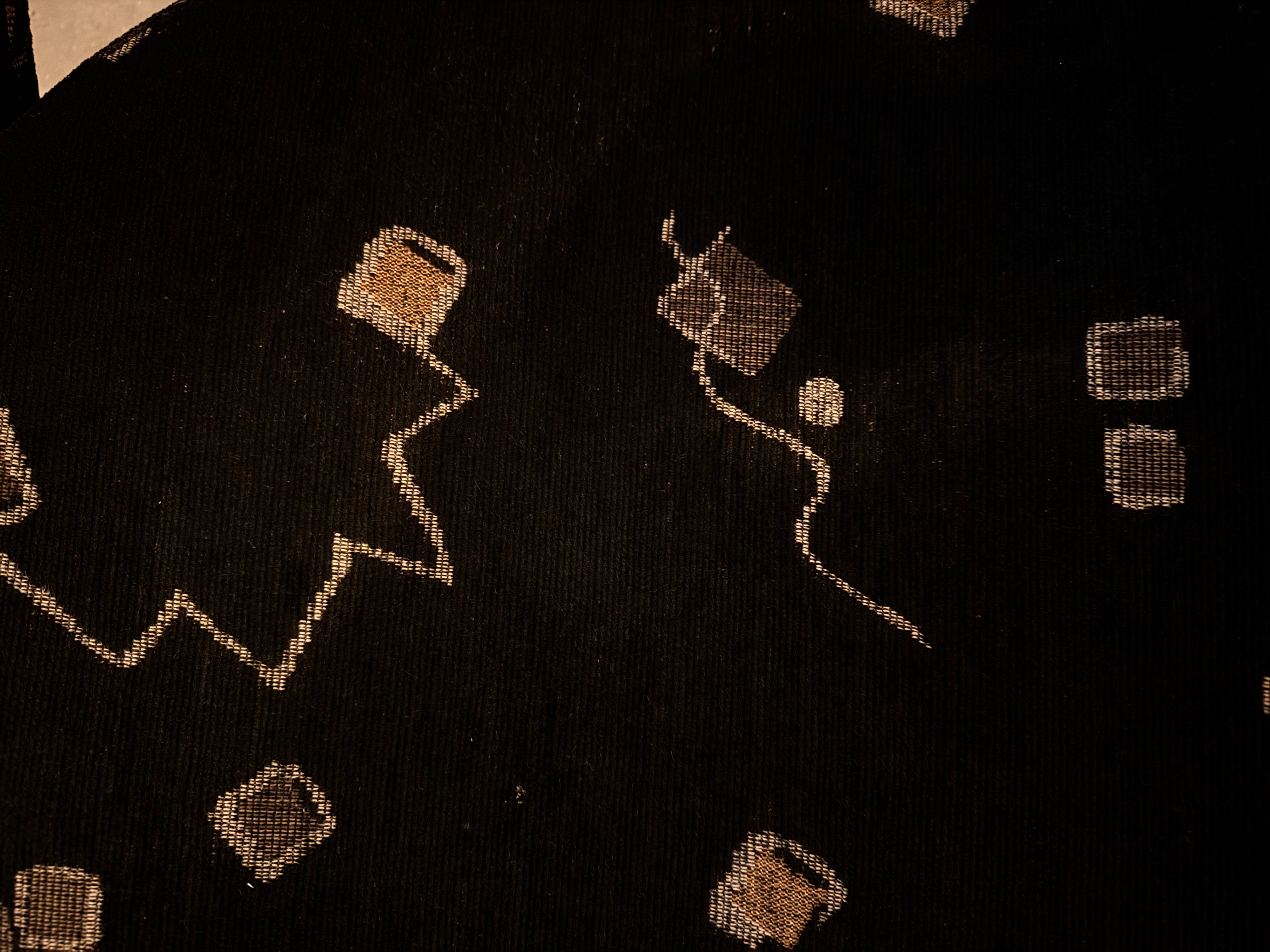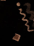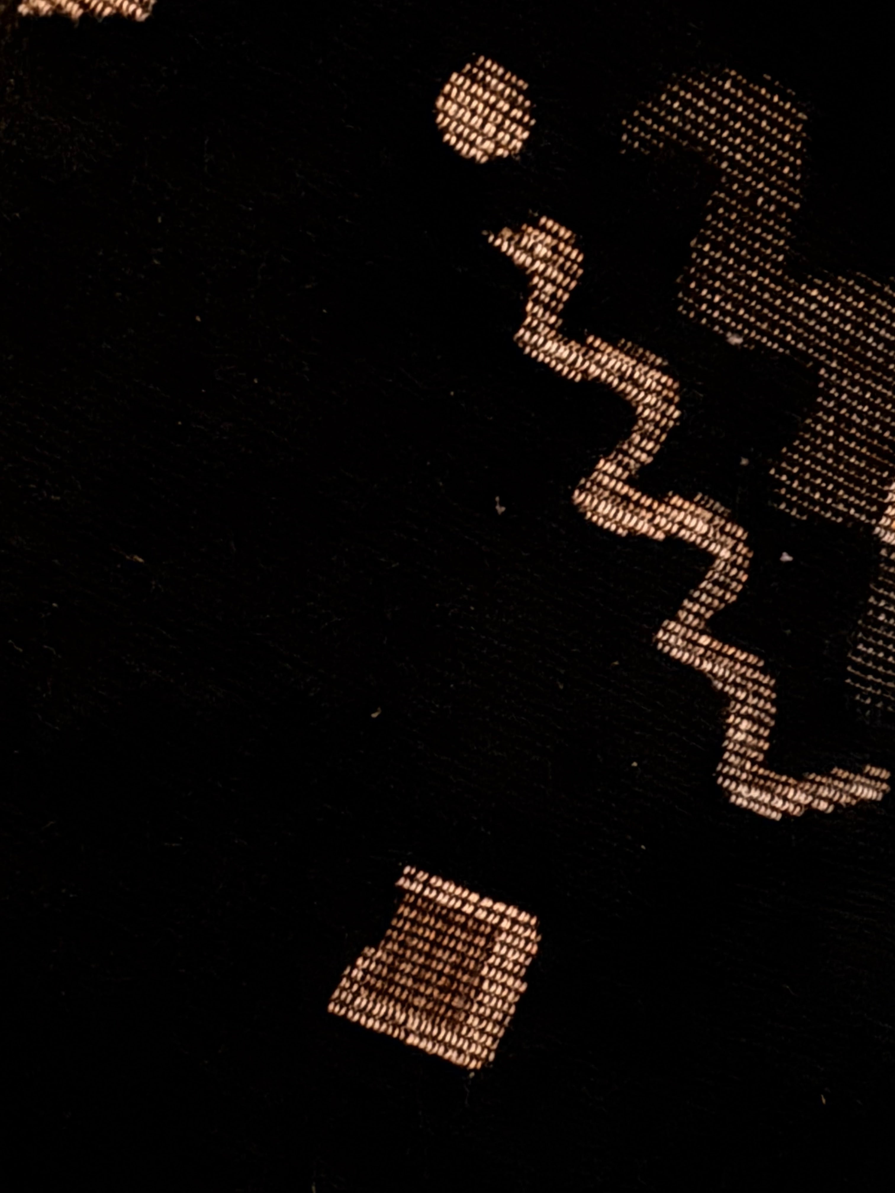 These examples are distinguished by their pristine, original upholstery—a textured black plush velour that serves as a canvas for a striking Memphis-style motif. The fabric features floating geometric confetti—cubes, spheres, and zig-zagging "squiggles"—rendered in metallic gold and taupe threads against the deep noir background. The close-up detail reveals a high-quality woven construction where the metallic elements catch the light, adding depth and movement to the piece.