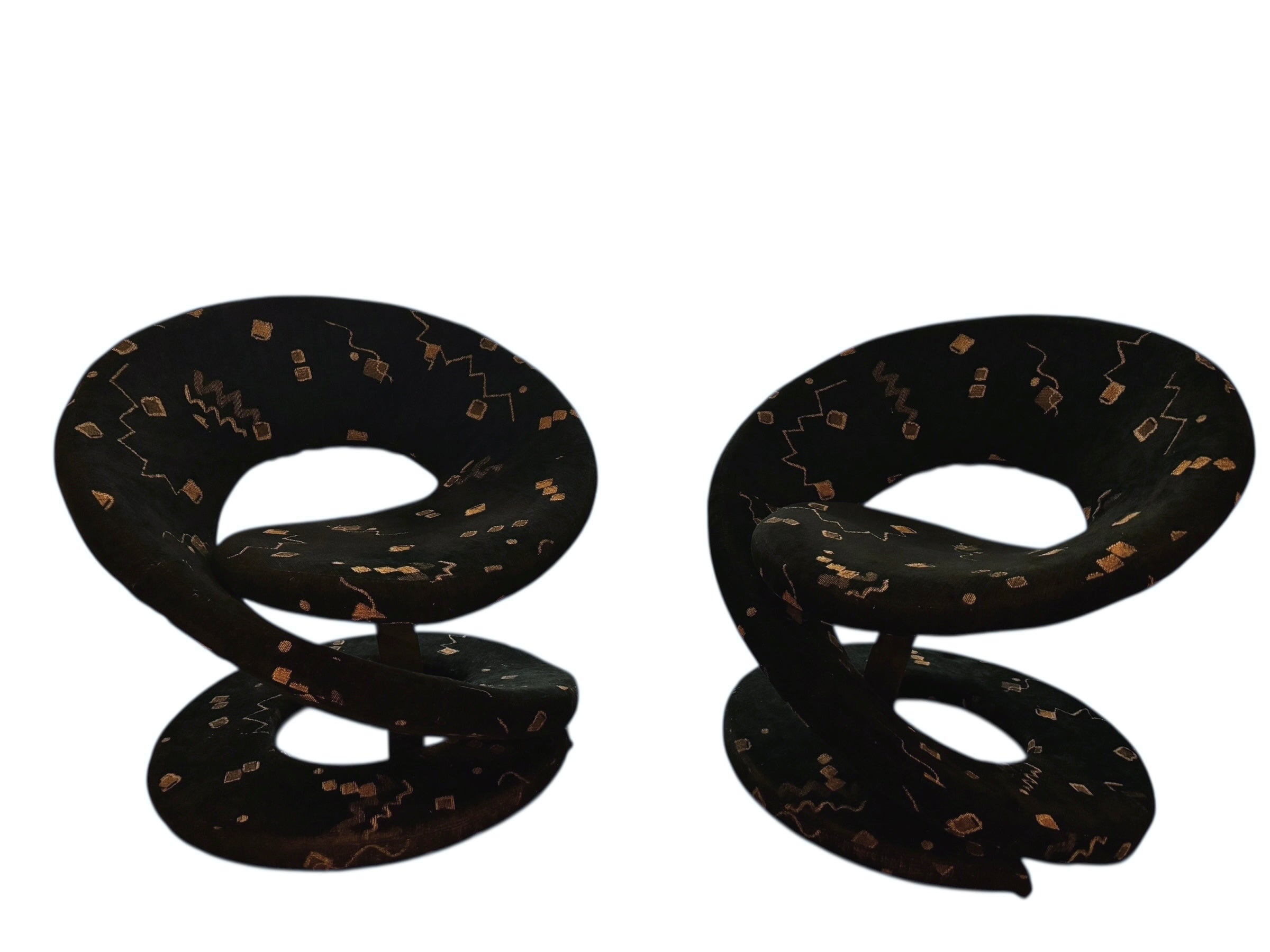 A defining moment in Canadian furniture design, this pair of sculptural coil chairs by Jaymar Furniture Ltd perfectly encapsulates the bold, geometric energy of the 1980s Post-Modern movement. Often referred to as "Ribbon" chairs, their silhouette is a continuous, gravity-defying helix that serves as both functional seating and kinetic sculpture.