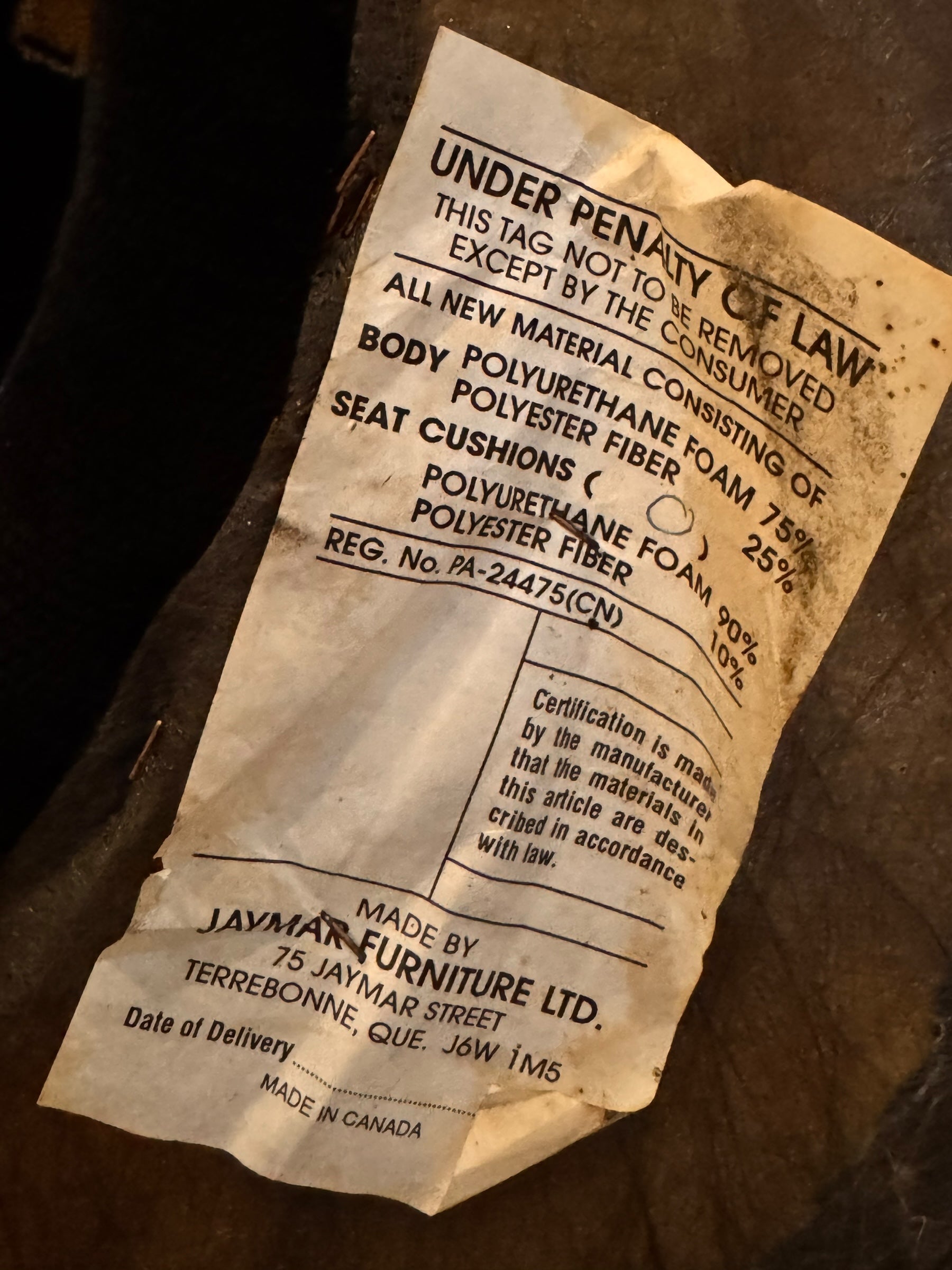 Retaining their original manufacturer's law tags, these chairs are confirmed authentic Jaymar productions made in Canada. Built with a solid internal structure encased in polyurethane foam and polyester fiber, they offer a surprisingly comfortable, suspended seating experience grounded by a weighted base. We currently have a pair of these chairs available.