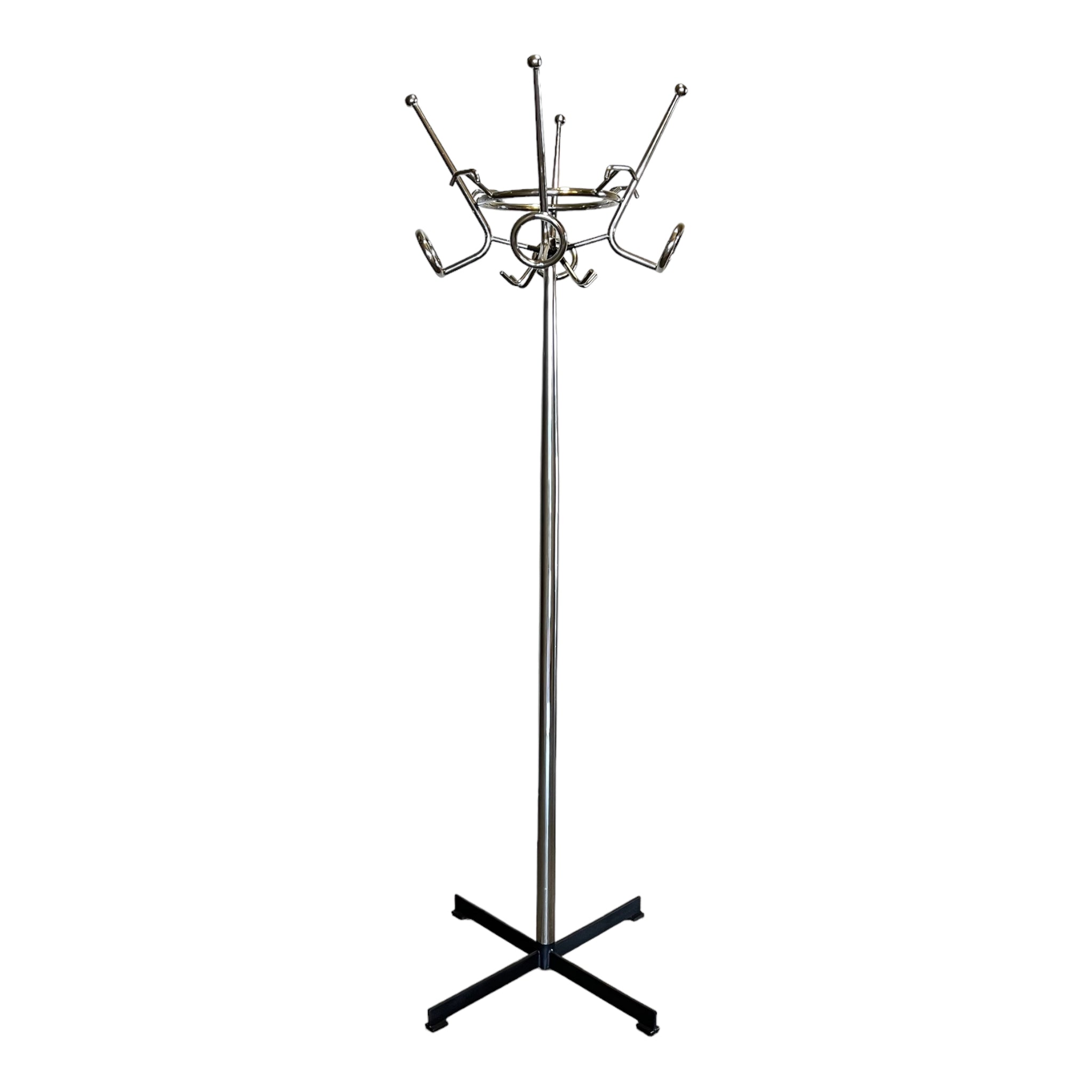 A stylish hall tree for your most unique fashionable self. A 1960s' beauty. Perfect for the hat wearing, jacket toting, scarf tying, leash carrying maximalist with a passion for organization. Chromed steel. Sixteen designated holders for your pretties. Rising on a tapered cylinder stand, ending on black X-form base. Refurbished steel base has been re-welded, reinforced, and repainted. Great vintage condition. Some wear through out. A perfect place to hang your coat, gloves, bag, keys...the true catch all!