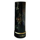 This exquisite wood lacquered plant stand showcases a striking black and red floral motif, featuring vibrant camellias that exude elegance and charm. The piece is embellished with intricate gold detailing, reflecting a distinct East Asian influence, likely of Japanese or Chinese origin. With its tall, cylindrical form and glossy finish, this stand not only serves as a functional piece but also as a captivating decorative element that enhances the aesthetic appeal of any interior space. Some wear to lacquer consistent with age.