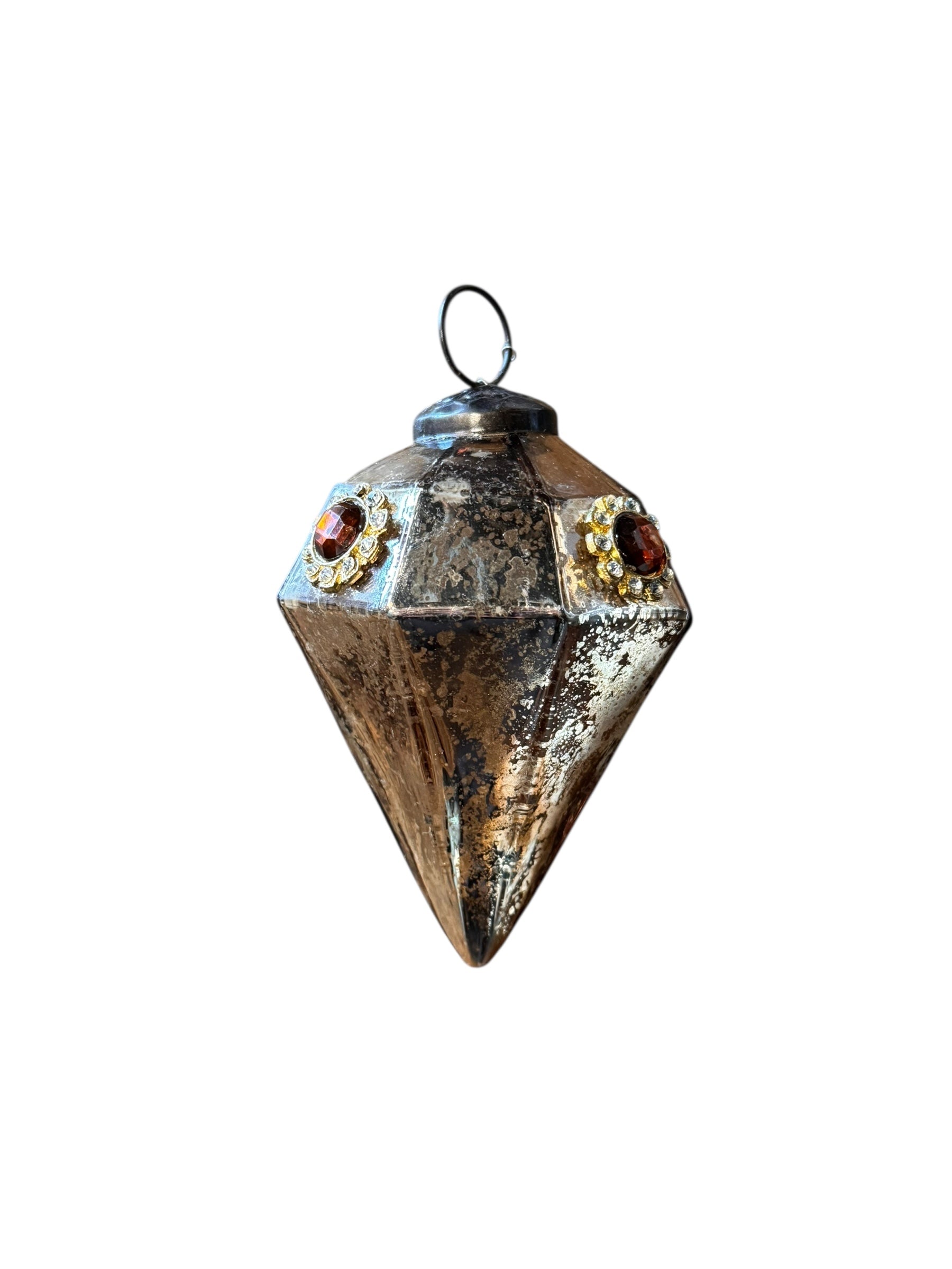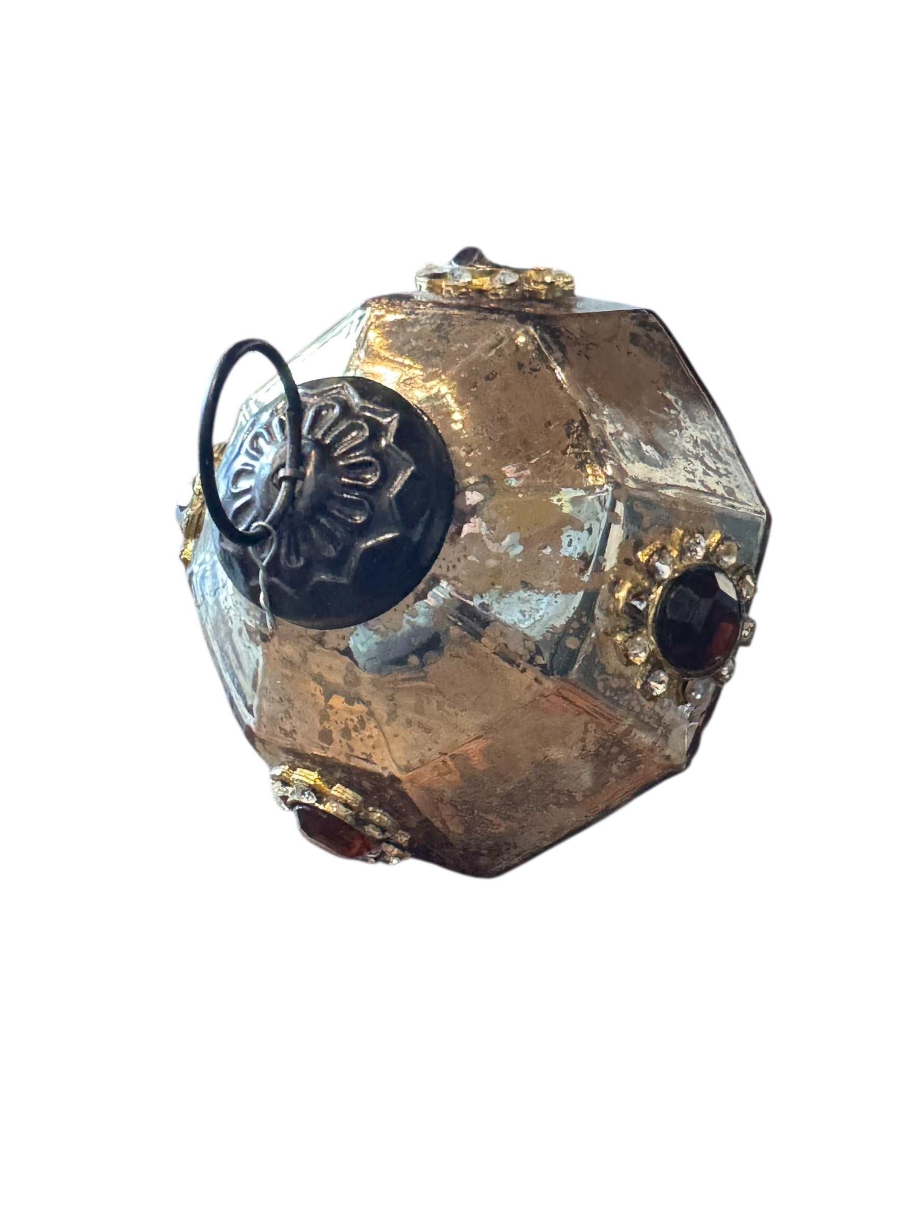 mage of a vintage-style, gilded tin bird with embossed feather detailing. A green velvet ribbon is attached. Front and back views shown.