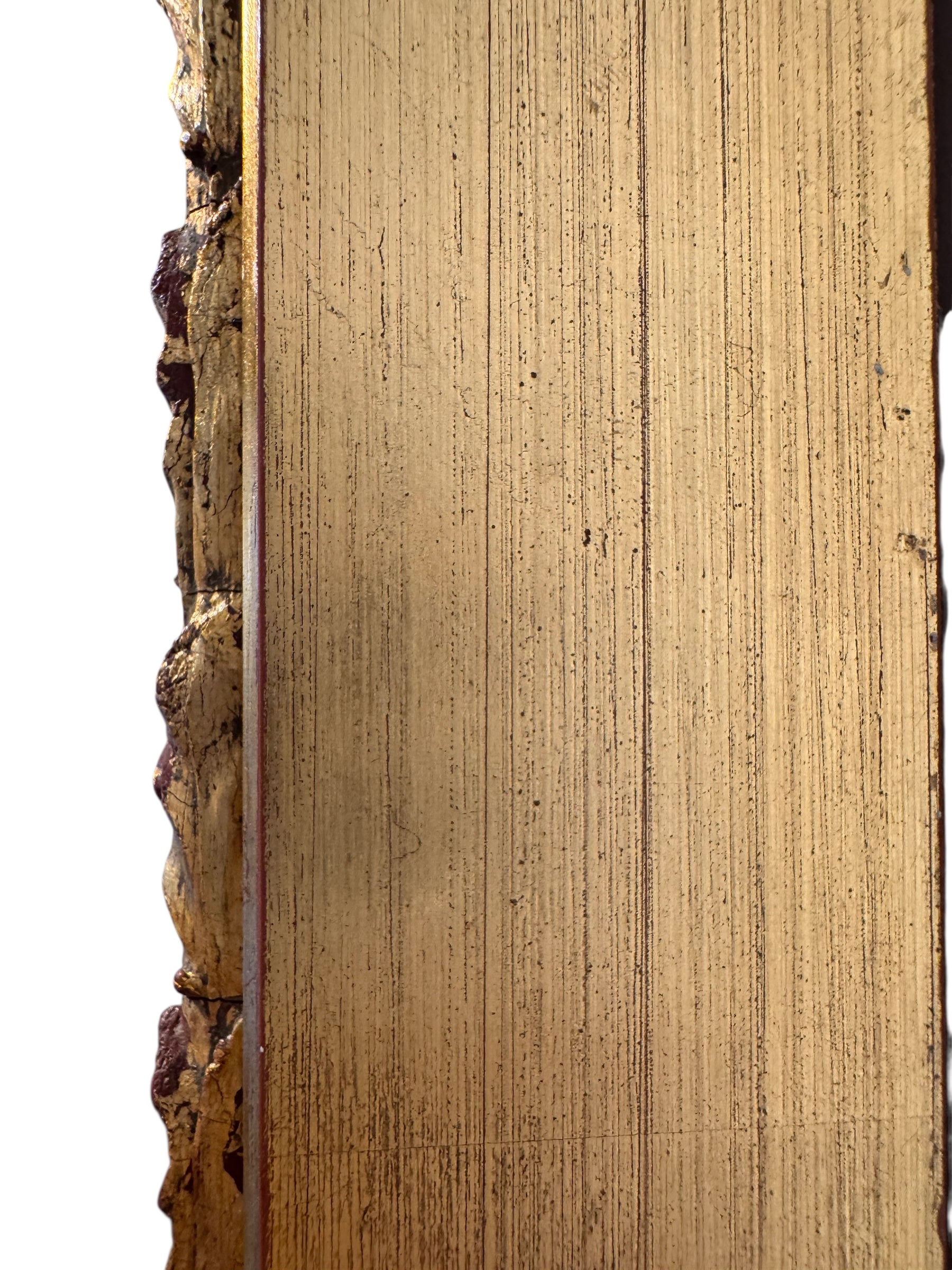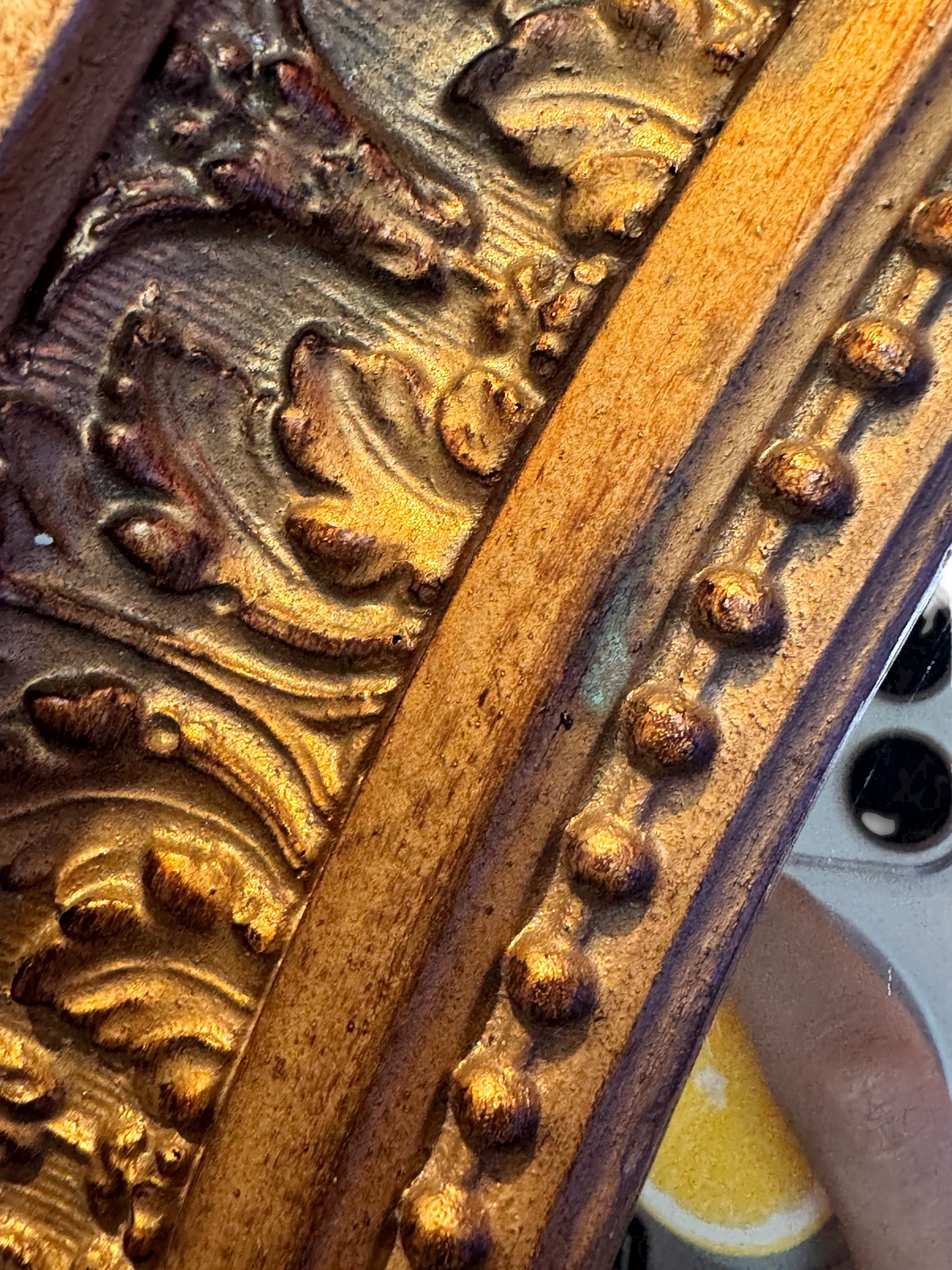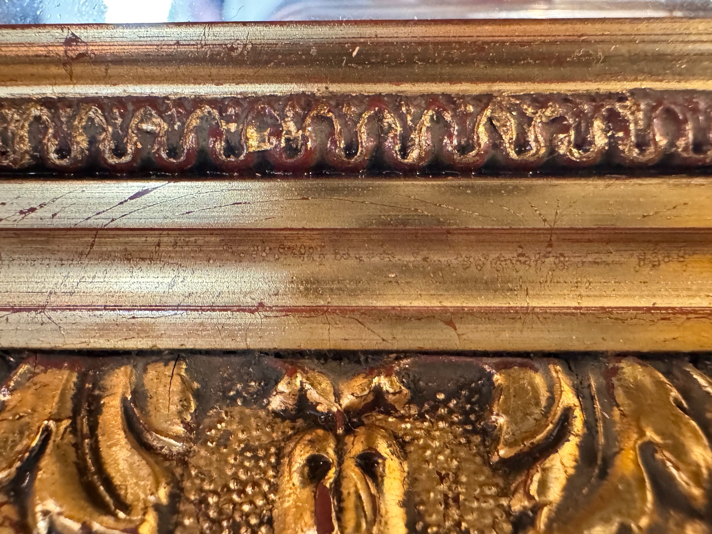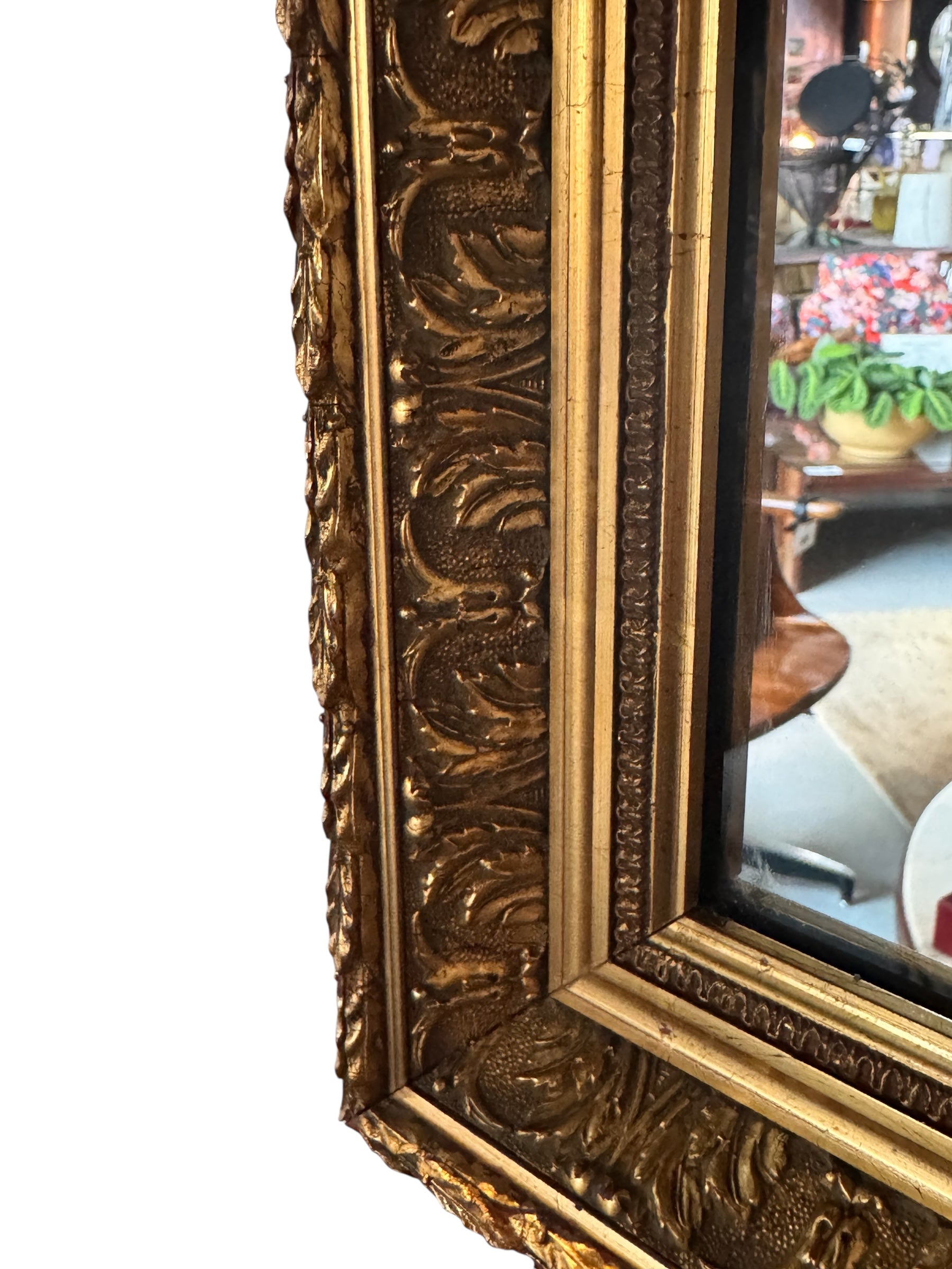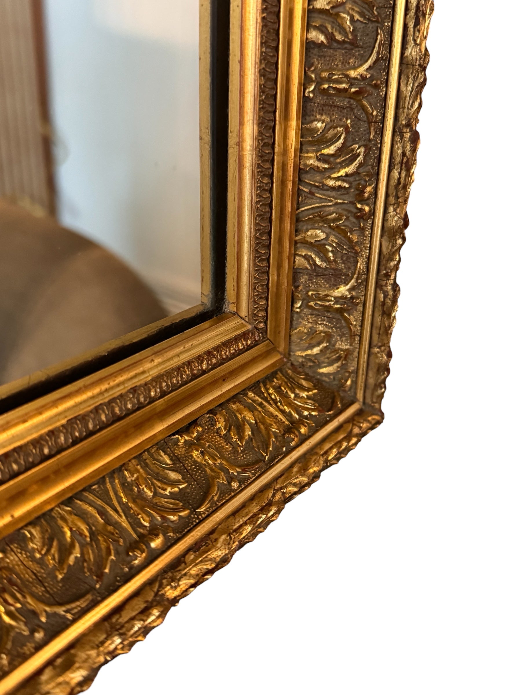 French gilt mirror with ornate frame and timeless elegance. Classic antique style with warm gold finish, excellent condition.