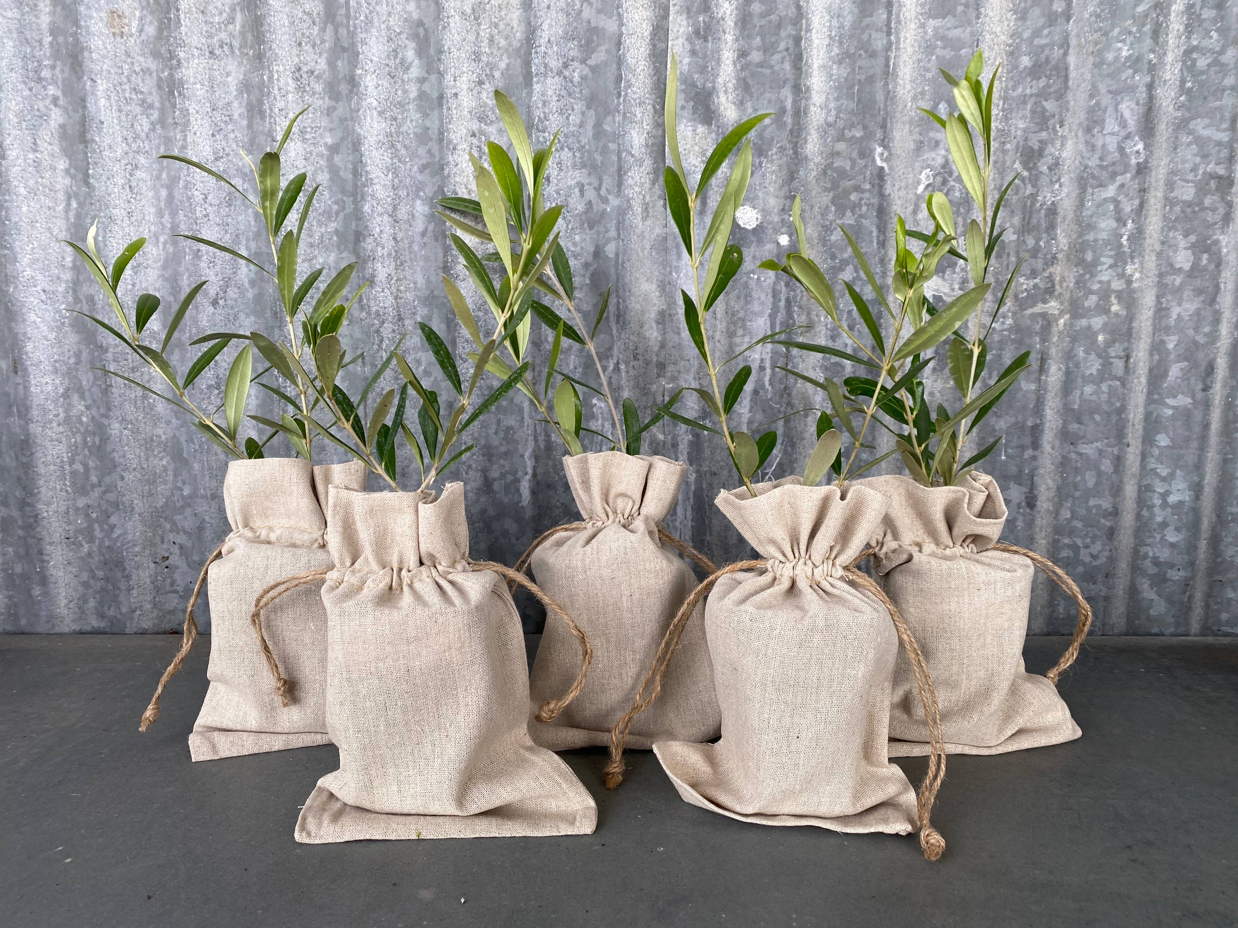 Bring the ancient allure of the Mediterranean grove into your interior space with this exquisite botanical accent. A study in organic simplicity, each young olive tree arrives rooted in rustic elegance, enveloped in a textural, natural linen sack with jute drawstring detailing. Standing approximately 12 to 18 inches tall within a 3-inch nursery pot, the delicate, silvery-green foliage contrasts beautifully with the tactile warmth of its unbleached canvas vessel. This versatile living art is designed to adapt to your lifestyle; it may remain in its current vessel for several months or can be transplanted into a larger pot or directly into the ground to encourage further growth.