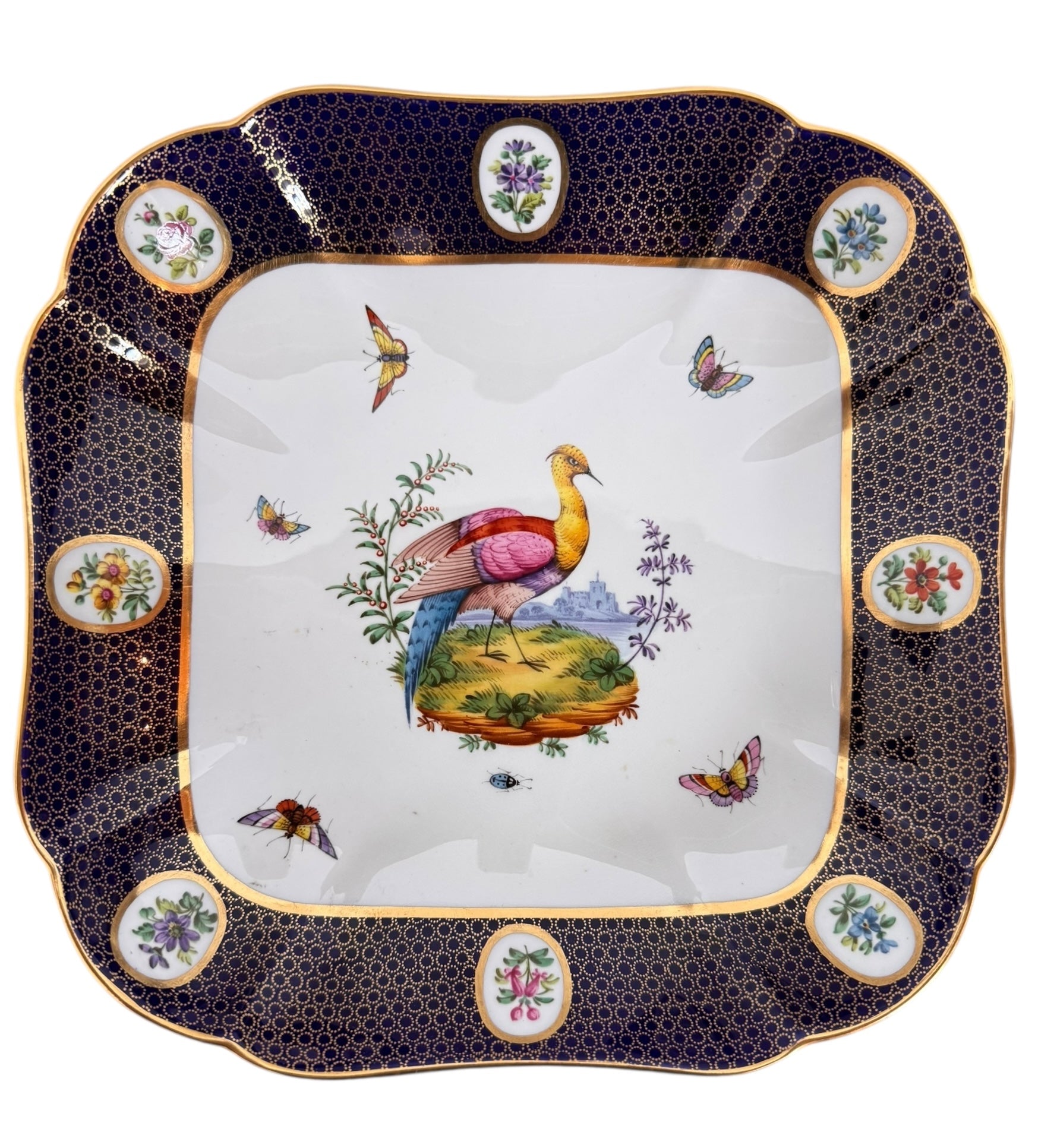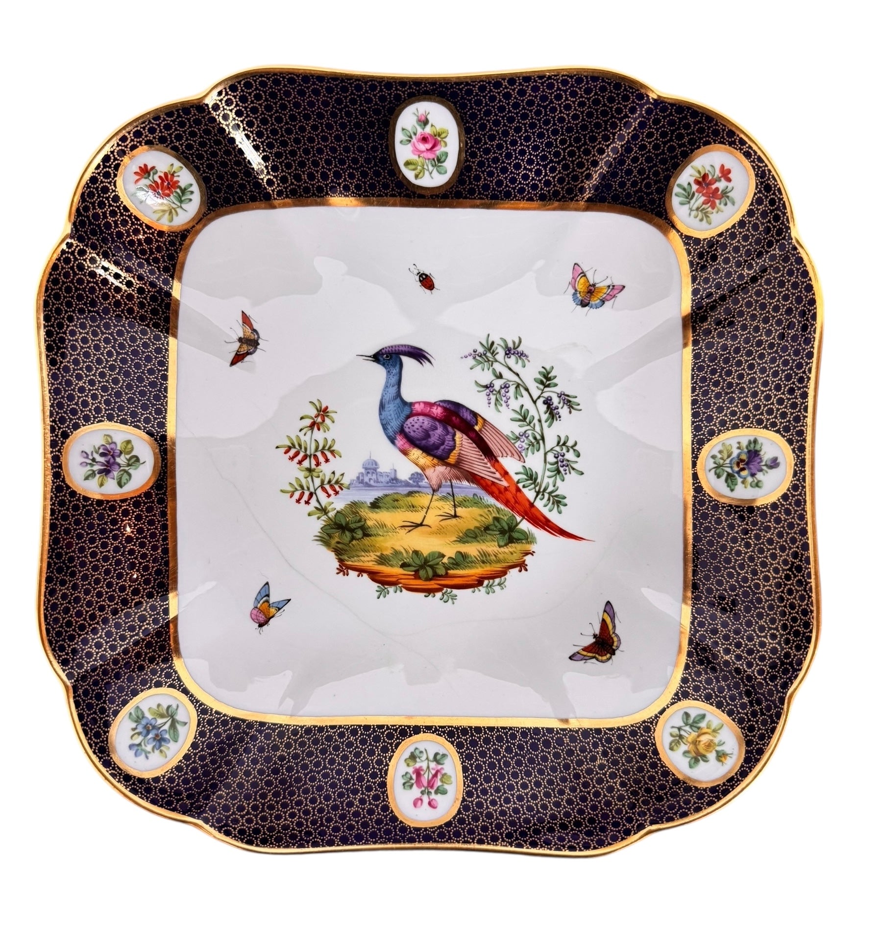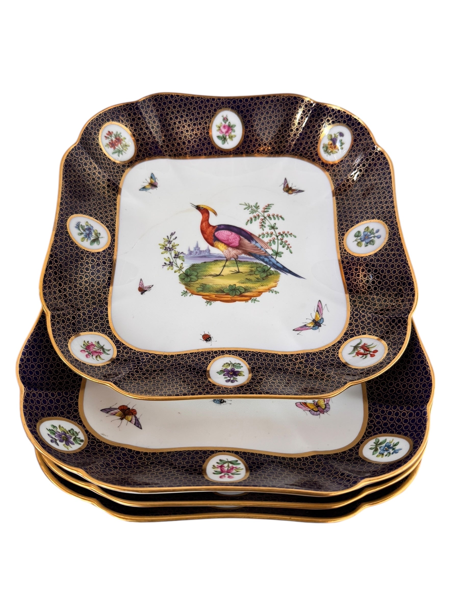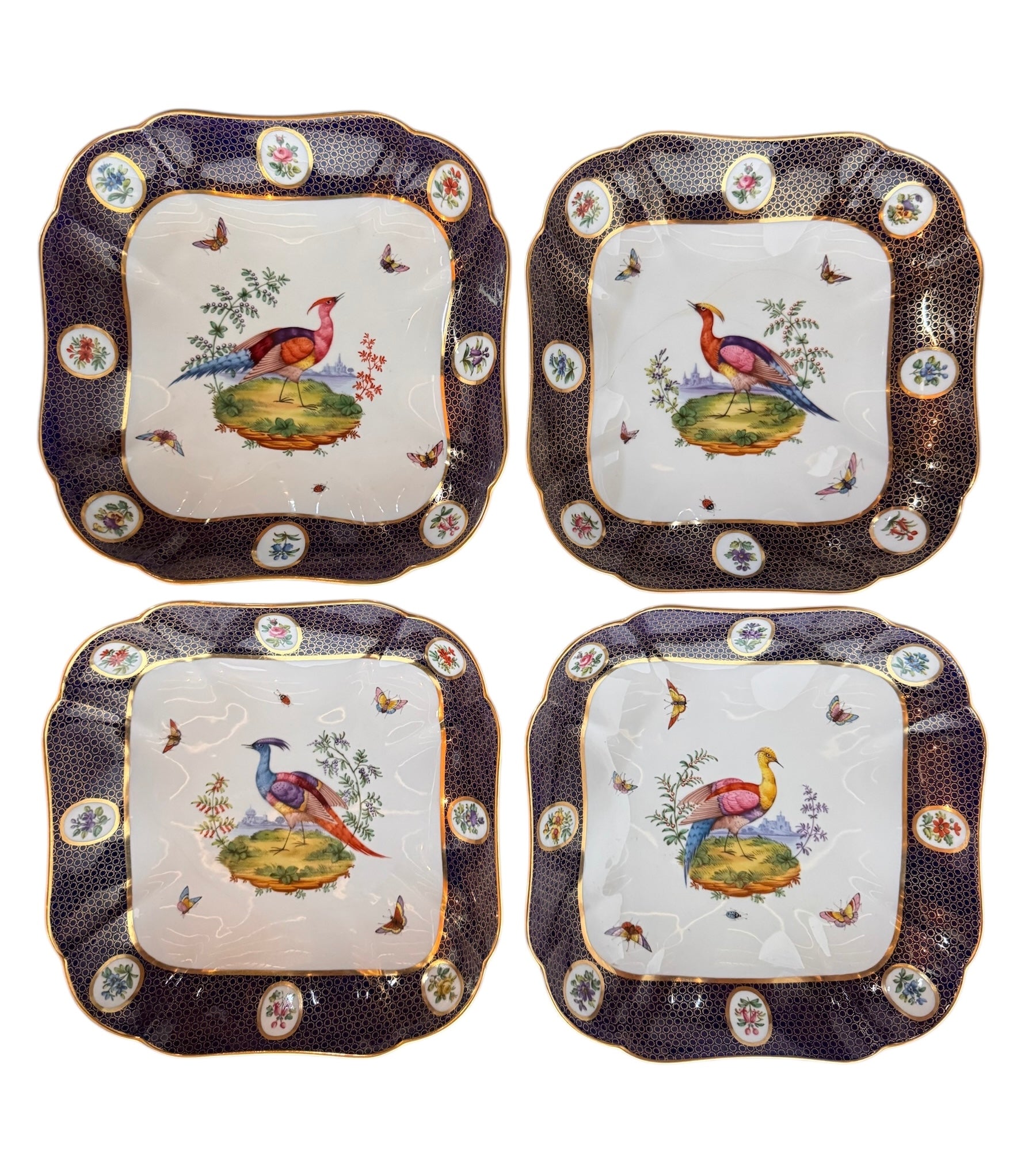 This magnificent quartet of English parcel-gilt porcelain square plates by Copeland Spode, originally retailed by the prestigious T. Goode & Co. of London, offers a captivating journey into porcelain artistry, showcasing a vibrant design, meticulous craftsmanship, and rich historical resonance. Each plate presents a unique and arresting hand-painted exotic bird, resplendent in vivid polychrome hues, set against a pristine white ground and often accompanied by delicate butterflies and insects that add a dynamic sense of life and movement. Framing these central vignettes is an opulent border of deep, rich cobalt blue, masterfully adorned with an intricate, hand-applied gilt scale-patterned design, interspersed with charming polychrome floral roundels and cartouches featuring miniature hand-painted butterflies, insects, and graceful floral garlands, all finished with an elegantly scalloped, gilded rim. These exquisite pieces are a celebrated reinterpretation of the famous "Mecklenburg Service," originally crafted by the renowned Chelsea porcelain factory around 1763 for King George III. Crafted by the esteemed Copeland Spode factory in Stoke-on-Trent, with a heritage dating back to 1770, these plates bear the "SPODE COPELAND'S CHINA ENGLAND" manufacturer's mark and the overglaze "T. GOODE & C LONDON" retailer's mark, signifying their production for a high-end luxury market, likely between 1900 and 1920. Spode ceramics are globally recognized for their superior quality and collectibility, and the blend of hand-painted uniqueness, intricate gilding, and a direct connection to an iconic historical design makes this set an exceptionally desirable acquisition for connoisseurs and collectors alike, adding an unparalleled touch of historical elegance and decorative splendor, with one plate exhibiting a stable hairline extending from near the edge to the center, a testament to its storied past.