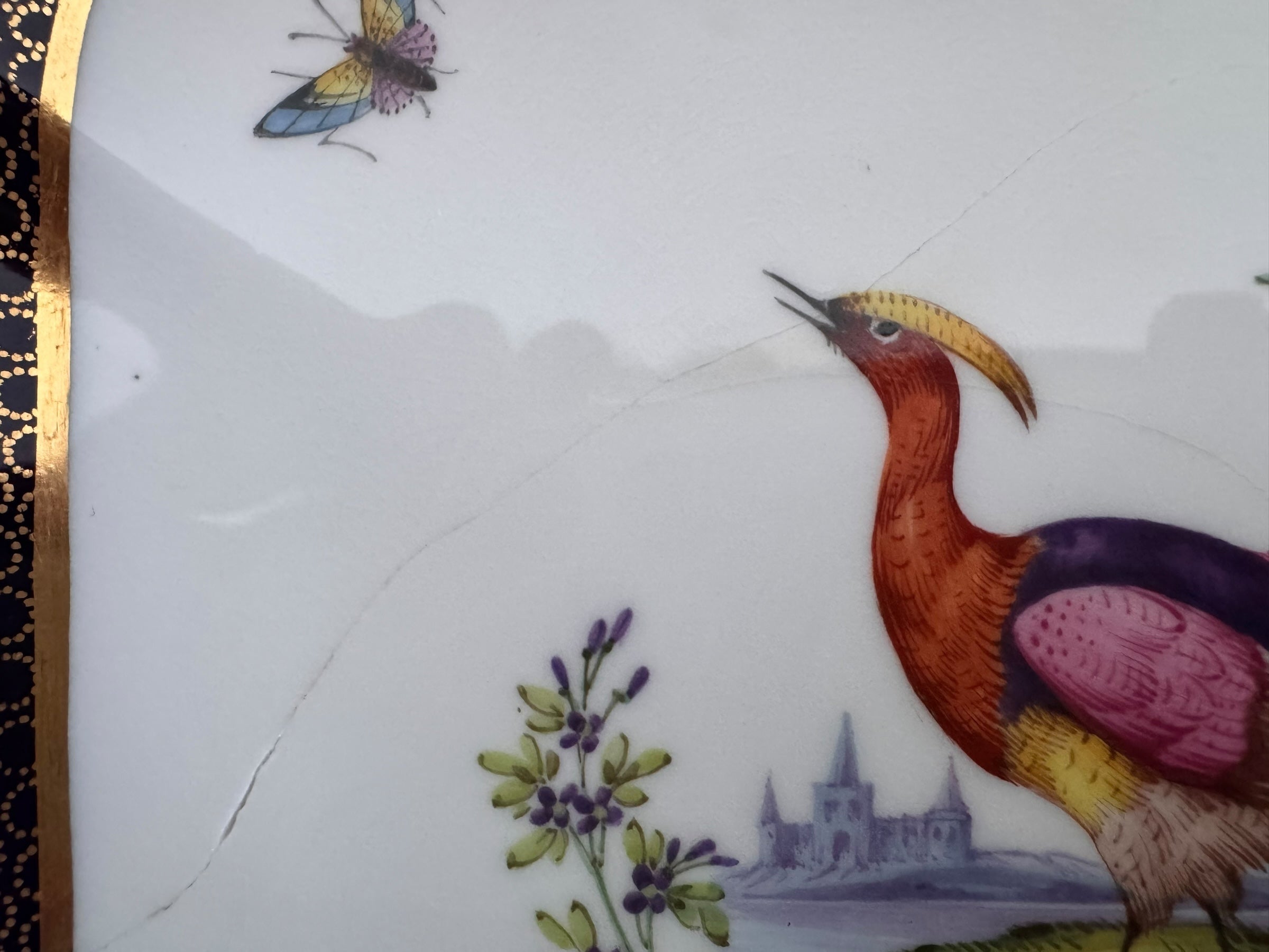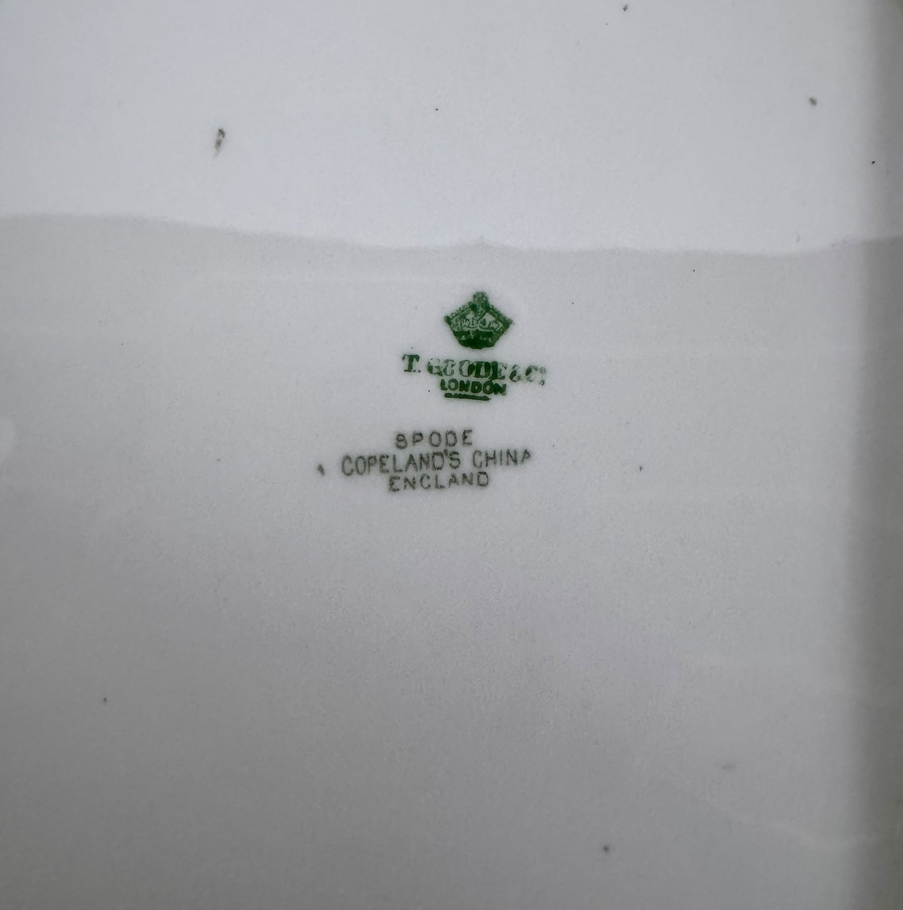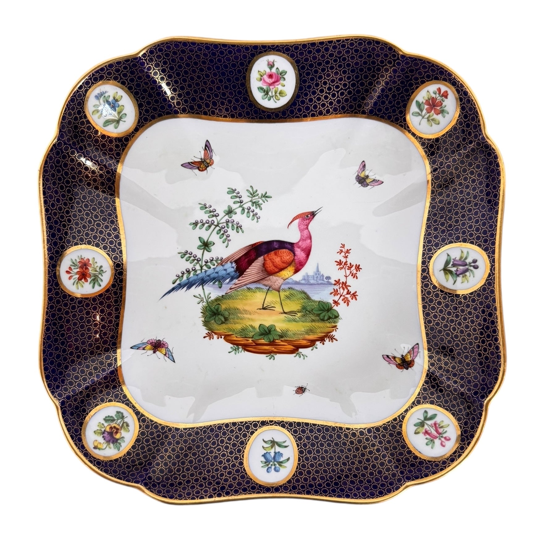 This magnificent quartet of English parcel-gilt porcelain square plates by Copeland Spode, originally retailed by the prestigious T. Goode & Co. of London, offers a captivating journey into porcelain artistry, showcasing a vibrant design, meticulous craftsmanship, and rich historical resonance. Each plate presents a unique and arresting hand-painted exotic bird, resplendent in vivid polychrome hues, set against a pristine white ground and often accompanied by delicate butterflies and insects that add a dynamic sense of life and movement. Framing these central vignettes is an opulent border of deep, rich cobalt blue, masterfully adorned with an intricate, hand-applied gilt scale-patterned design, interspersed with charming polychrome floral roundels and cartouches featuring miniature hand-painted butterflies, insects, and graceful floral garlands, all finished with an elegantly scalloped, gilded rim. These exquisite pieces are a celebrated reinterpretation of the famous "Mecklenburg Service," originally crafted by the renowned Chelsea porcelain factory around 1763 for King George III. Crafted by the esteemed Copeland Spode factory in Stoke-on-Trent, with a heritage dating back to 1770, these plates bear the "SPODE COPELAND'S CHINA ENGLAND" manufacturer's mark and the overglaze "T. GOODE & C LONDON" retailer's mark, signifying their production for a high-end luxury market, likely between 1900 and 1920. Spode ceramics are globally recognized for their superior quality and collectibility, and the blend of hand-painted uniqueness, intricate gilding, and a direct connection to an iconic historical design makes this set an exceptionally desirable acquisition for connoisseurs and collectors alike, adding an unparalleled touch of historical elegance and decorative splendor, with one plate exhibiting a stable hairline extending from near the edge to the center, a testament to its storied past.