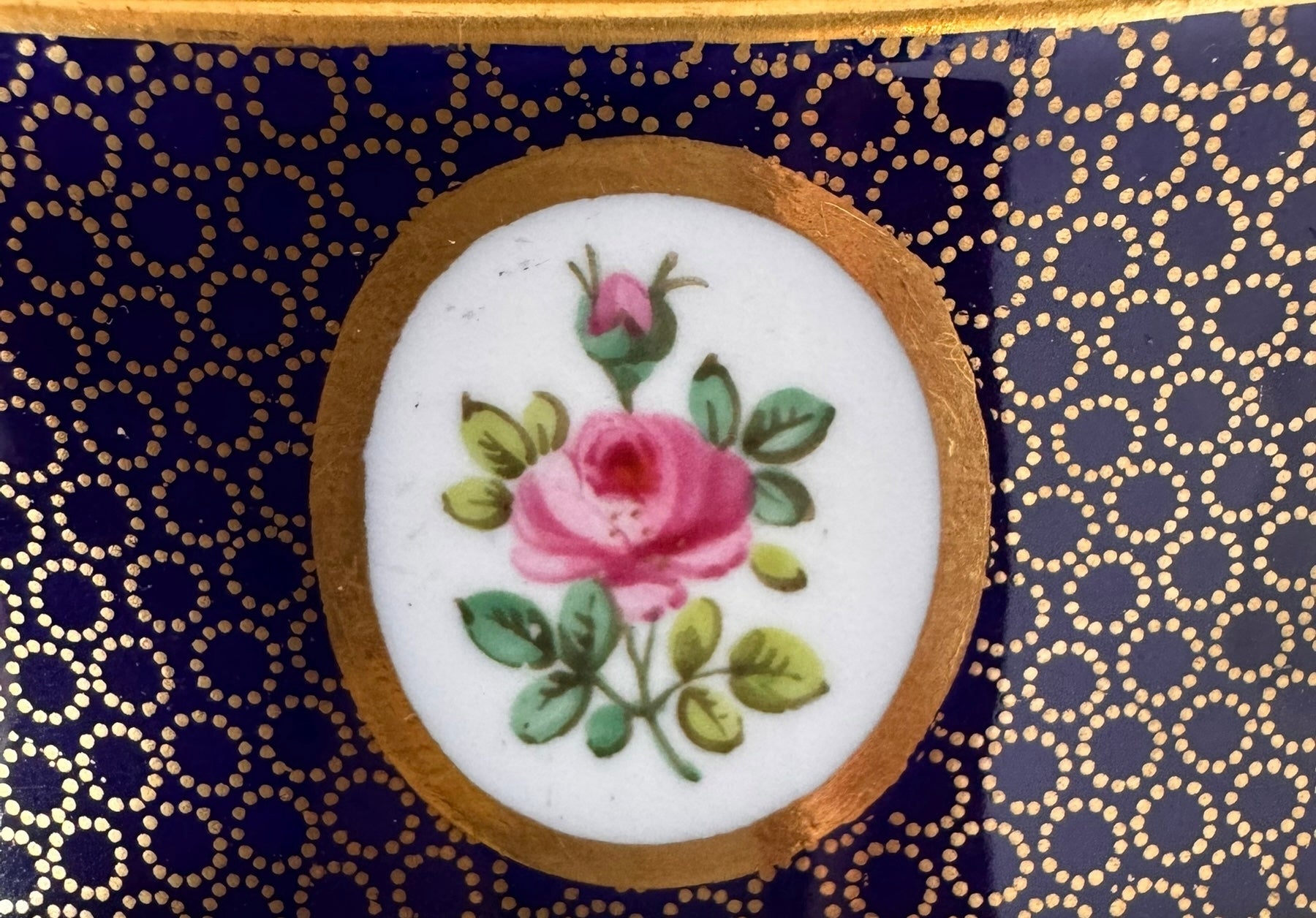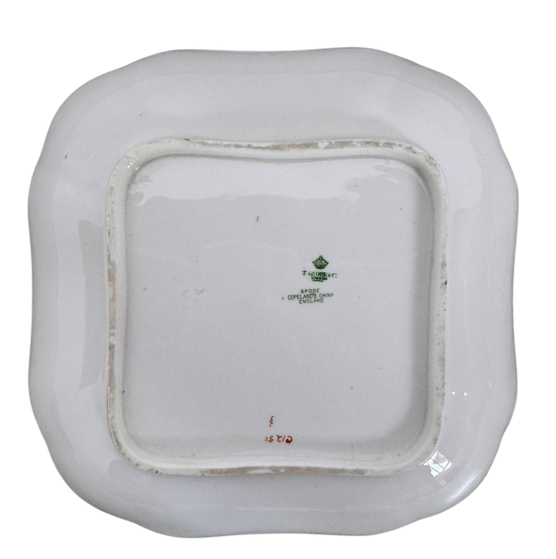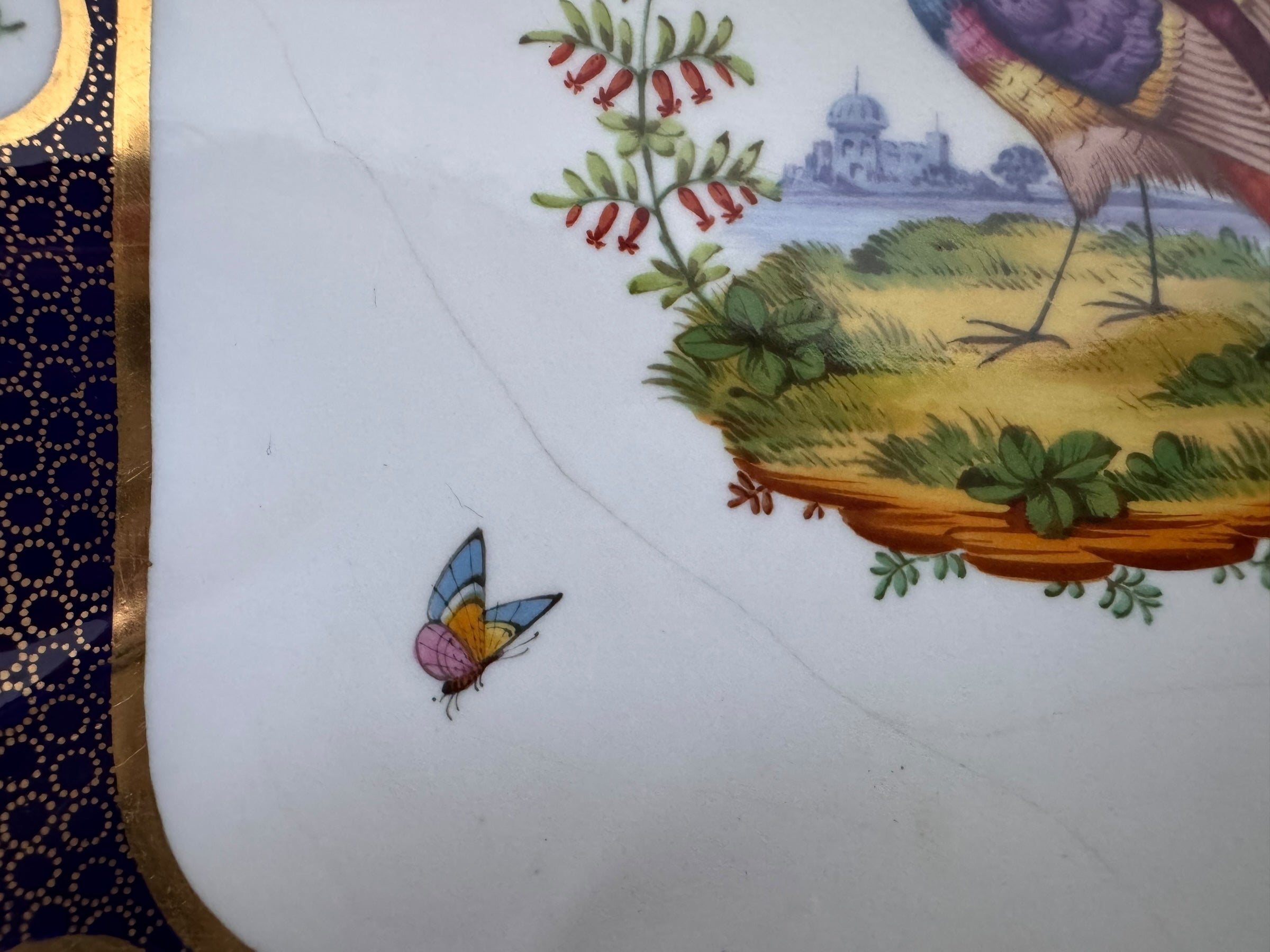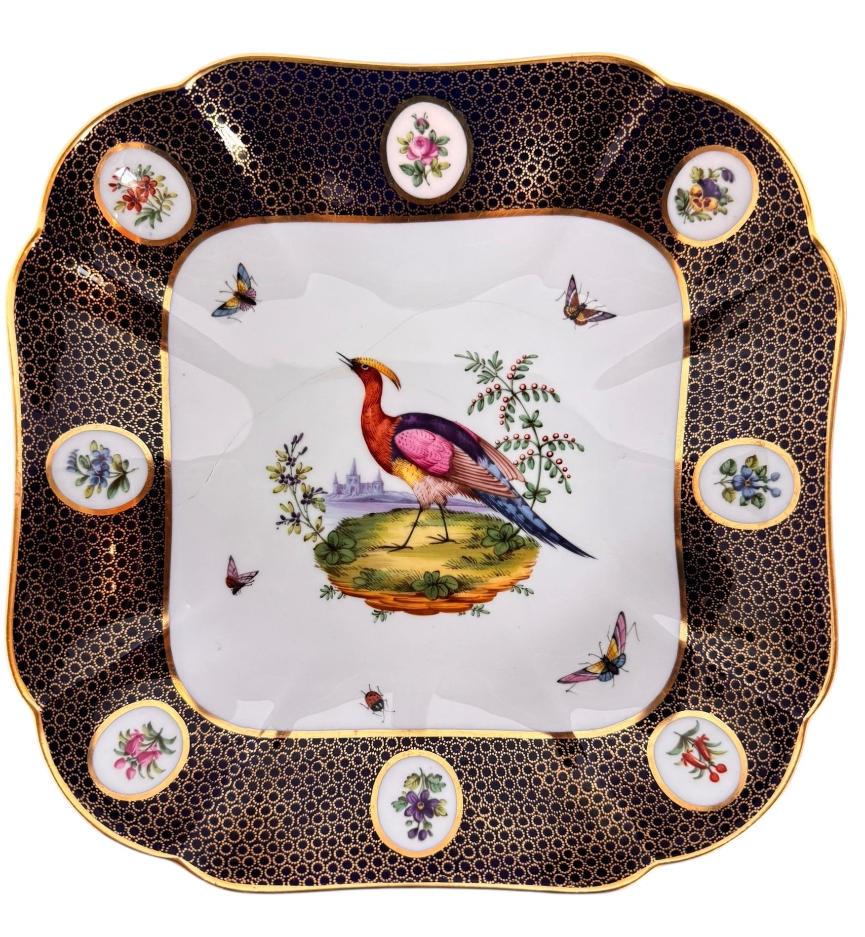 This magnificent quartet of English parcel-gilt porcelain square plates by Copeland Spode, originally retailed by the prestigious T. Goode & Co. of London, offers a captivating journey into porcelain artistry, showcasing a vibrant design, meticulous craftsmanship, and rich historical resonance. Each plate presents a unique and arresting hand-painted exotic bird, resplendent in vivid polychrome hues, set against a pristine white ground and often accompanied by delicate butterflies and insects that add a dynamic sense of life and movement. Framing these central vignettes is an opulent border of deep, rich cobalt blue, masterfully adorned with an intricate, hand-applied gilt scale-patterned design, interspersed with charming polychrome floral roundels and cartouches featuring miniature hand-painted butterflies, insects, and graceful floral garlands, all finished with an elegantly scalloped, gilded rim. These exquisite pieces are a celebrated reinterpretation of the famous "Mecklenburg Service," originally crafted by the renowned Chelsea porcelain factory around 1763 for King George III. Crafted by the esteemed Copeland Spode factory in Stoke-on-Trent, with a heritage dating back to 1770, these plates bear the "SPODE COPELAND'S CHINA ENGLAND" manufacturer's mark and the overglaze "T. GOODE & C LONDON" retailer's mark, signifying their production for a high-end luxury market, likely between 1900 and 1920. Spode ceramics are globally recognized for their superior quality and collectibility, and the blend of hand-painted uniqueness, intricate gilding, and a direct connection to an iconic historical design makes this set an exceptionally desirable acquisition for connoisseurs and collectors alike, adding an unparalleled touch of historical elegance and decorative splendor, with one plate exhibiting a stable hairline extending from near the edge to the center, a testament to its storied past.