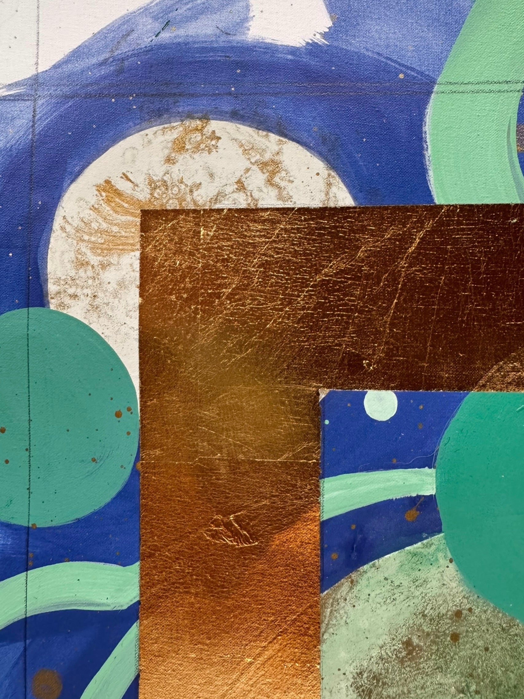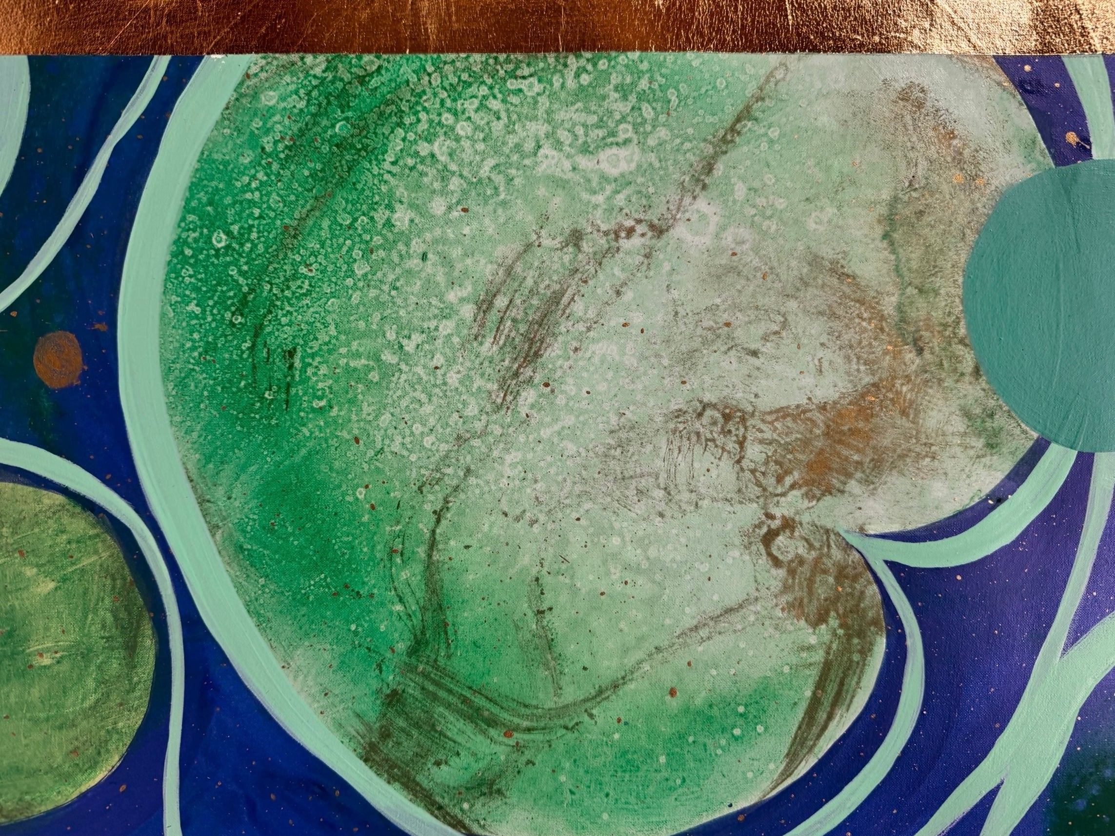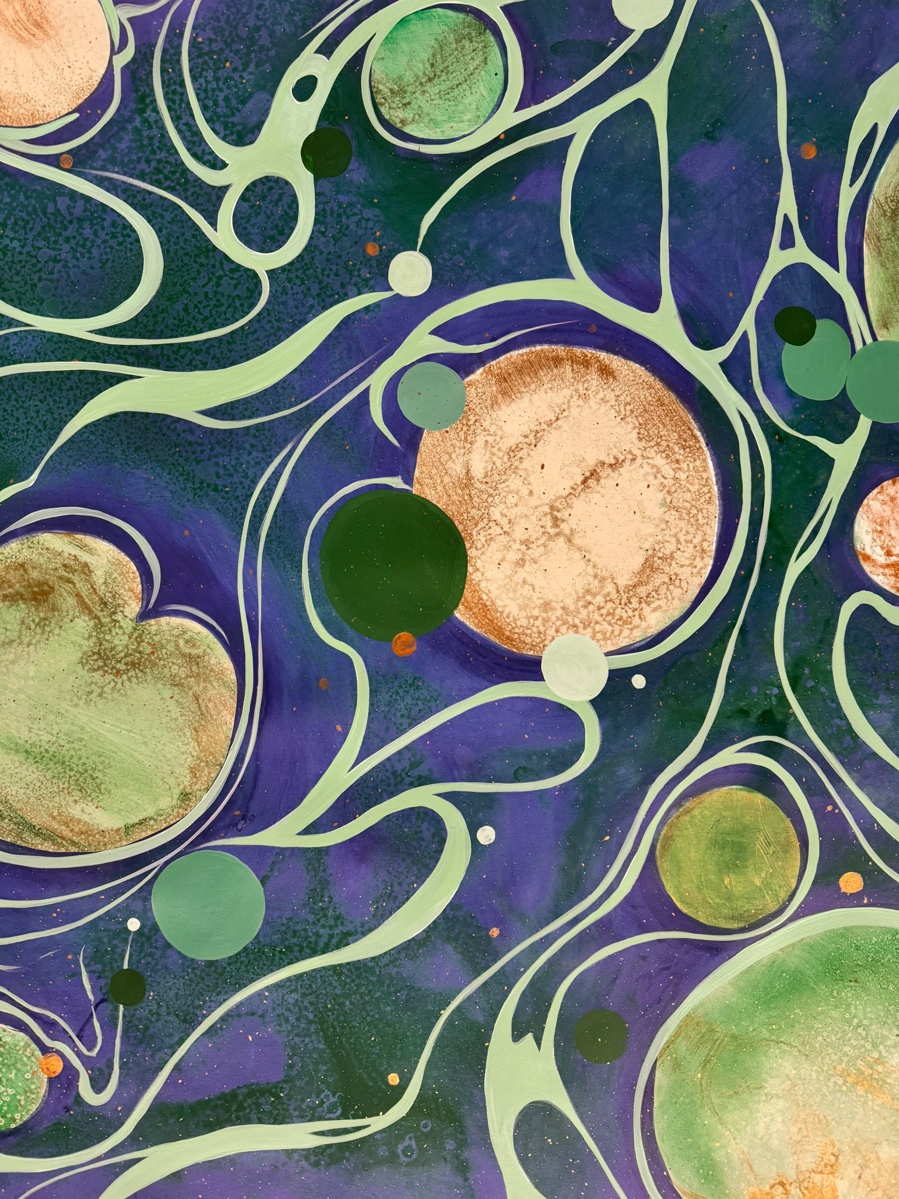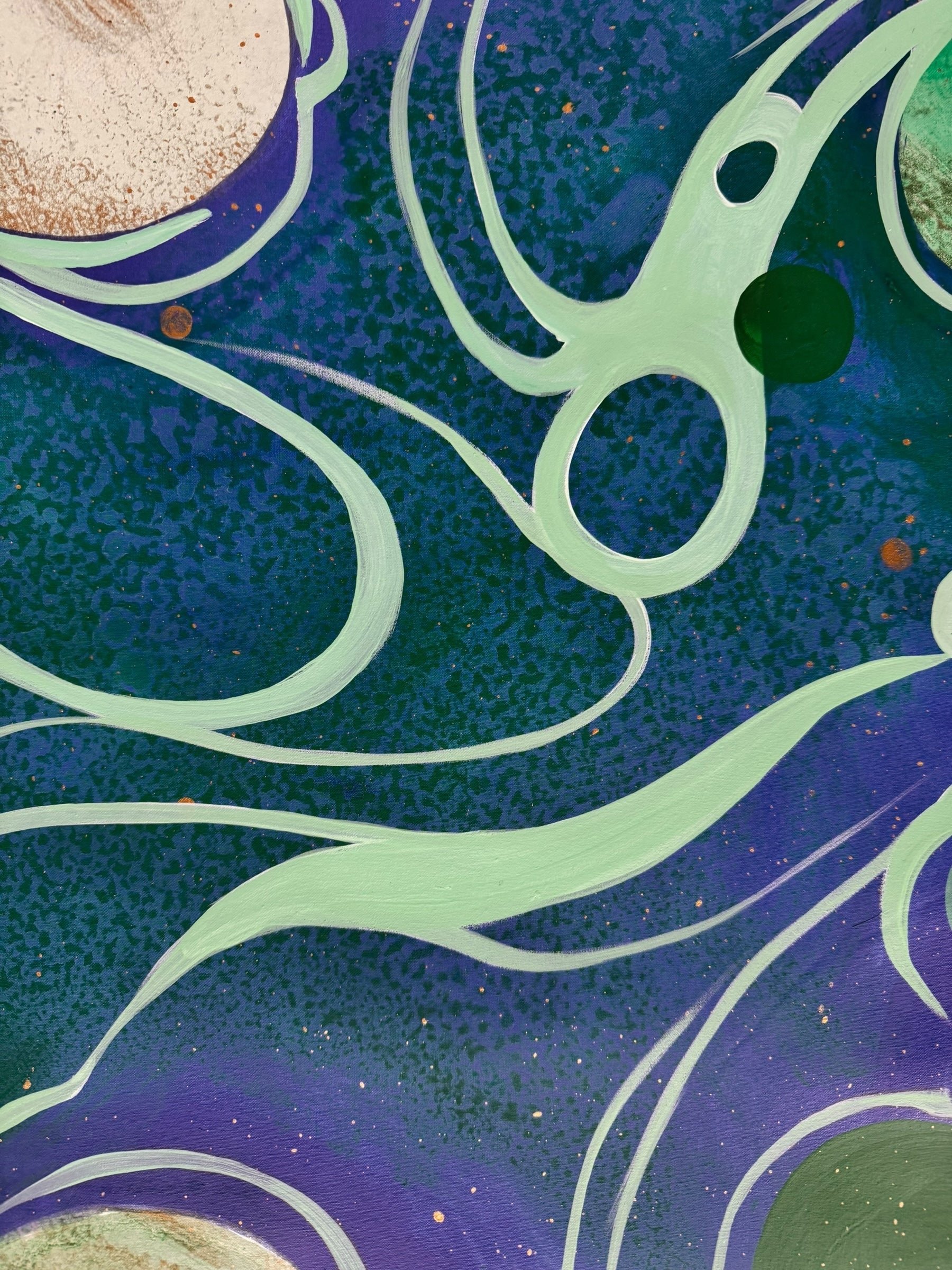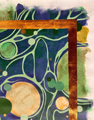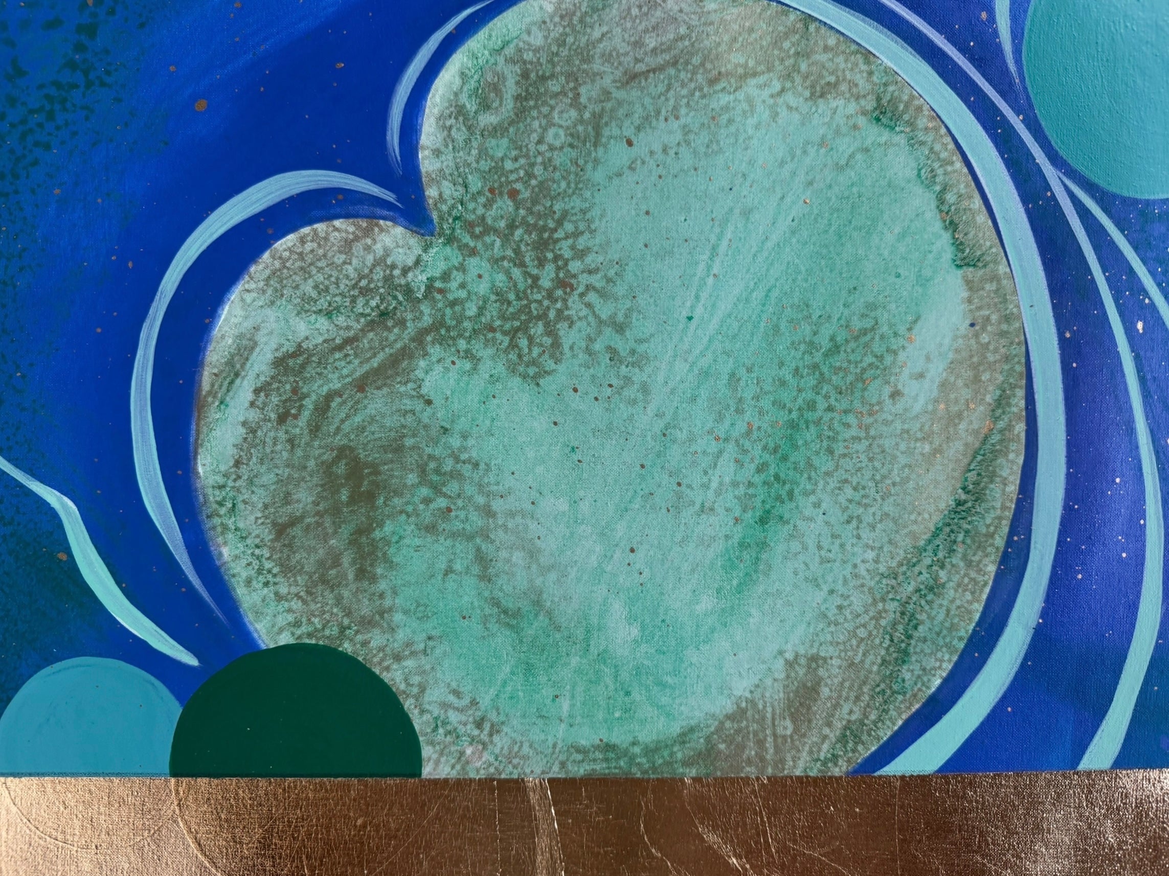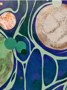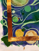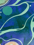 In this vibrant new work, San Francisco decorative artist Caroline Lizarraga invites viewers into a cosmos of her own making. Moving away from purely atmospheric studies, this piece embraces a dynamic, kinetic energy, utilizing the fluidity of acrylics to create a swirling topography of deep indigos, sea foams, and terrestrial greens.