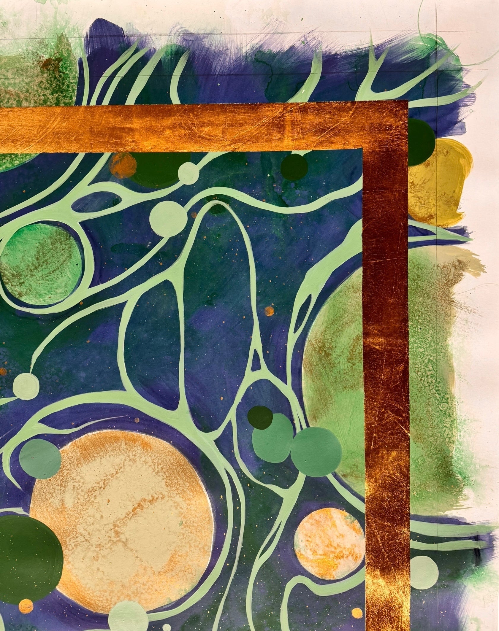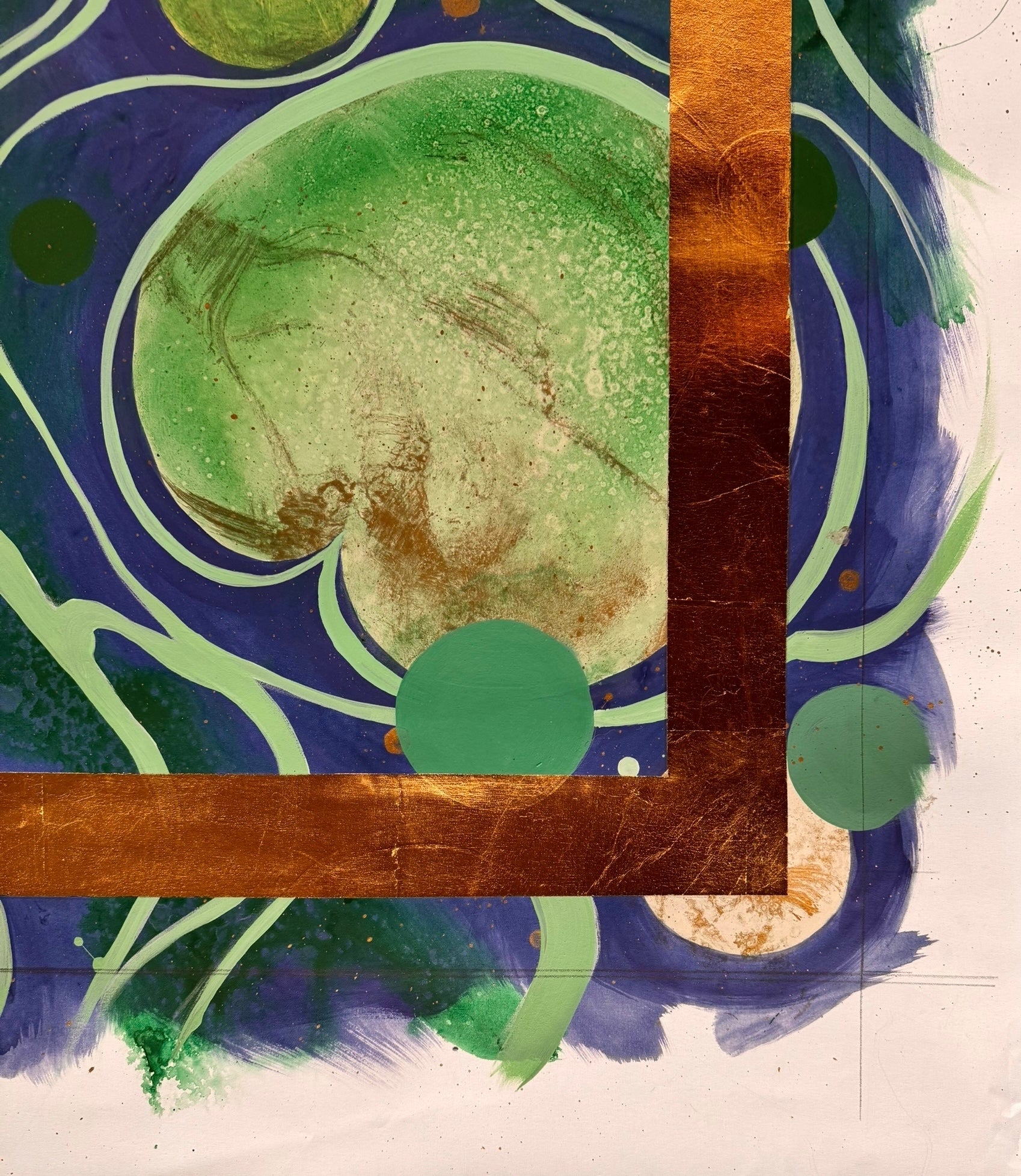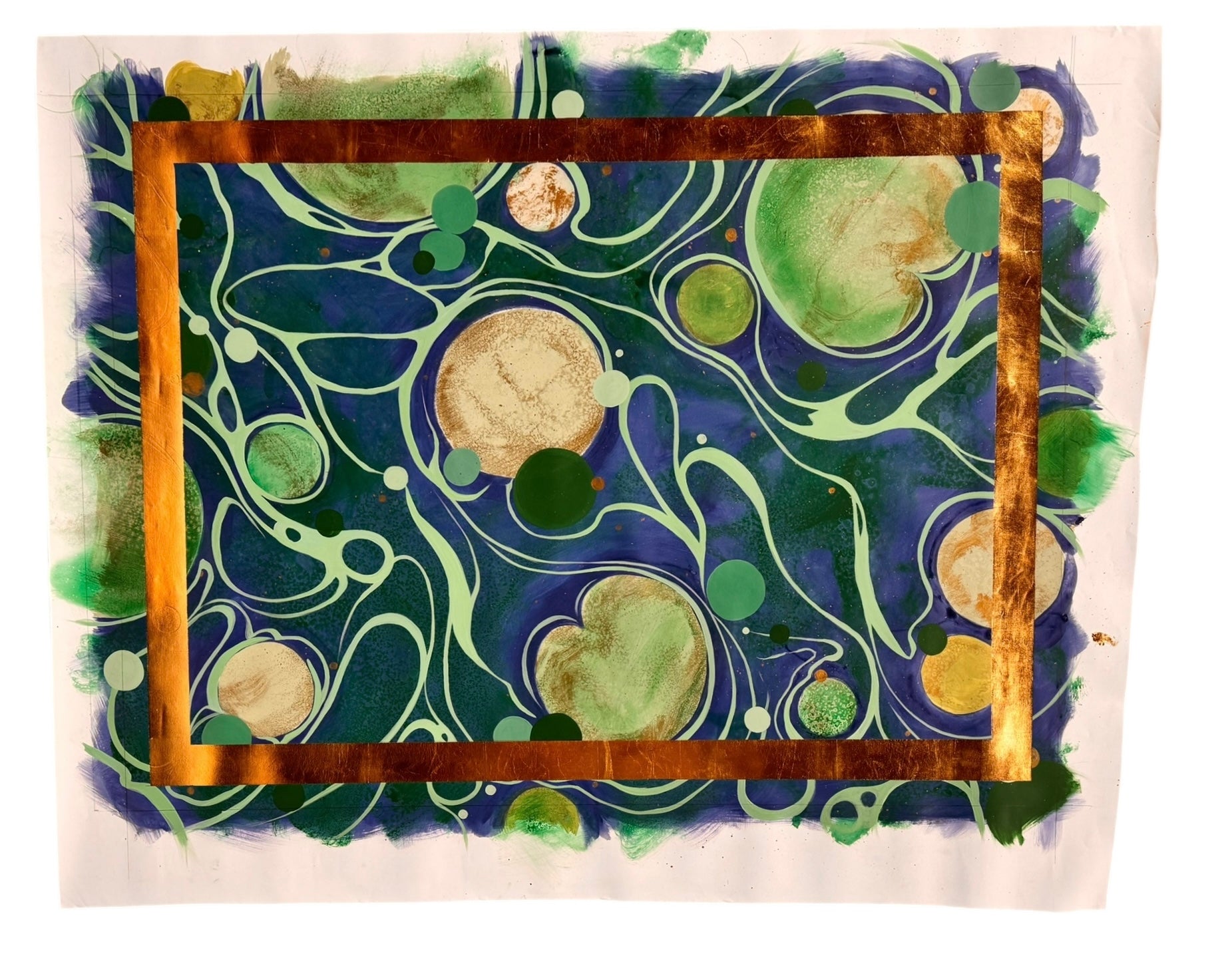 A defining feature of this work is the bold application of a rectilinear gold leaf border. The metallic leaf acts as a structural anchor, reflecting light and contrasting sharply with the matte and gloss interplay of the paint. While the gold frames the central chaos with architectural precision, the artist has deliberately left the work "uncut," allowing the pigment to spill past the gilded edge onto the raw paper. This choice exposes the process—the drips, the grid lines, and the creative energy extending beyond the boundary. It transforms the work from a static image into an immersive object, offering the viewer a glimpse into the act of creation itself. Whether displayed in its current raw state or cropped for a traditional finish, the piece remains a powerful testament to Lizarraga’s ability to blend organic fluidity with structural elegance.