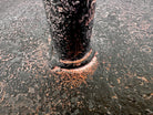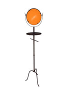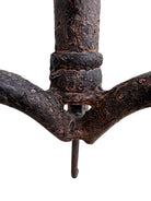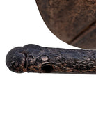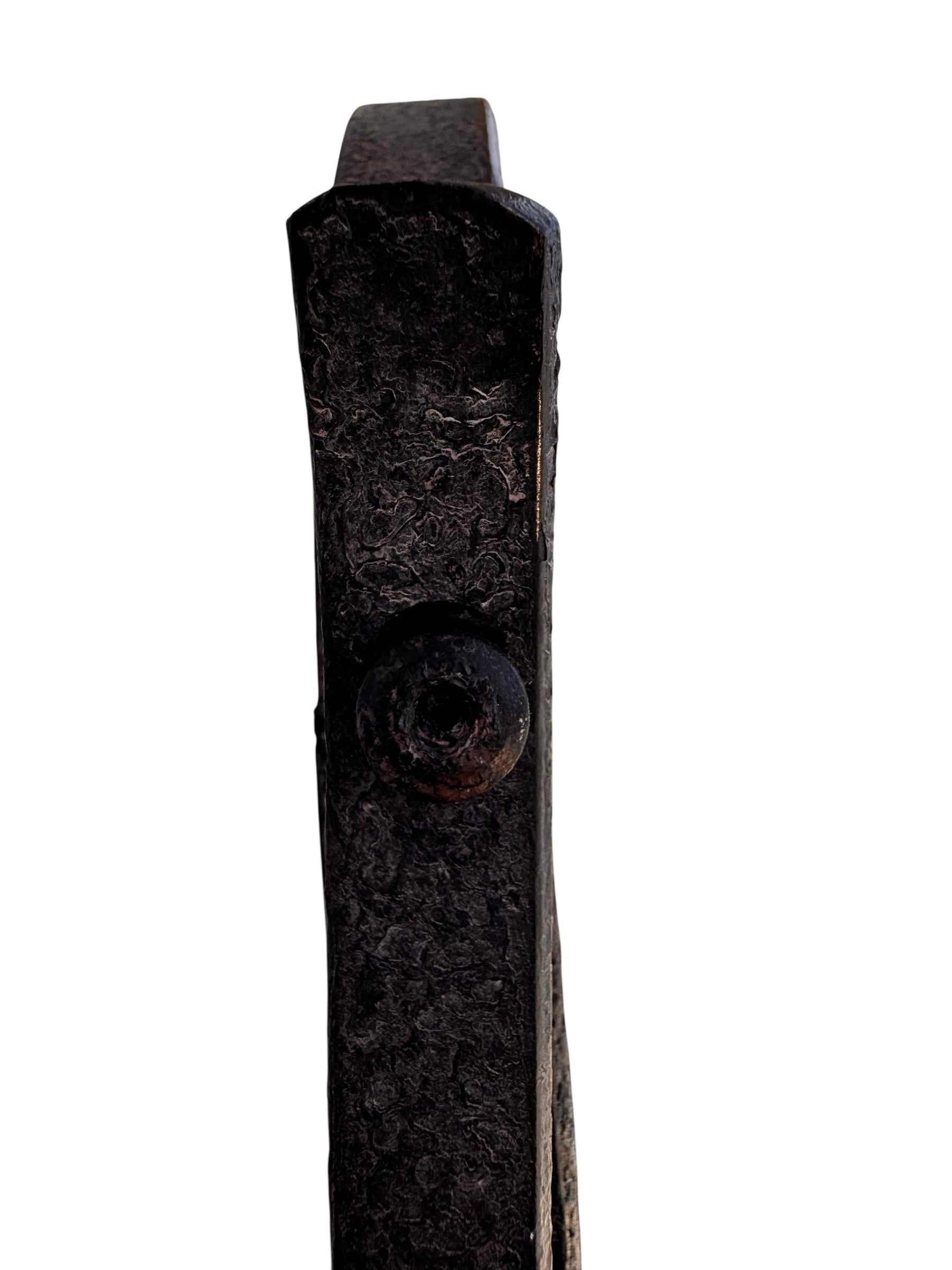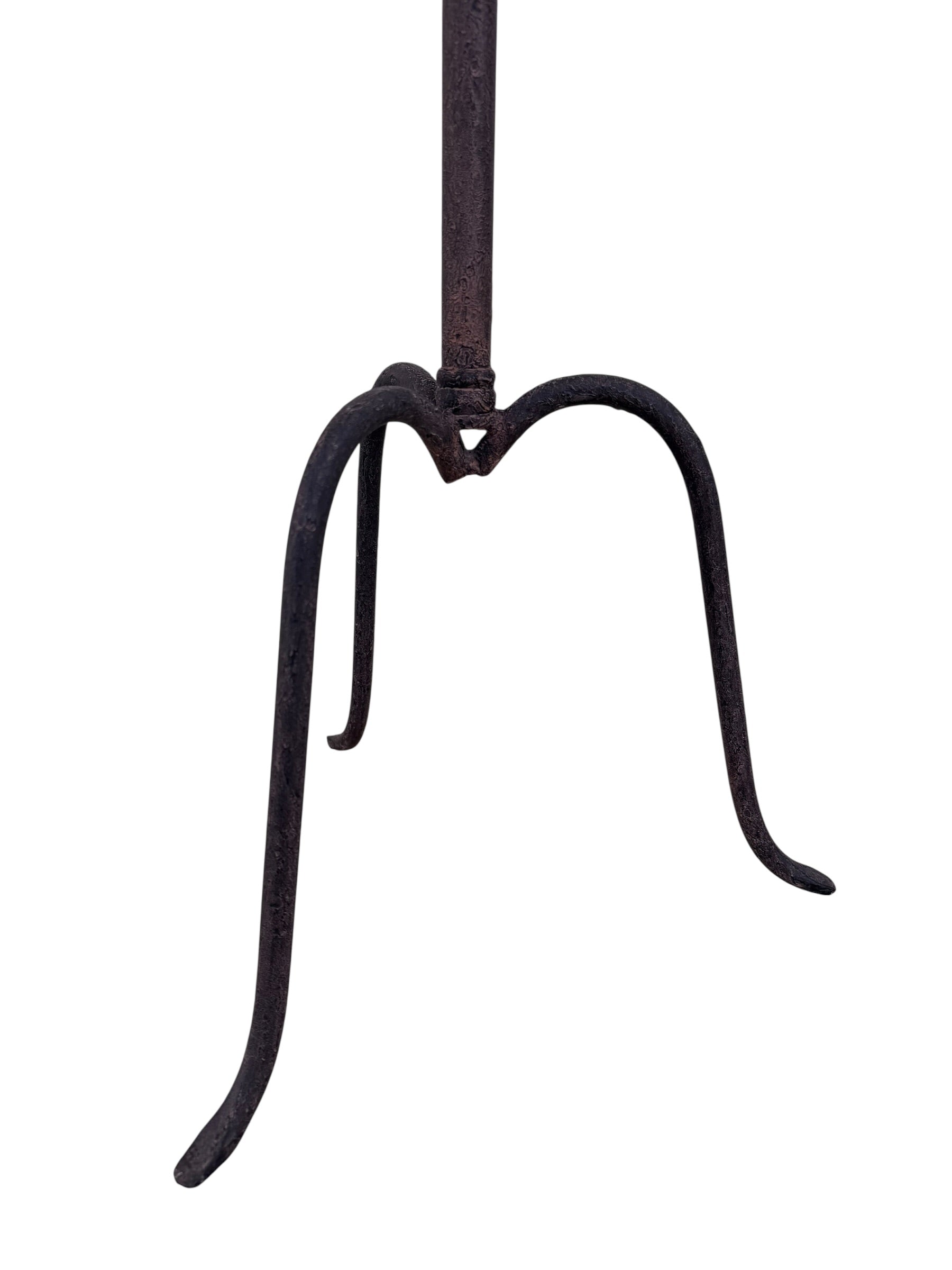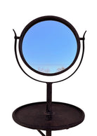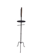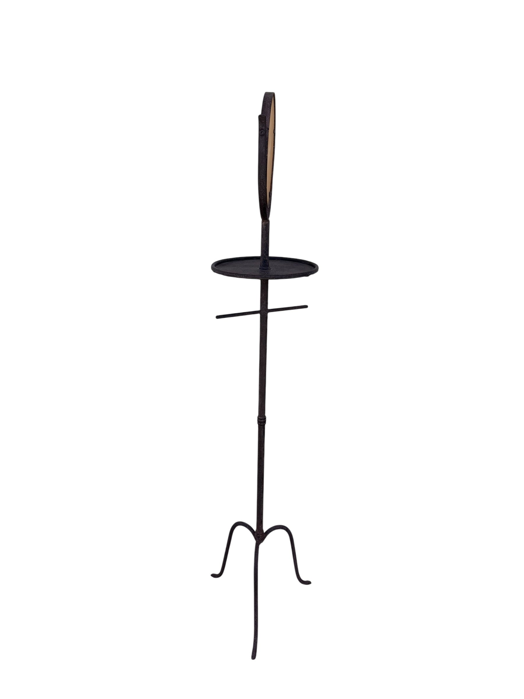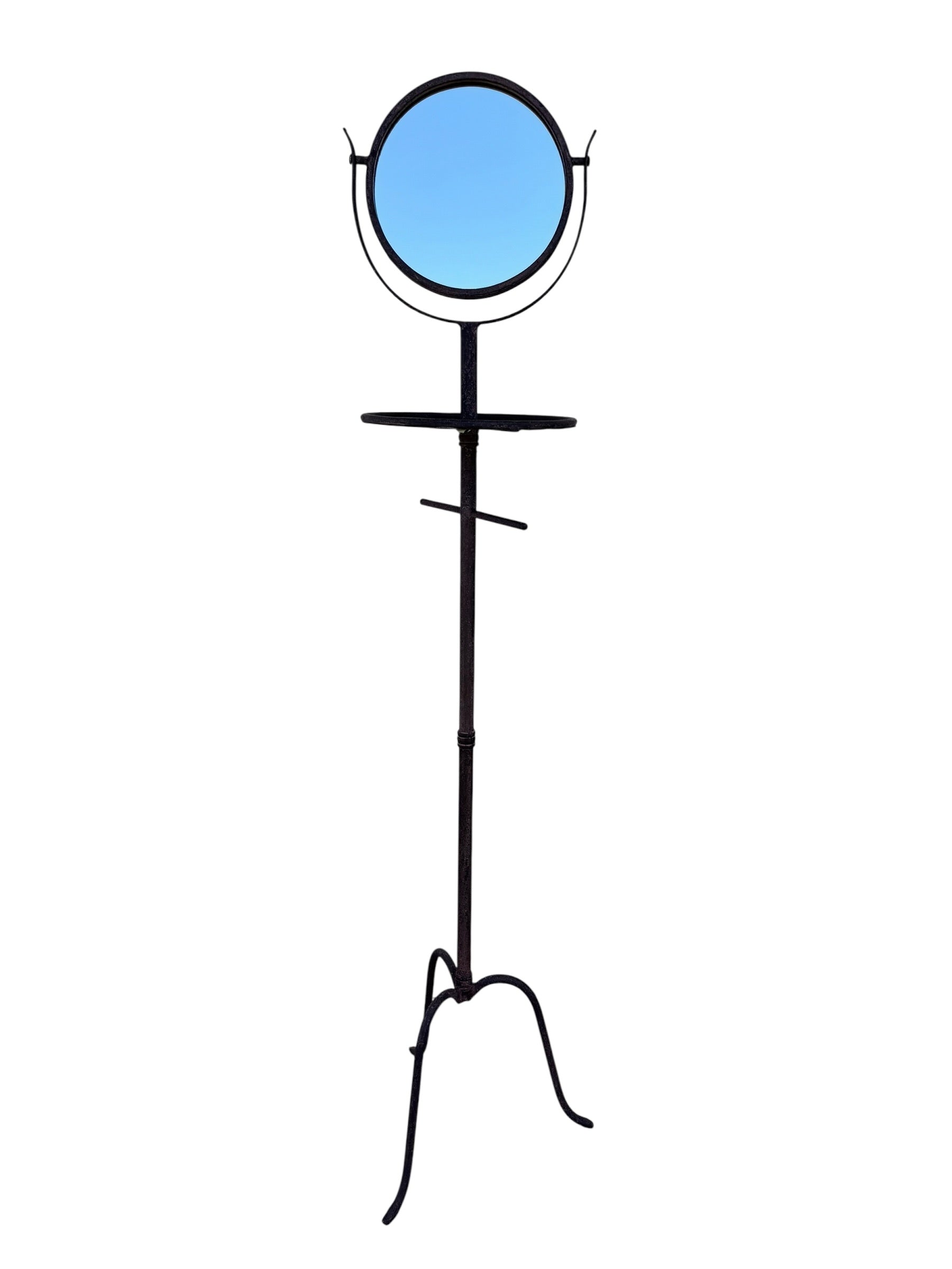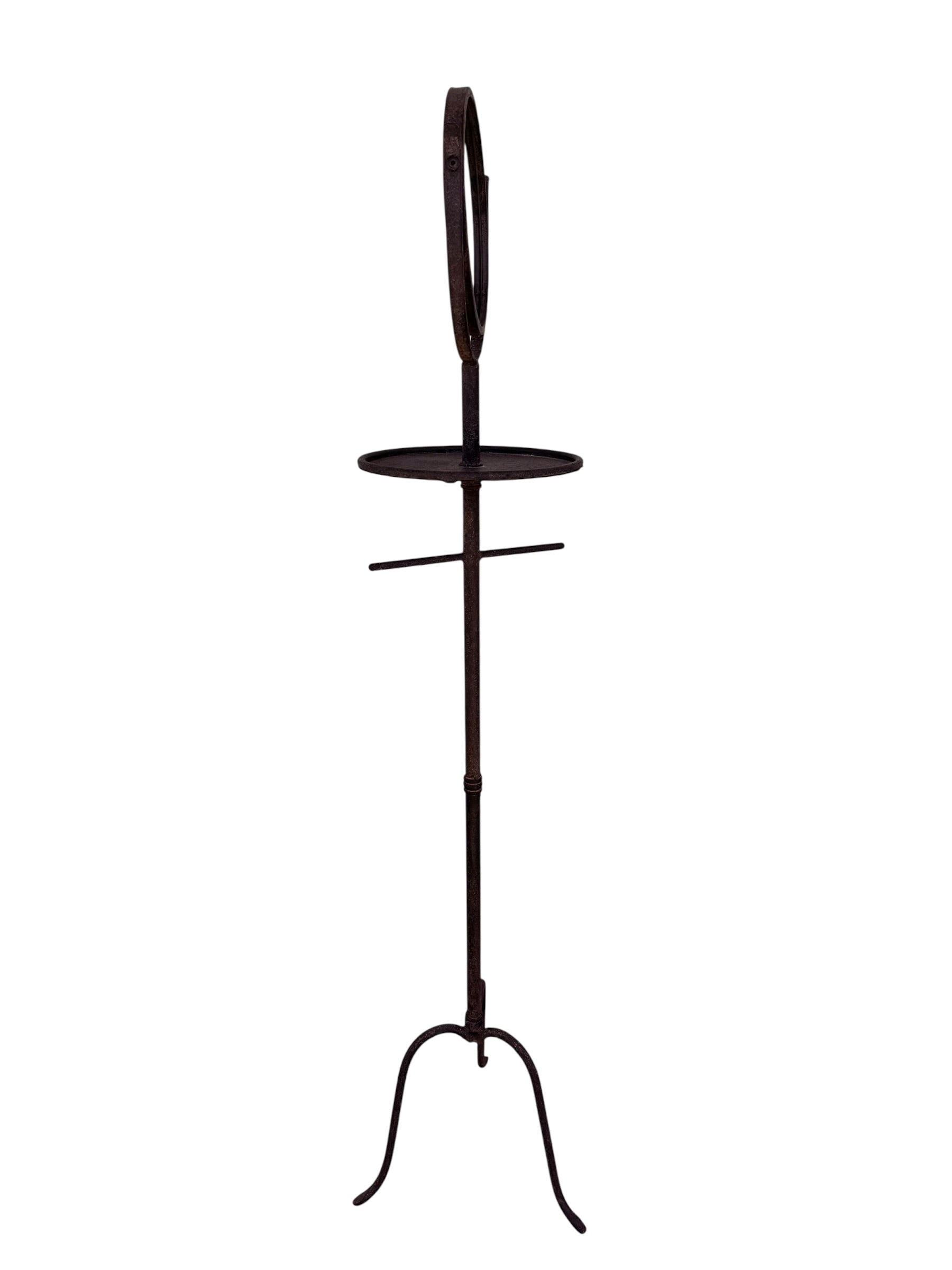 This early 2000s reproduction vanity stand serves as a sophisticated exercise in industrial romanticism, merging the utility of a traditional shaving station with the slender, gestural silhouette of modern sculptural metalwork. Forged from heavy iron, the piece is anchored by a tripod of out-swept cabriole legs that provide a grounded and deliberate footprint. Its vertical axis is punctuated by a central gallery tray and streamlined horizontal hooks, offering a minimalist solution for jewelry, linens, or daily essentials. The composition is crowned by a circular tilting mirror suspended within a graceful wishbone yoke, allowing for functional adjustment while maintaining a play on pure geometric form. A hand-applied patina softens the iron’s structural gravity, celebrating a weathered, artisanal character that allows this piece to transition effortlessly between a modern dressing suite and an eclectic entryway.