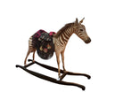 A whimsical taxidermy zebra mounted on a traditional carved wooden rocker. She sits perfectly in any situation! Burchell zebra, Equus quagga burchellii. In good vintage condition. Some bare areas retouched by professional taxidermist in Austin, TX.