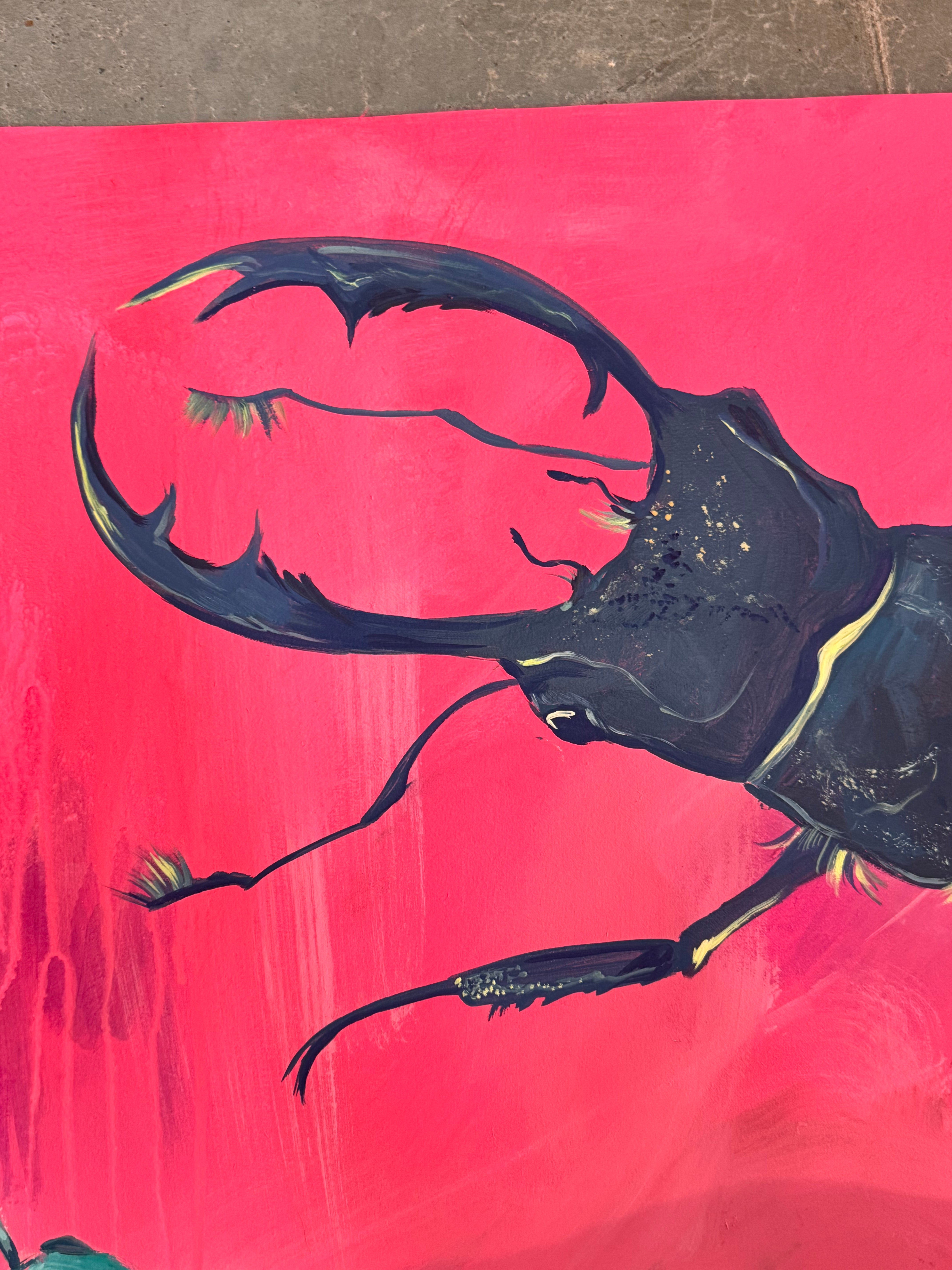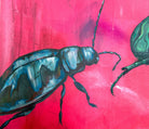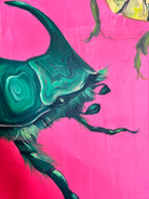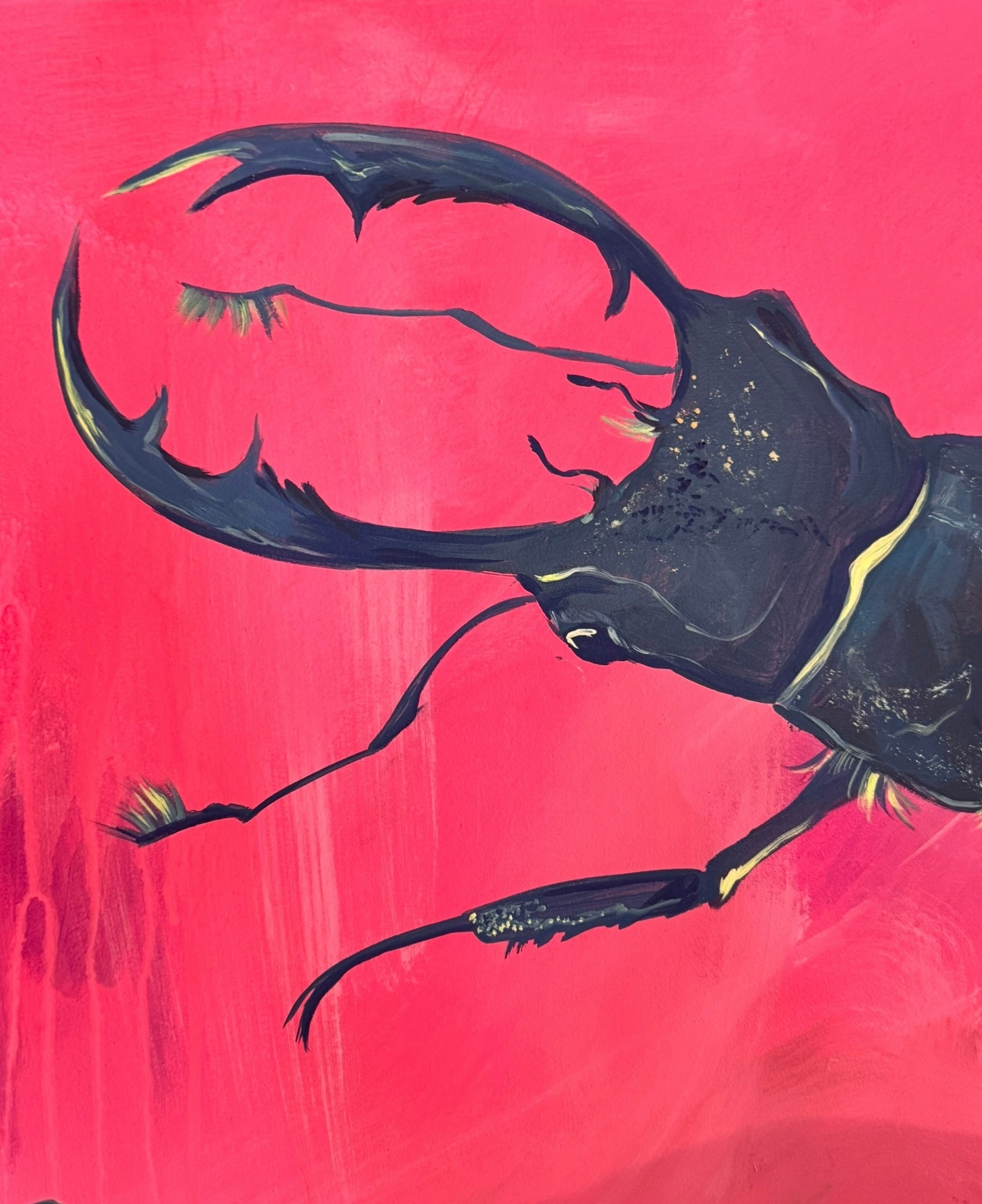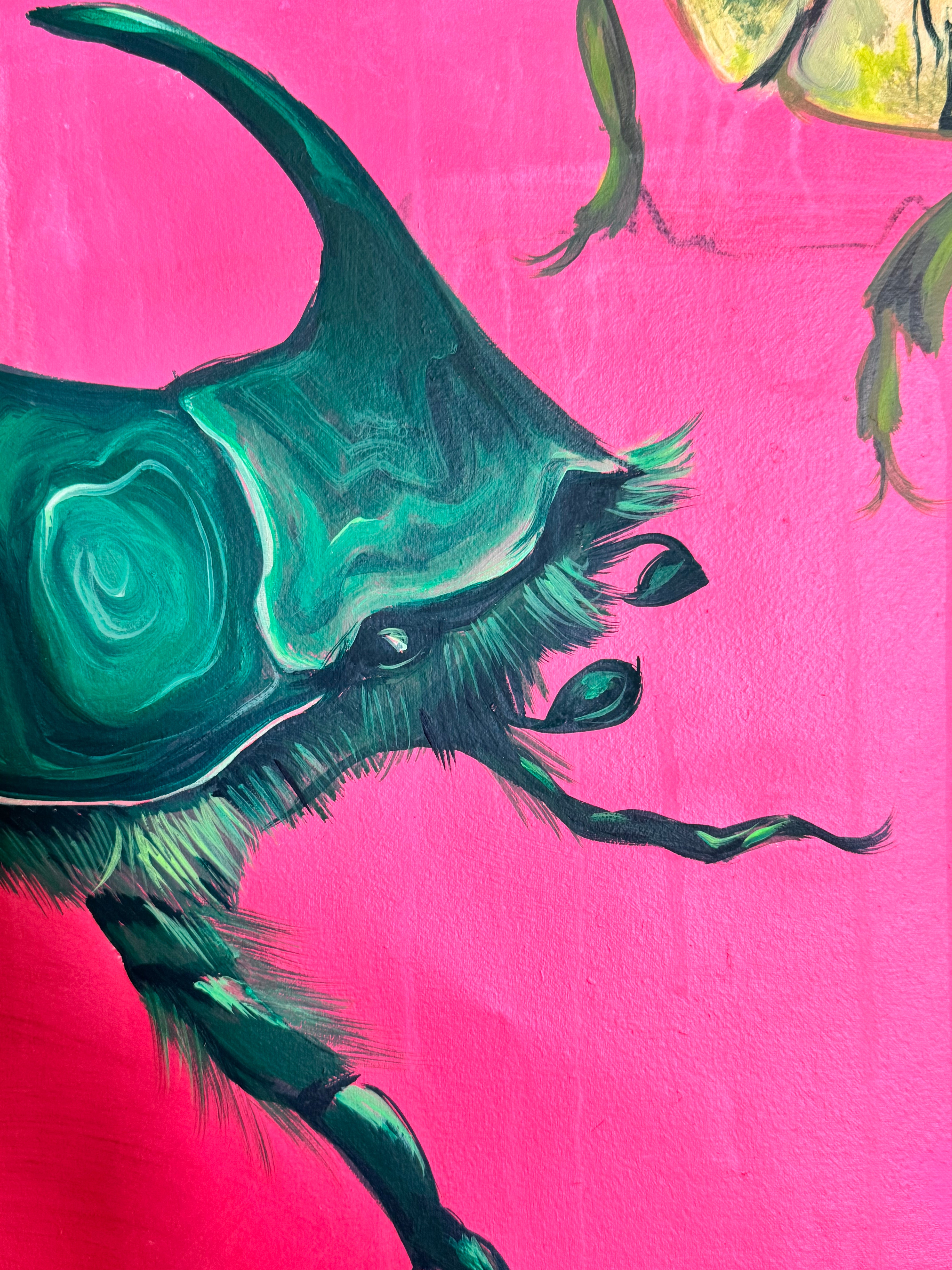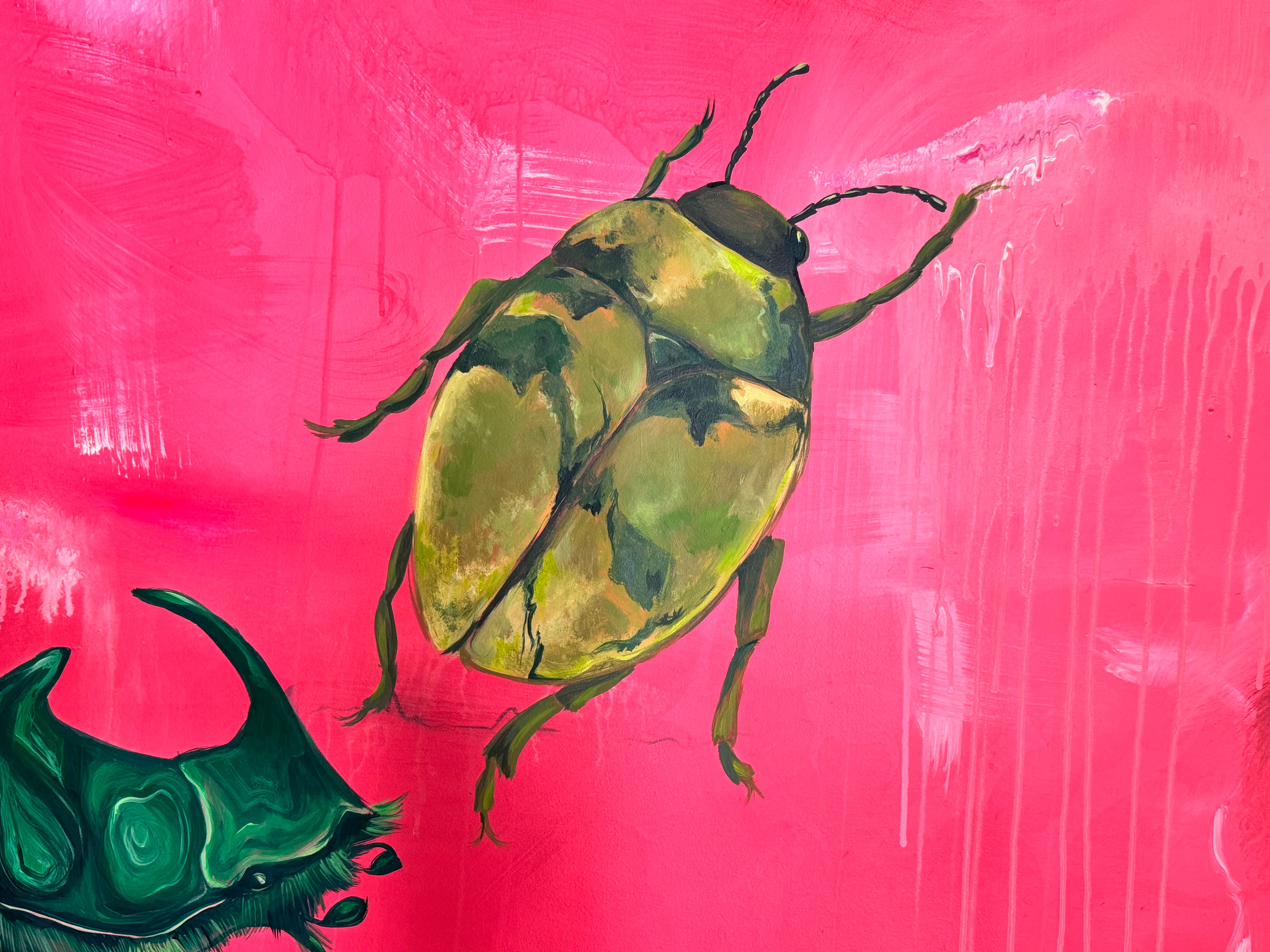 The piece is anchored by a fearless, washed-pink atmosphere—a contemporary field of acrylic drips and energetic scribbles. Traversing this landscape is a procession of beetles, each rendered with the luster of semi-precious stones. The artist’s favorite color, green, takes center stage here: detailed close-ups reveal carapaces painted with the swirling depth of malachite and the mossy fracturing of raw agate.