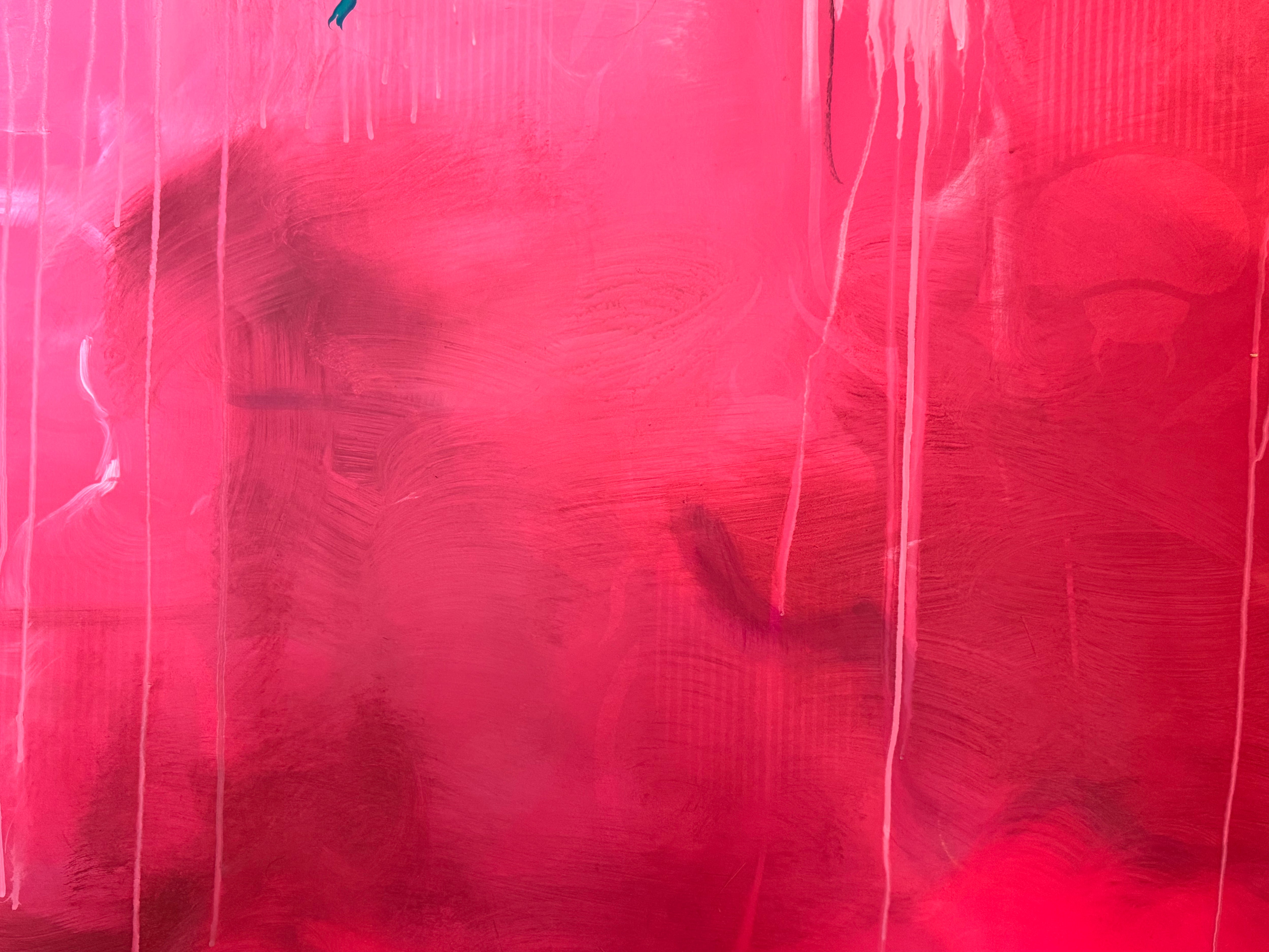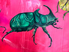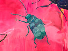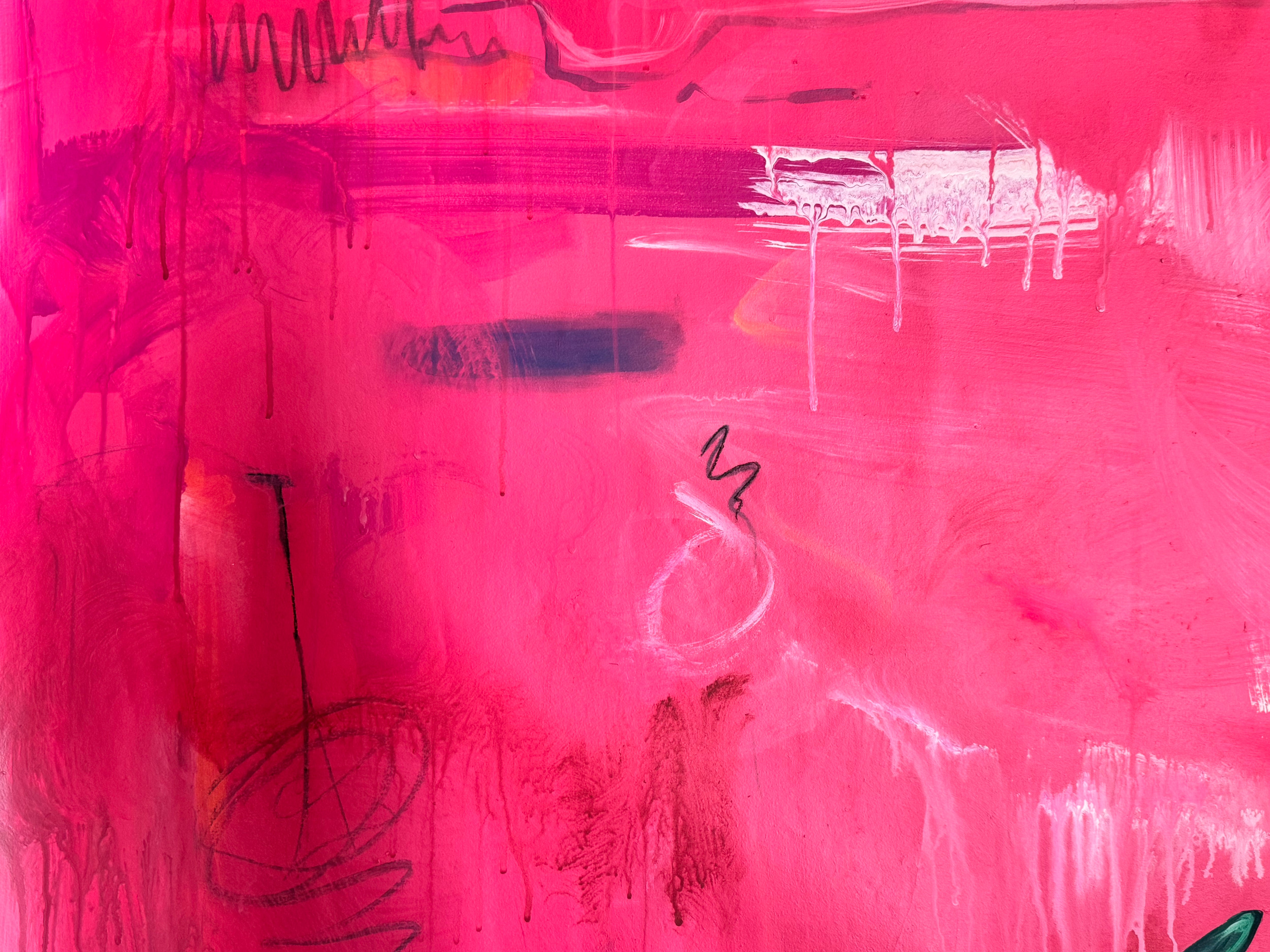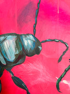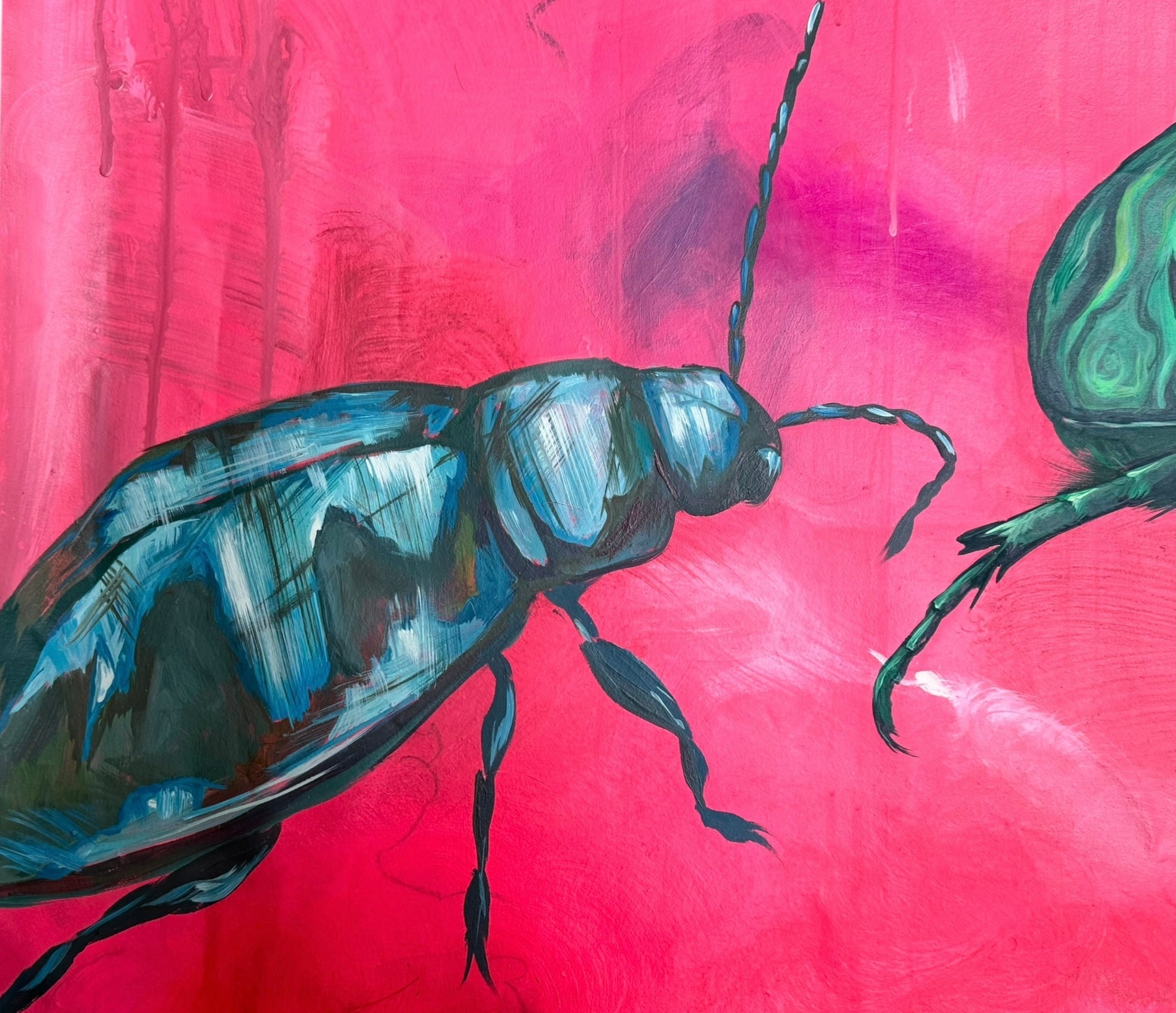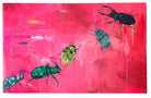 The piece is anchored by a fearless, washed-pink atmosphere—a contemporary field of acrylic drips and energetic scribbles. Traversing this landscape is a procession of beetles, each rendered with the luster of semi-precious stones. The artist’s favorite color, green, takes center stage here: detailed close-ups reveal carapaces painted with the swirling depth of malachite and the mossy fracturing of raw agate.