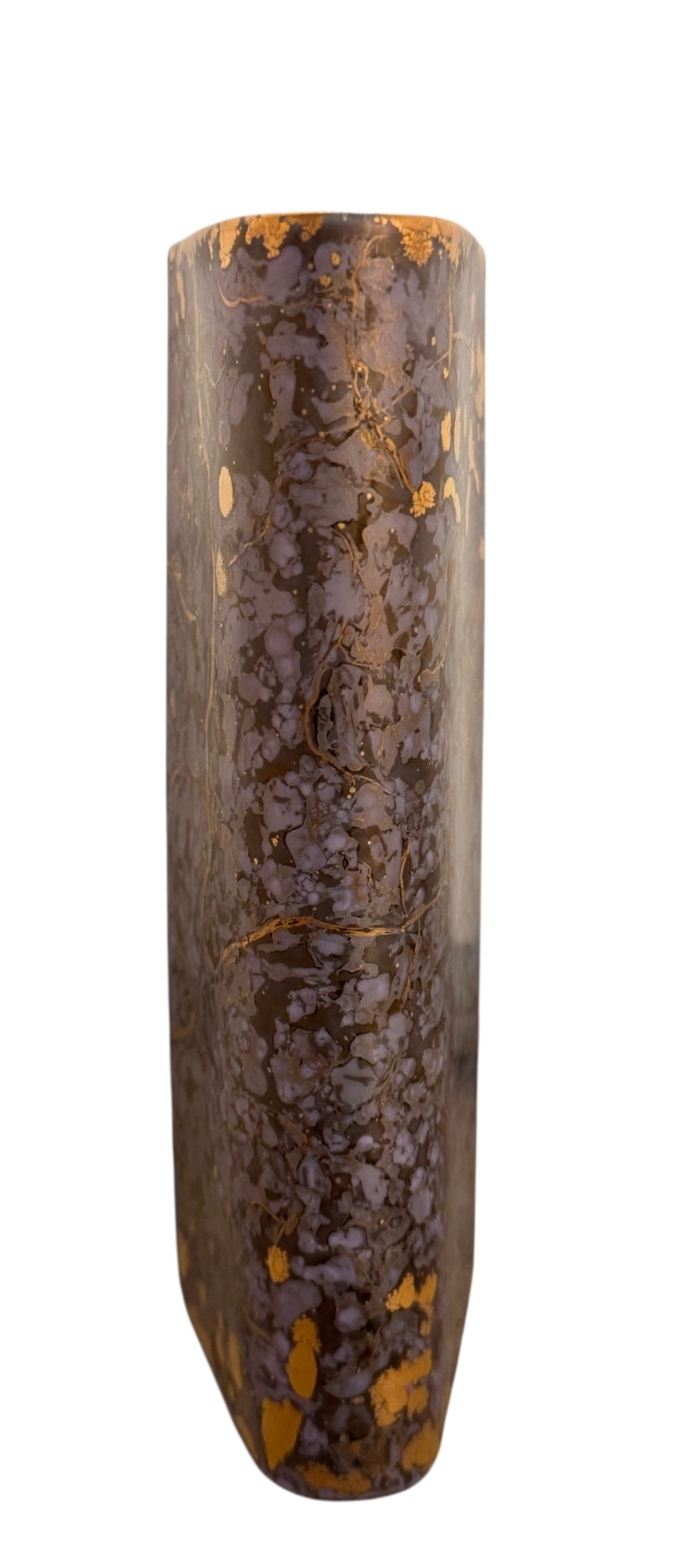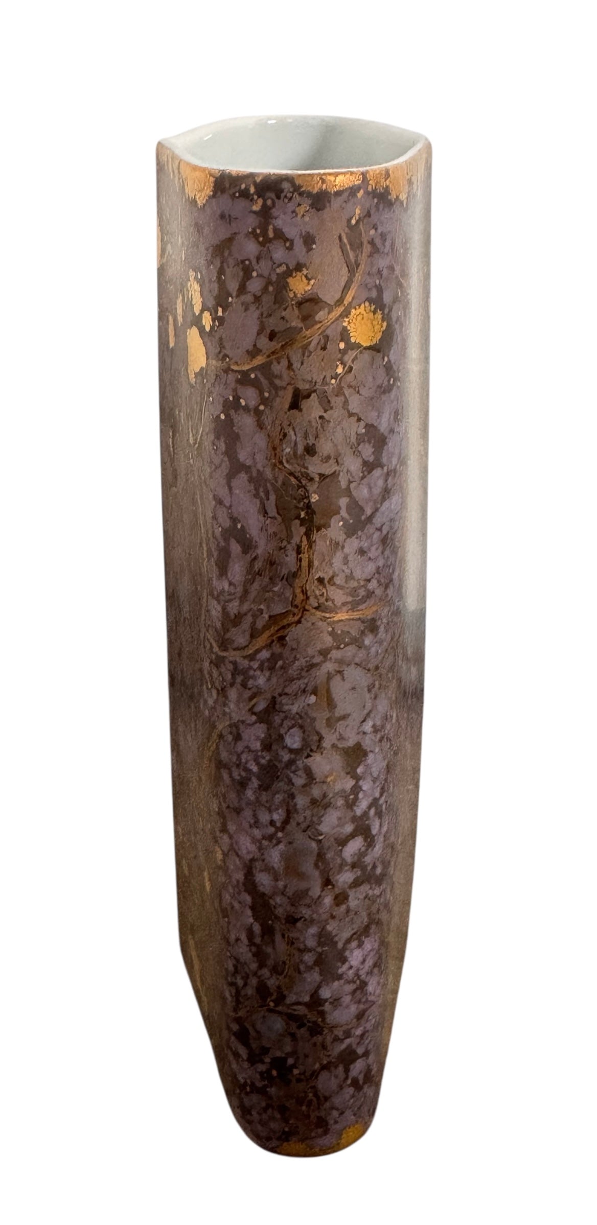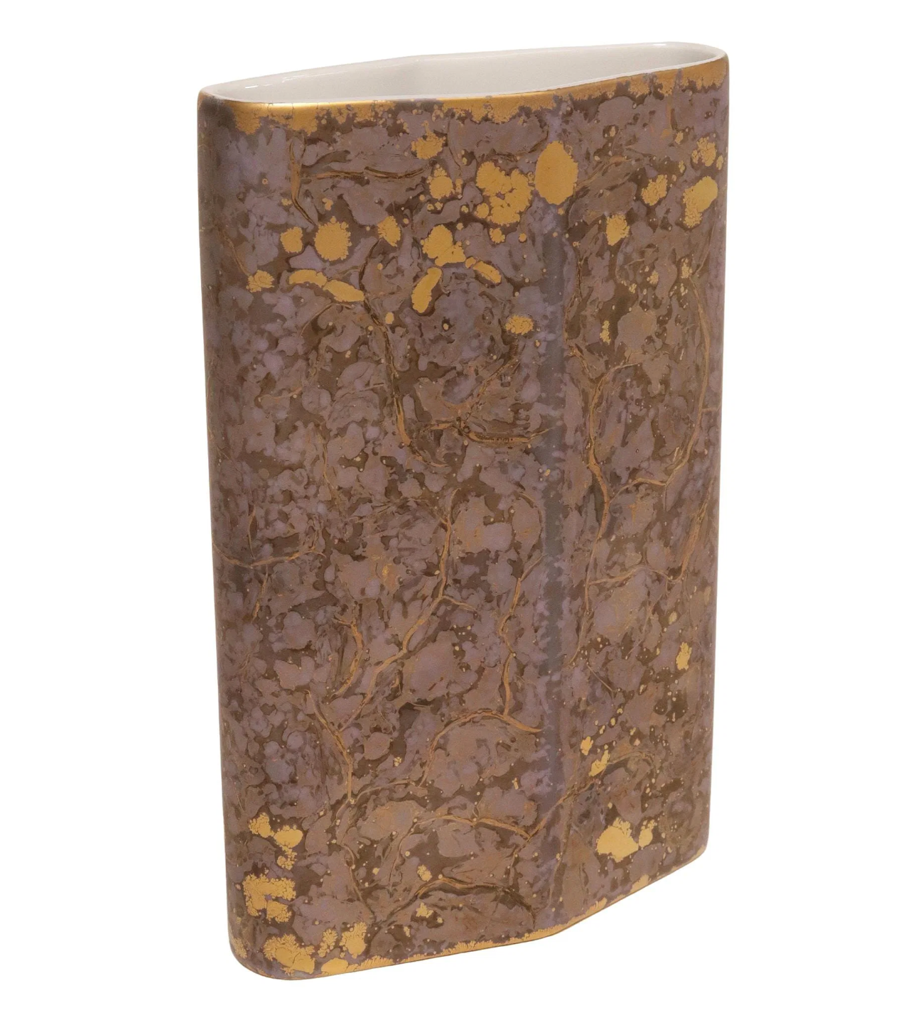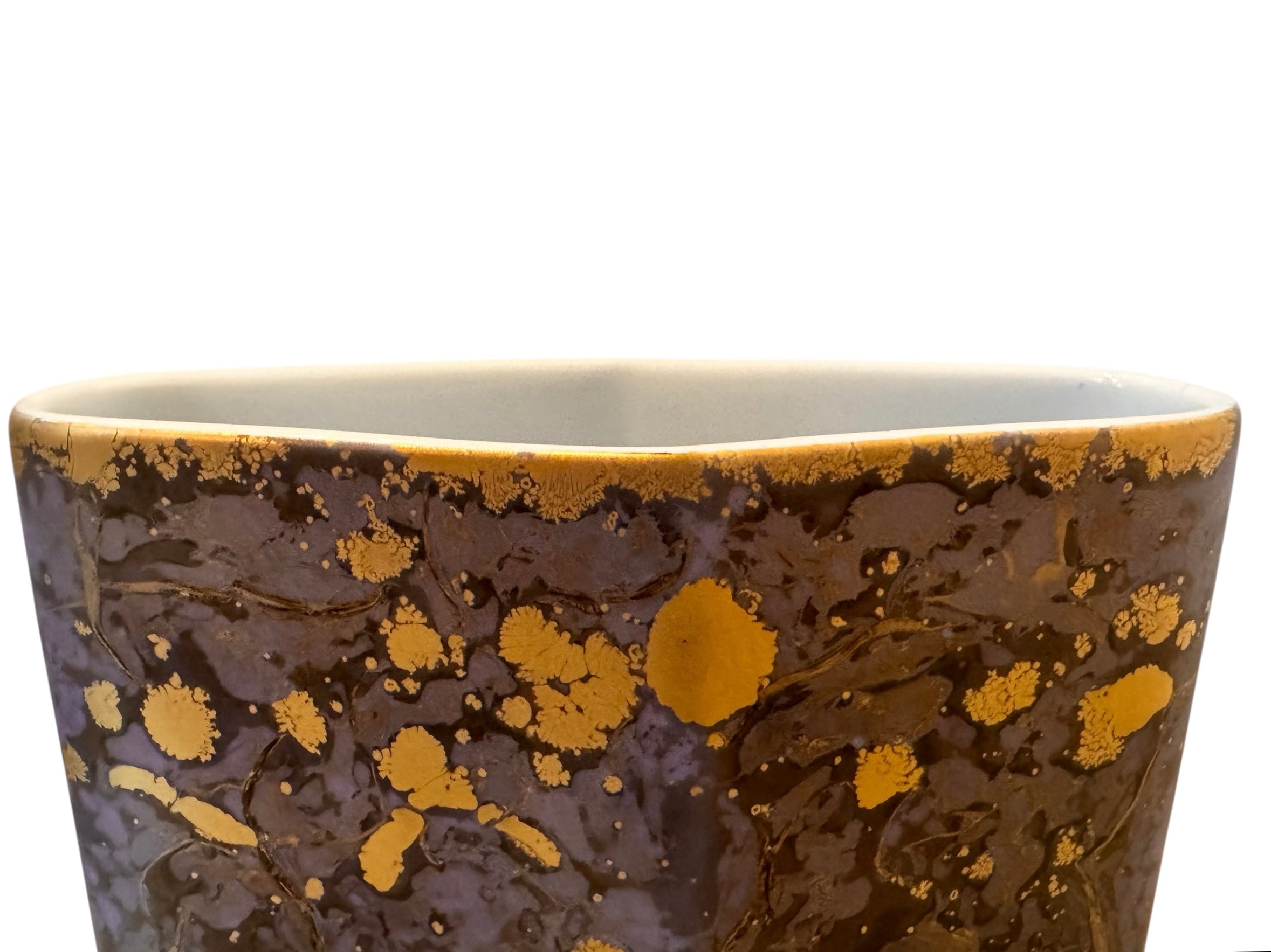 A striking example of Rosenthal's Studio-Linie aesthetic, this porcelain vase embodies the avant-garde spirit of German design. Created by Helmut Dresler, and crafted until 1985, the vase showcases the coveted "Goldfeuer" décor, a marbleized glaze in nuanced violet-grey hues enriched with shimmering parcel-gilt accents. The hand-applied real gold details dance across the smooth, matte surface, lending a luxurious and organic feel to the vase's sleek form. Bearing the Rosenthal mark, "Handgemalt," and Dresler's signature on the base, this vase is a testament to the brand's commitment to collaboration with visionary artists and its mastery of porcelain craftsmanship. It is a modern yet timeless piece that offers a blend of high design and artistic expression.
