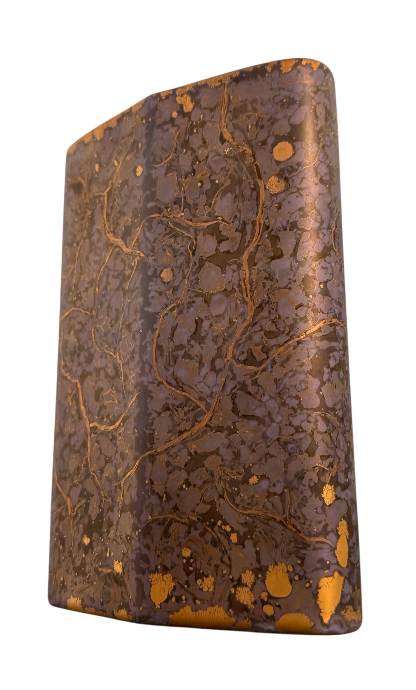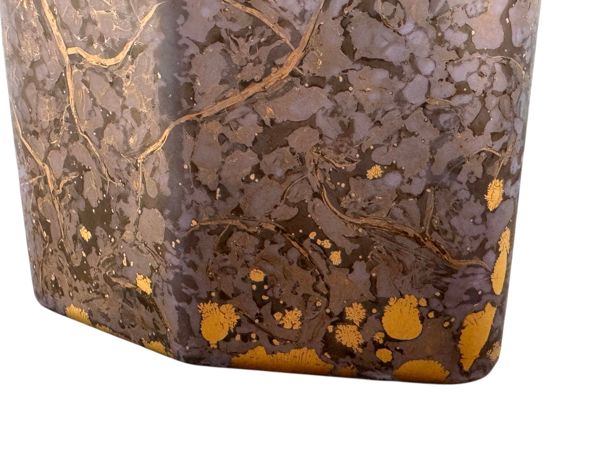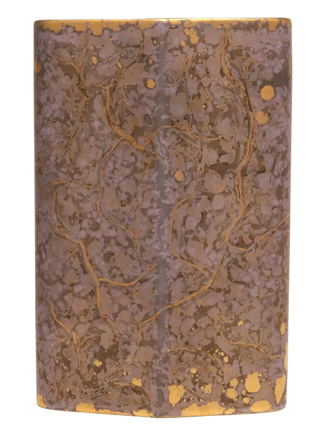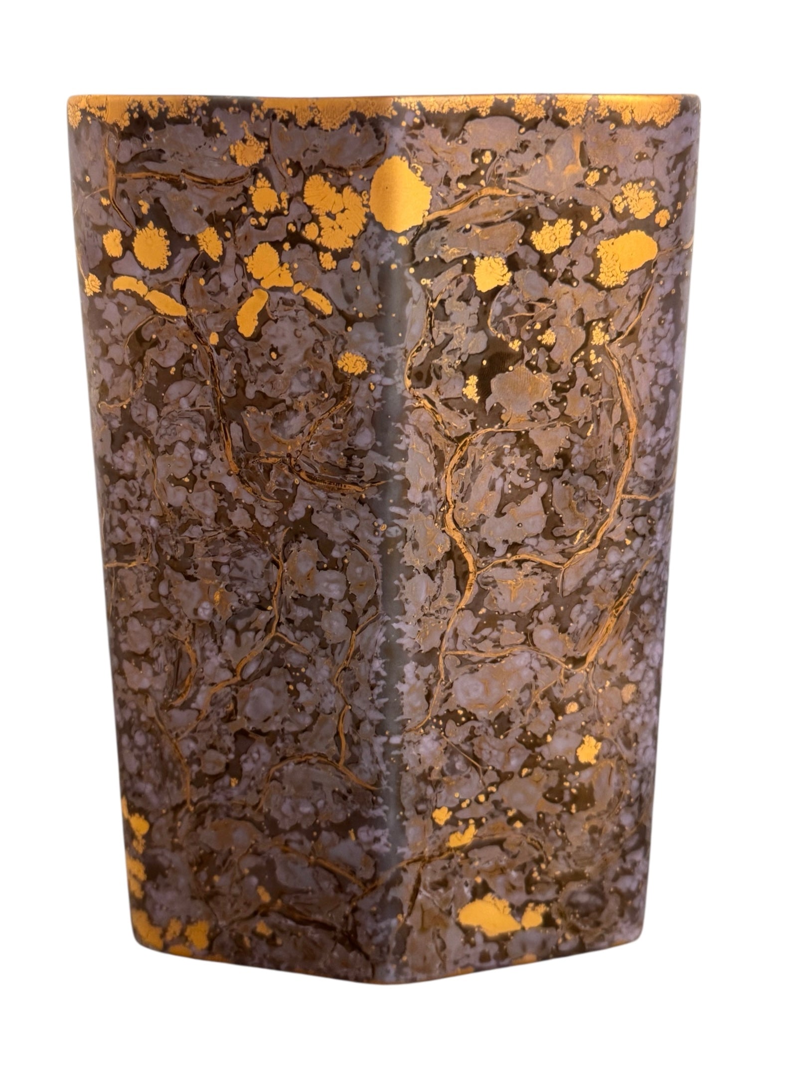 A striking example of Rosenthal's Studio-Linie aesthetic, this porcelain vase embodies the avant-garde spirit of German design. Created by Helmut Dresler, and crafted until 1985, the vase showcases the coveted "Goldfeuer" décor, a marbleized glaze in nuanced violet-grey hues enriched with shimmering parcel-gilt accents. The hand-applied real gold details dance across the smooth, matte surface, lending a luxurious and organic feel to the vase's sleek form. Bearing the Rosenthal mark, "Handgemalt," and Dresler's signature on the base, this vase is a testament to the brand's commitment to collaboration with visionary artists and its mastery of porcelain craftsmanship. It is a modern yet timeless piece that offers a blend of high design and artistic expression.