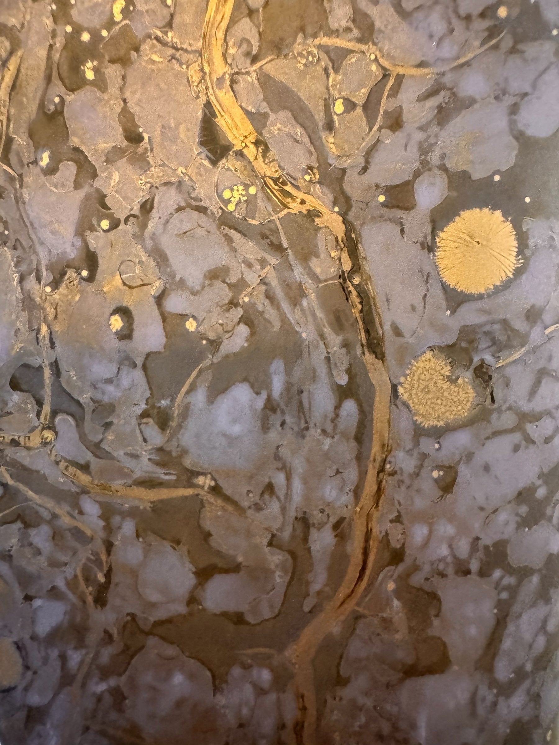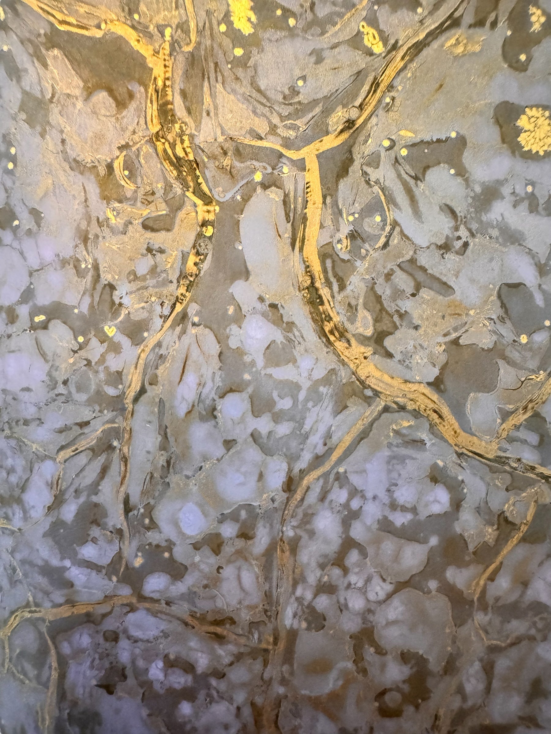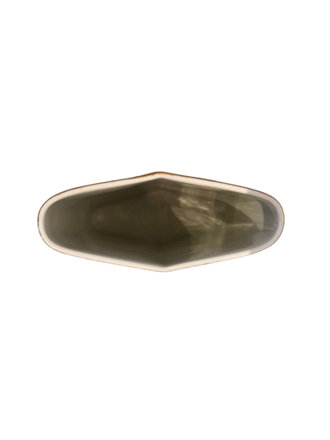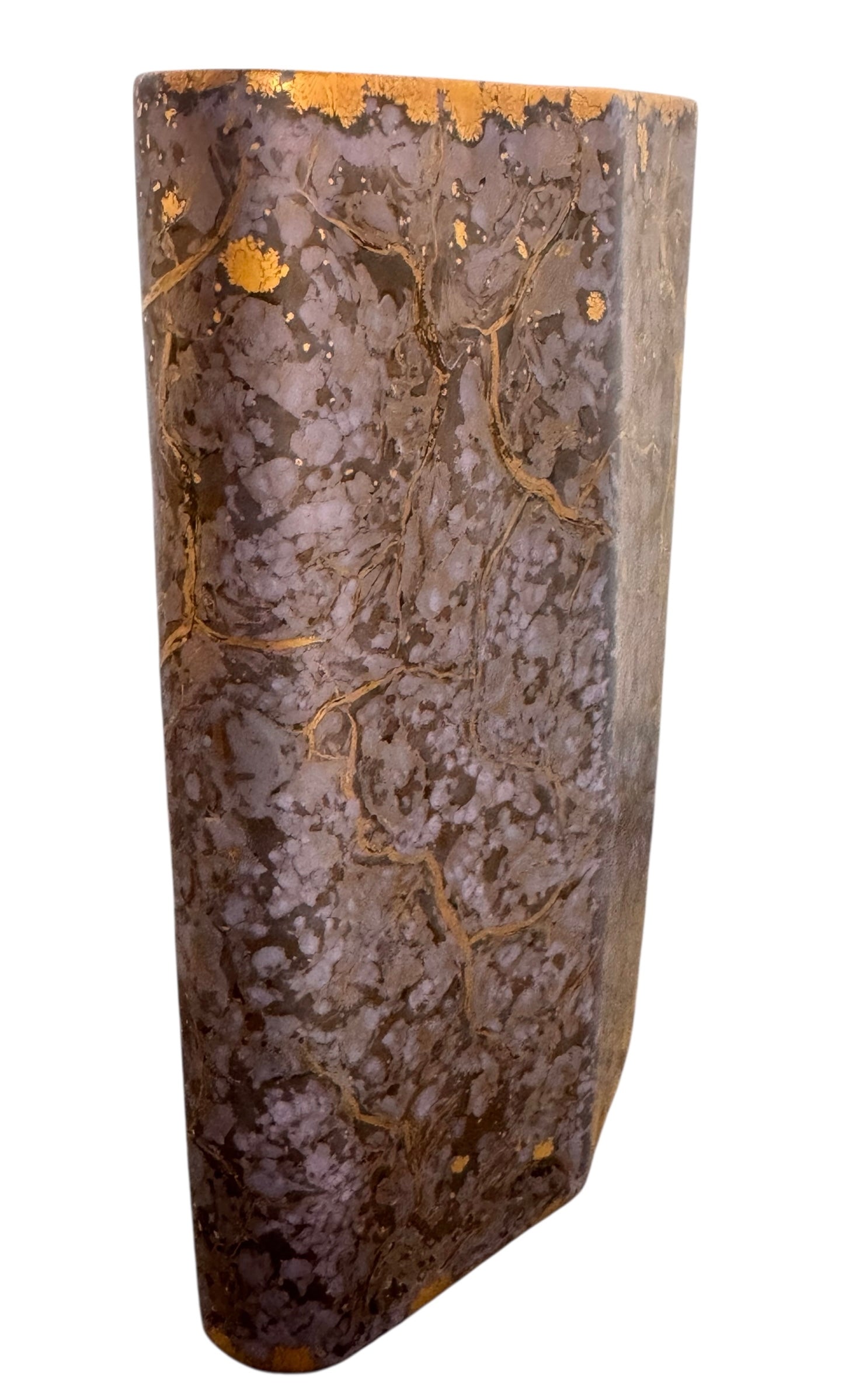 A striking example of Rosenthal's Studio-Linie aesthetic, this porcelain vase embodies the avant-garde spirit of German design. Created by Helmut Dresler, and crafted until 1985, the vase showcases the coveted "Goldfeuer" décor, a marbleized glaze in nuanced violet-grey hues enriched with shimmering parcel-gilt accents. The hand-applied real gold details dance across the smooth, matte surface, lending a luxurious and organic feel to the vase's sleek form. Bearing the Rosenthal mark, "Handgemalt," and Dresler's signature on the base, this vase is a testament to the brand's commitment to collaboration with visionary artists and its mastery of porcelain craftsmanship. It is a modern yet timeless piece that offers a blend of high design and artistic expression.