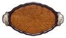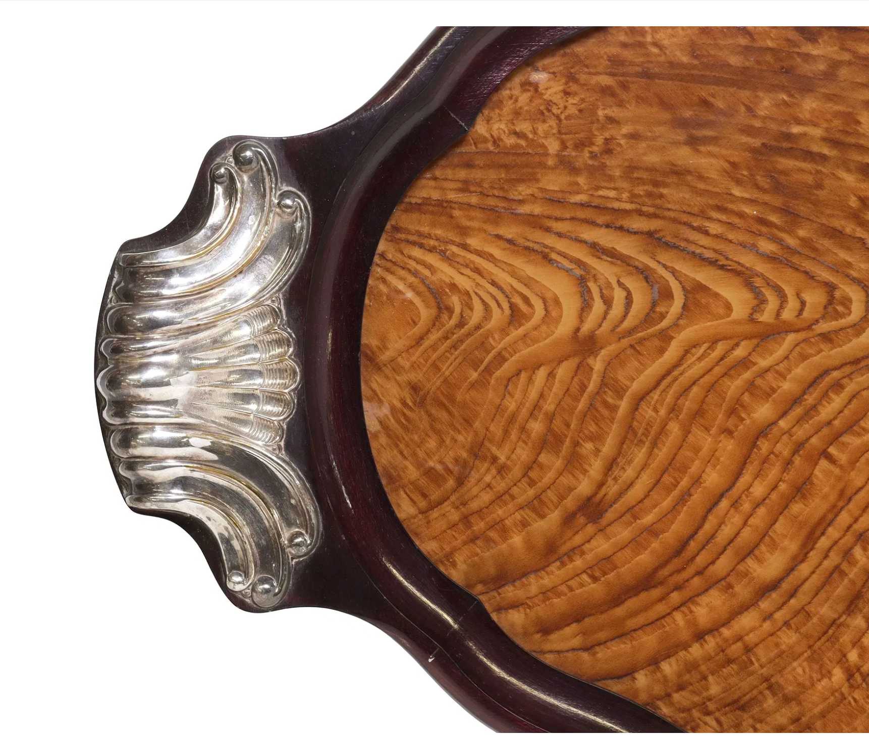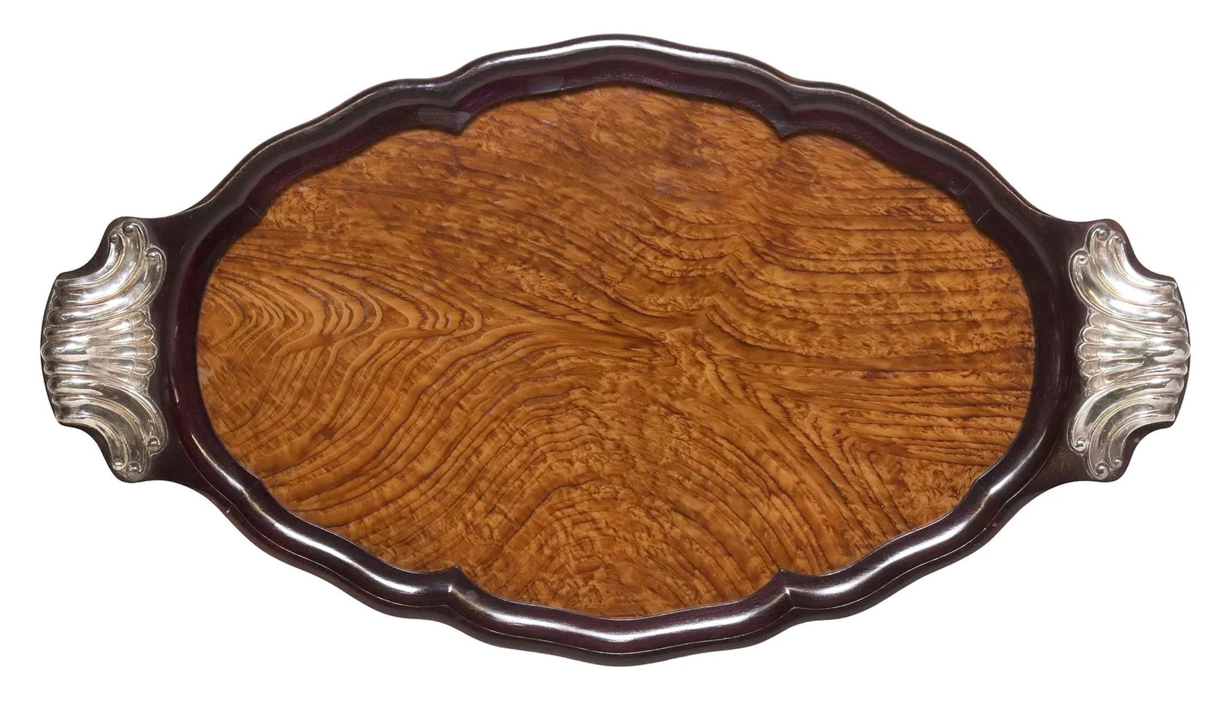 The veneer is framed by a rich, dark hardwood rim featuring elegant serpentine curvature that softens the strict linearity often associated with the period. Flanking the tray are dual statement handles rendered in silver plate. These bold, sculptural elements feature stylized fluting and scrolled terminals, bridging the gap between late Art Nouveau organicism and the industrial glamour of Art Deco.