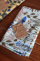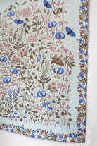 Bring a touch of nature-inspired art to your kitchen or gallery wall with this charming "Thicket" tea towel by Leah Duncan. This flour sack towel features a delightful design showcasing a densely populated wildflower meadow, filled with bluebell-like blooms, butterflies, and other botanical details in a palette of blues, browns, and pinks set against a soft, pale blue background.