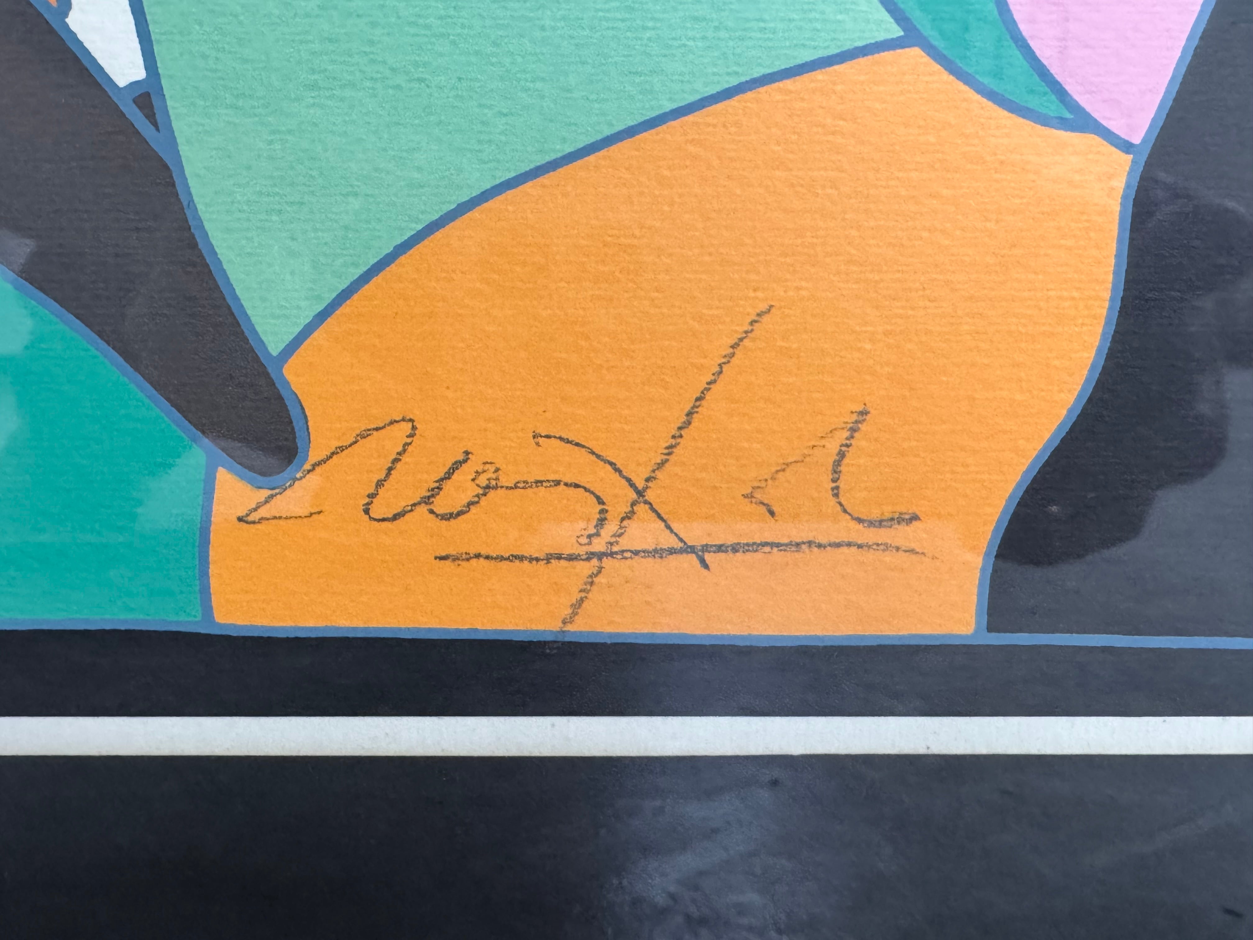 In Barnum and Bailey, Italian master Ugo Nespolo delivers a captivating Pop Art commentary through a dynamic exploration of form, color, and cultural symbolism. This exceptional Artist's Proof, a rare insight into the artist's original vision, is a quintessential example of Nespolo's vibrant, multi-disciplinary oeuvre, framed elegantly in a sleek black lacquered-style frame with a cream mat.
