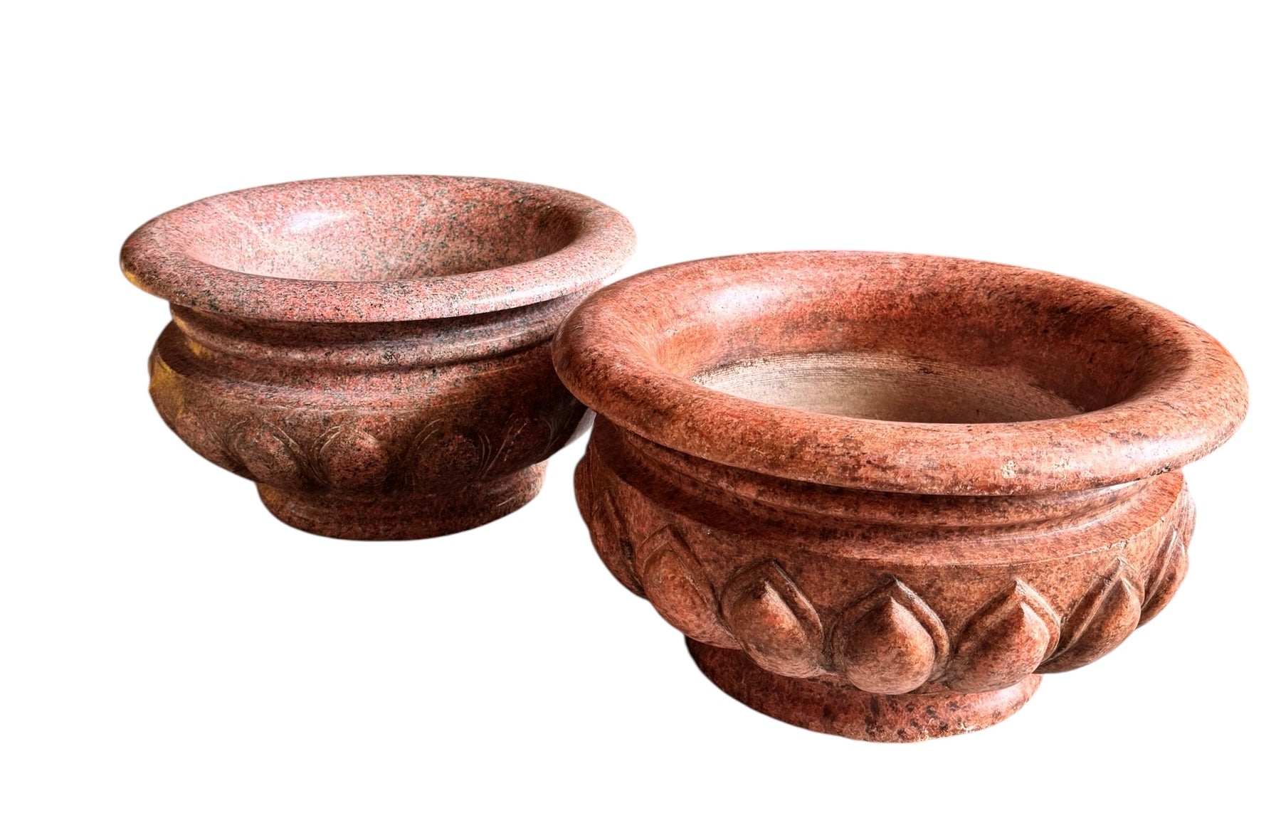 Invite the elemental beauty of nature indoors with these hand-carved granite planters, defined by their sculptural presence and richly textured stone. A tactile and substantial form, rendered in blended hues of pink, white, and black, makes a bold statement. Glimmers of green peek from within the pink granite, further emphasizing the pieces' natural form. Each planter showcases subtle variations in the stone's natural grain and an enigmatic motif carved into the surface, ensuring a unique addition to any interior. These planters are striking decorative pieces that can be styled in any indoor space. Some wear to the stone is visible.