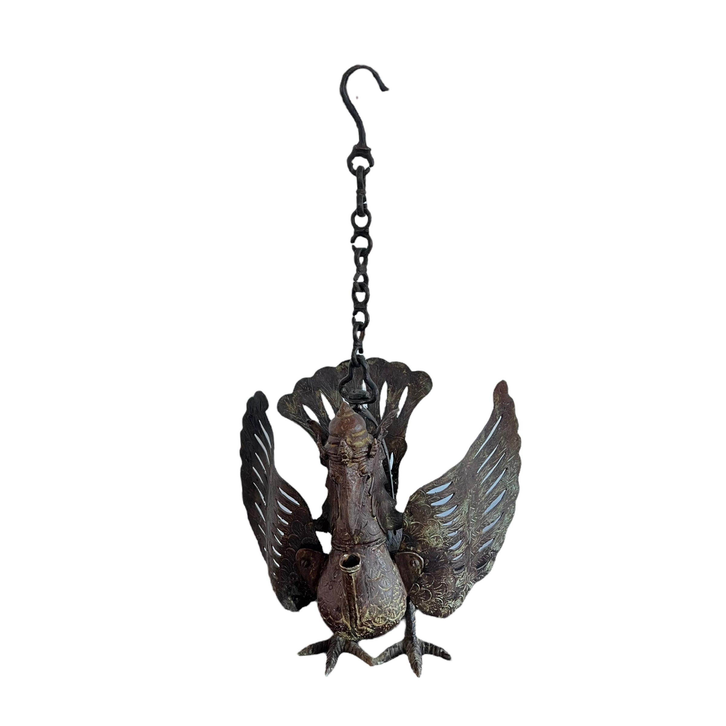 Lámpara de aceite Wayang Kulit de Garuda 'Pájaro Gigante' de latón. Las alas se extienden y la cabeza, las alas y la cola se mantienen unidas mediante tuercas y tornillos de la manera más artística. Todo el cuerpo estaba grabado con patrones para imitar plumas. Su cuerpo hueco es un recipiente con un gancho. Listo para colgar en interiores o exteriores. Pátina por todas partes. Fantástico estado.