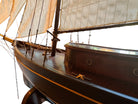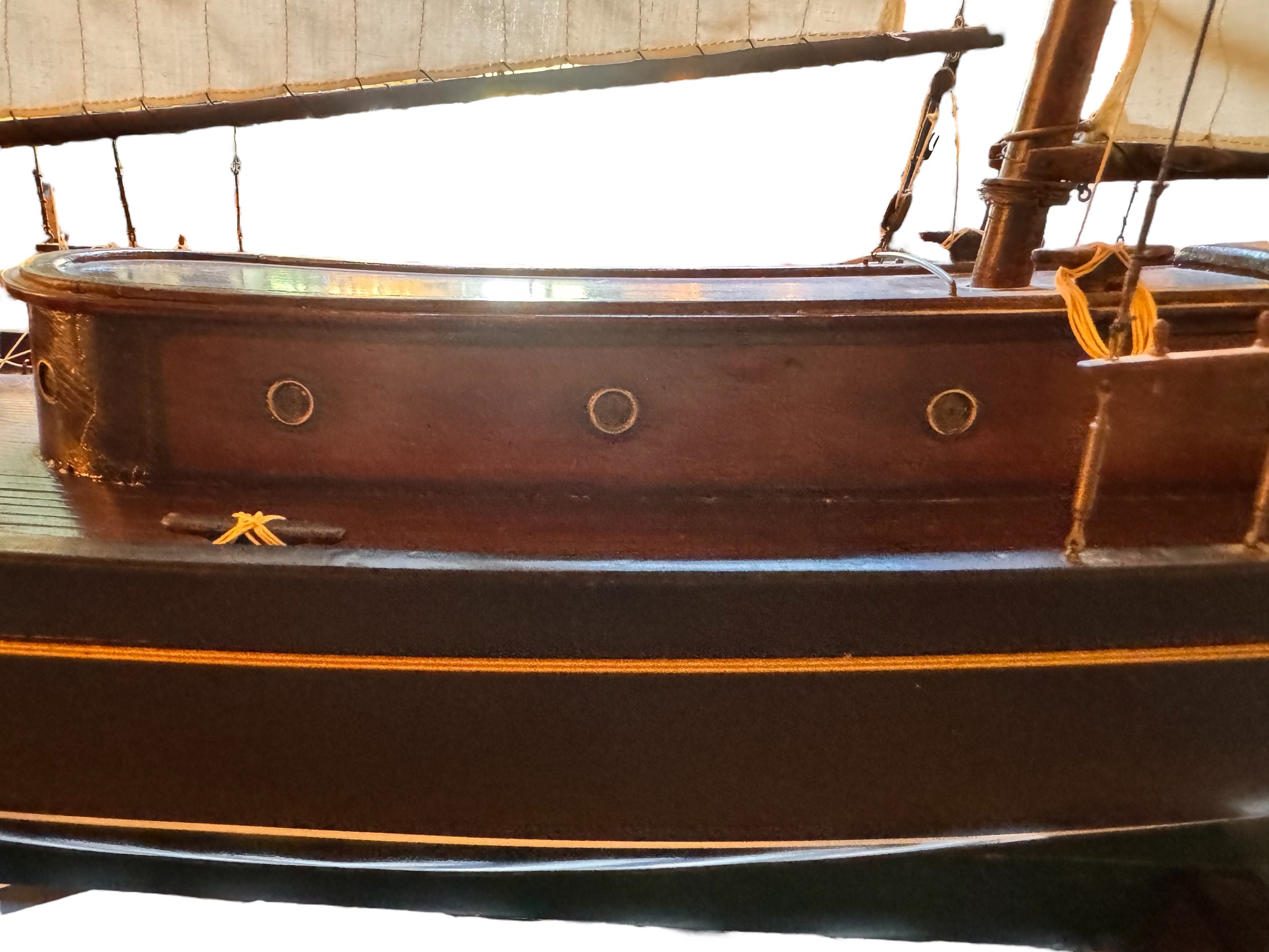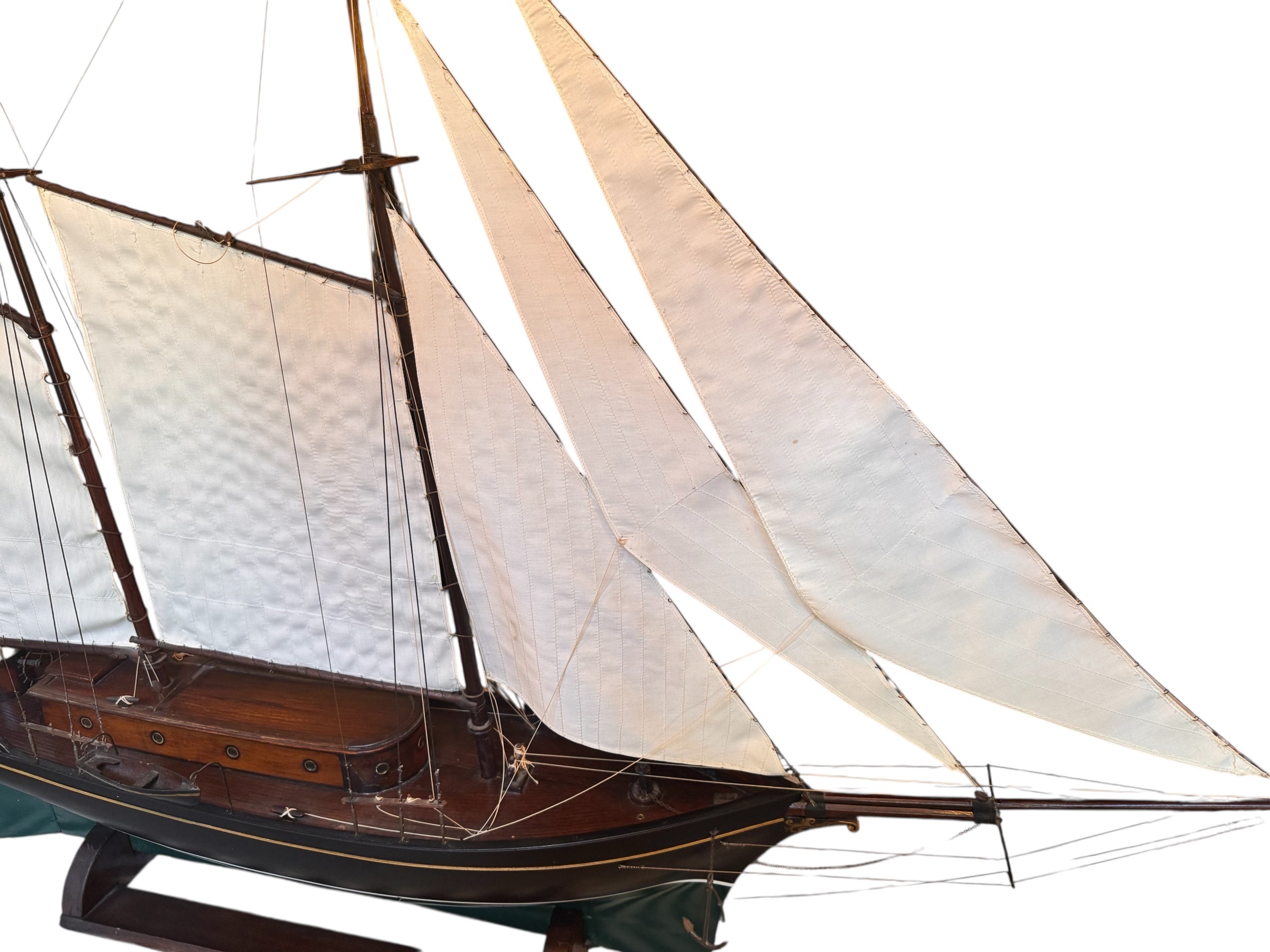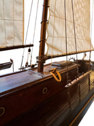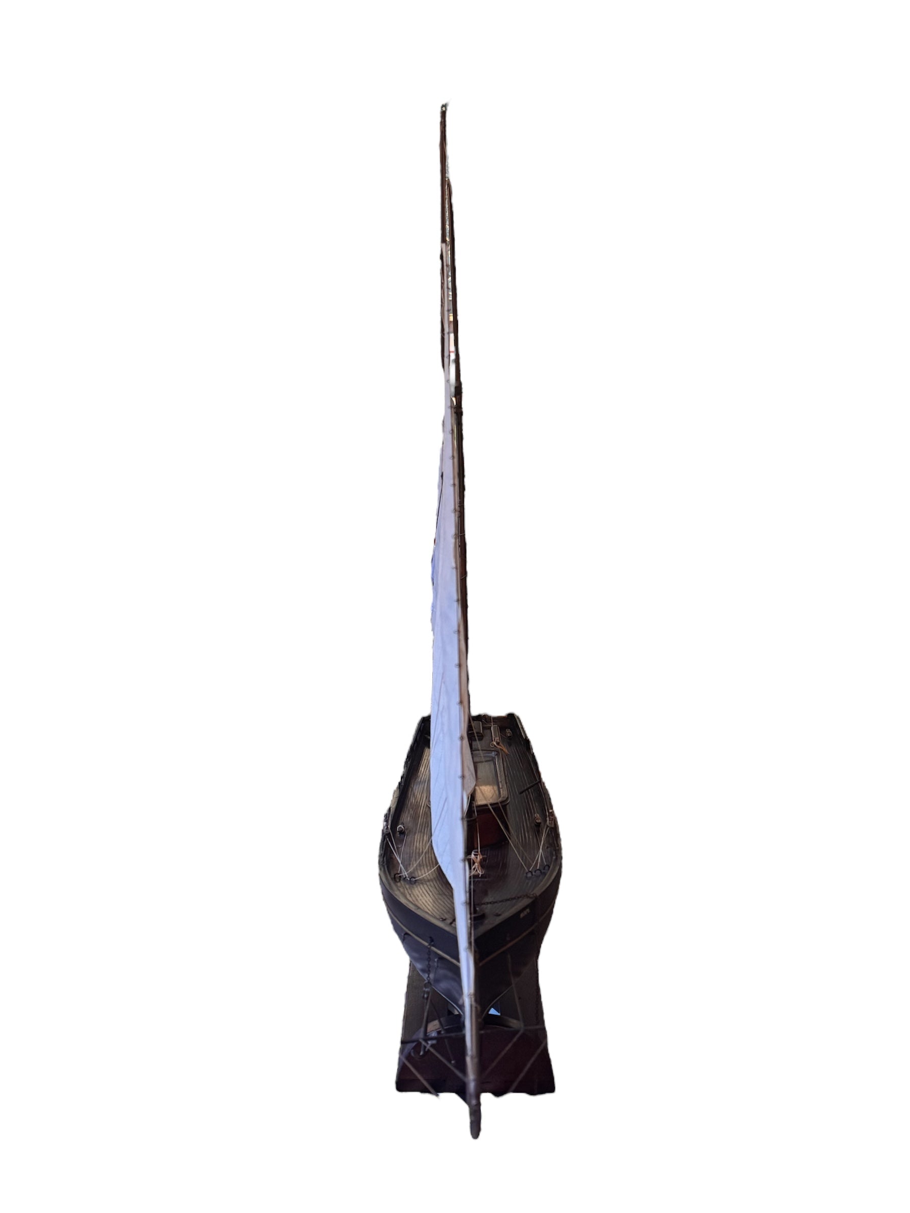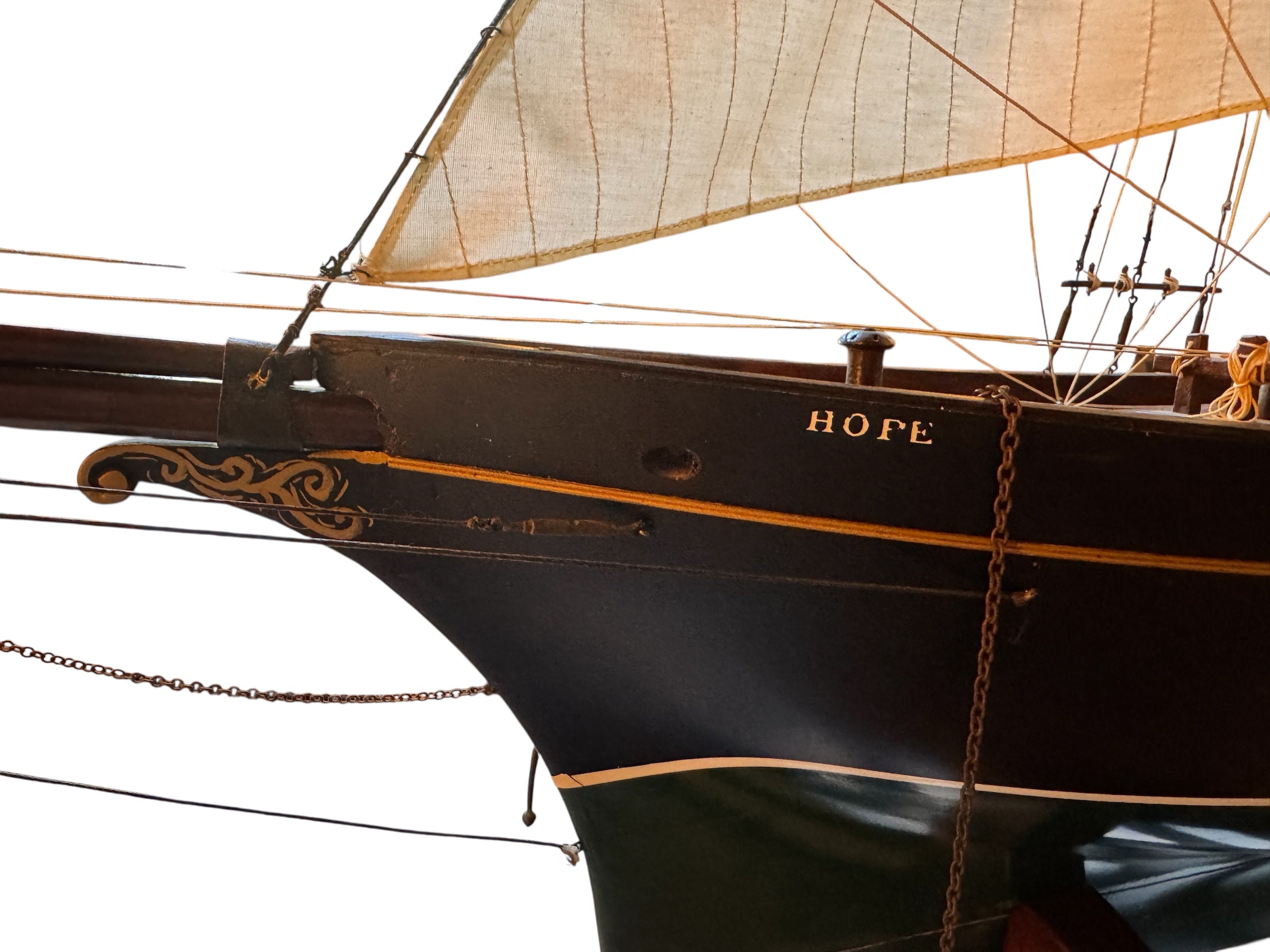 This detailed model of the schooner "Hope" is a masterclass in nautical craftsmanship and design. Built with exquisite attention to detail, it features a dark hull that contrasts with the elegant, sewn fabric sails. The model is presented on a custom stand, showcasing its fine lines and rigging.