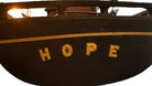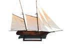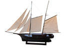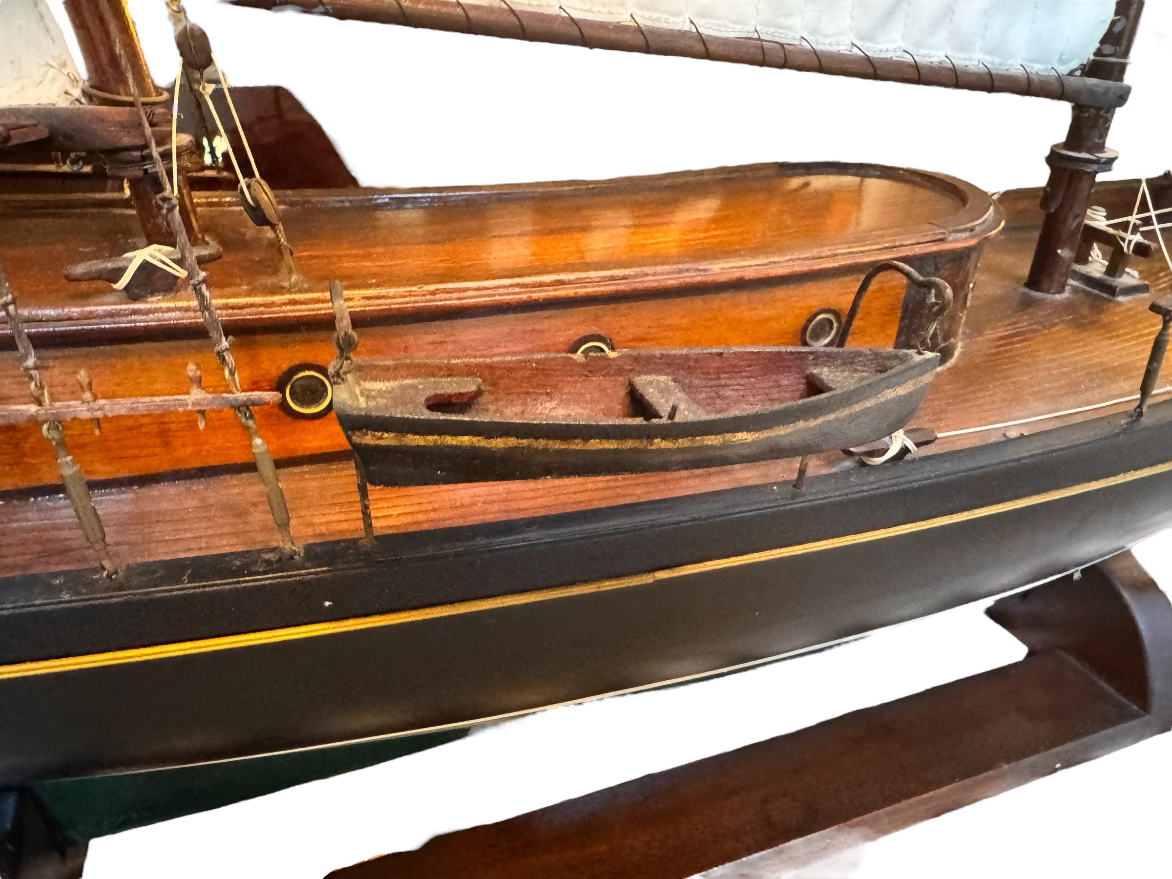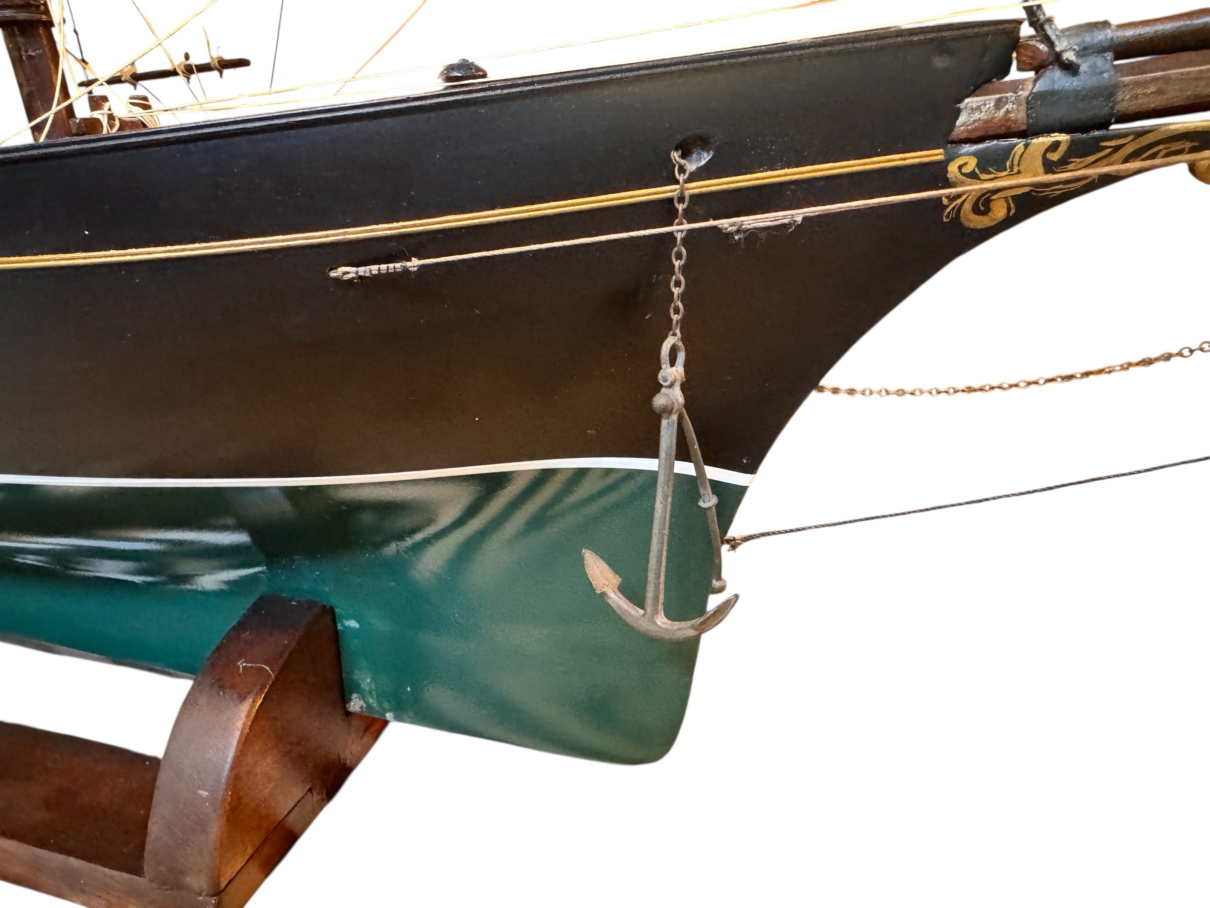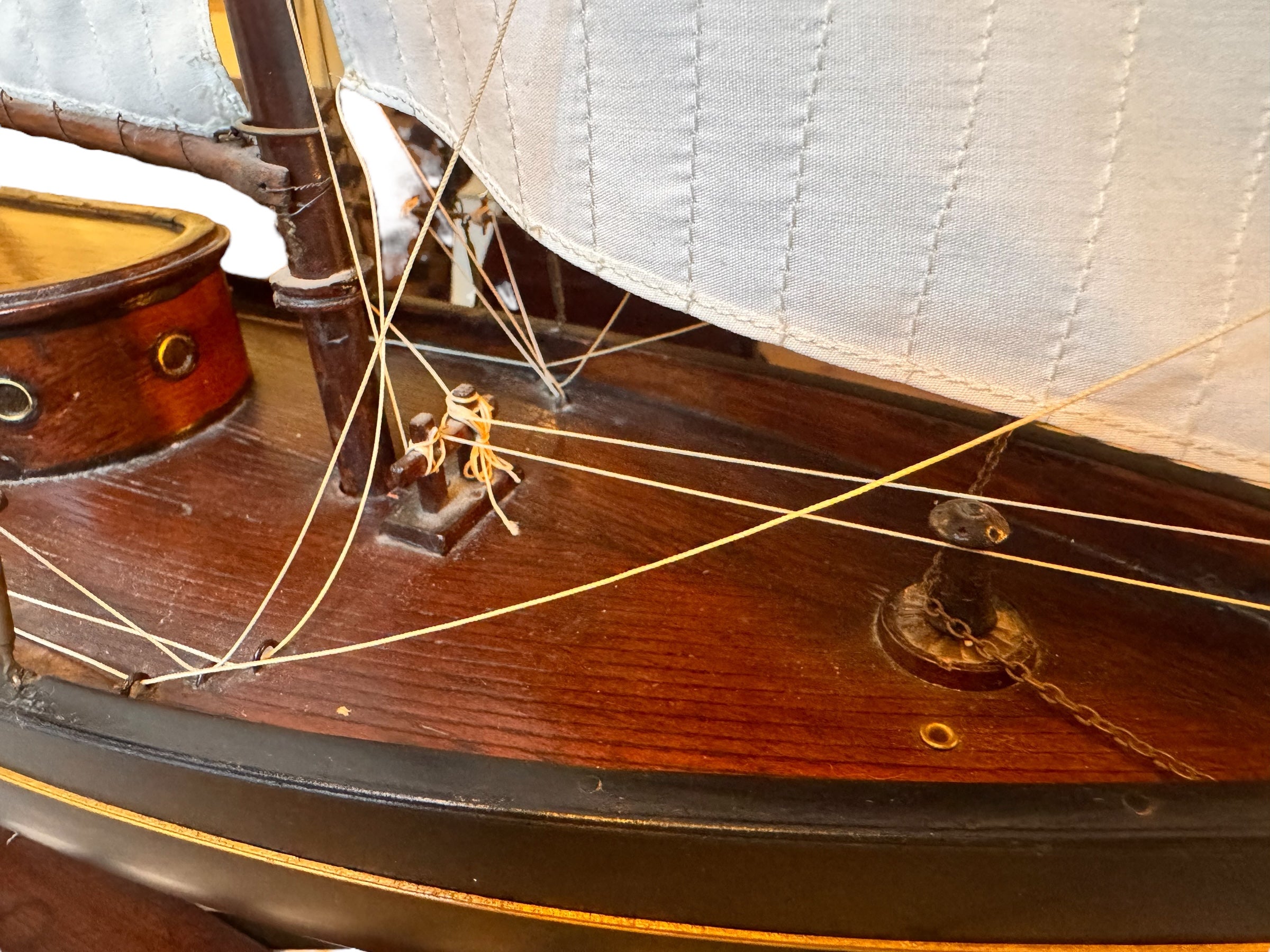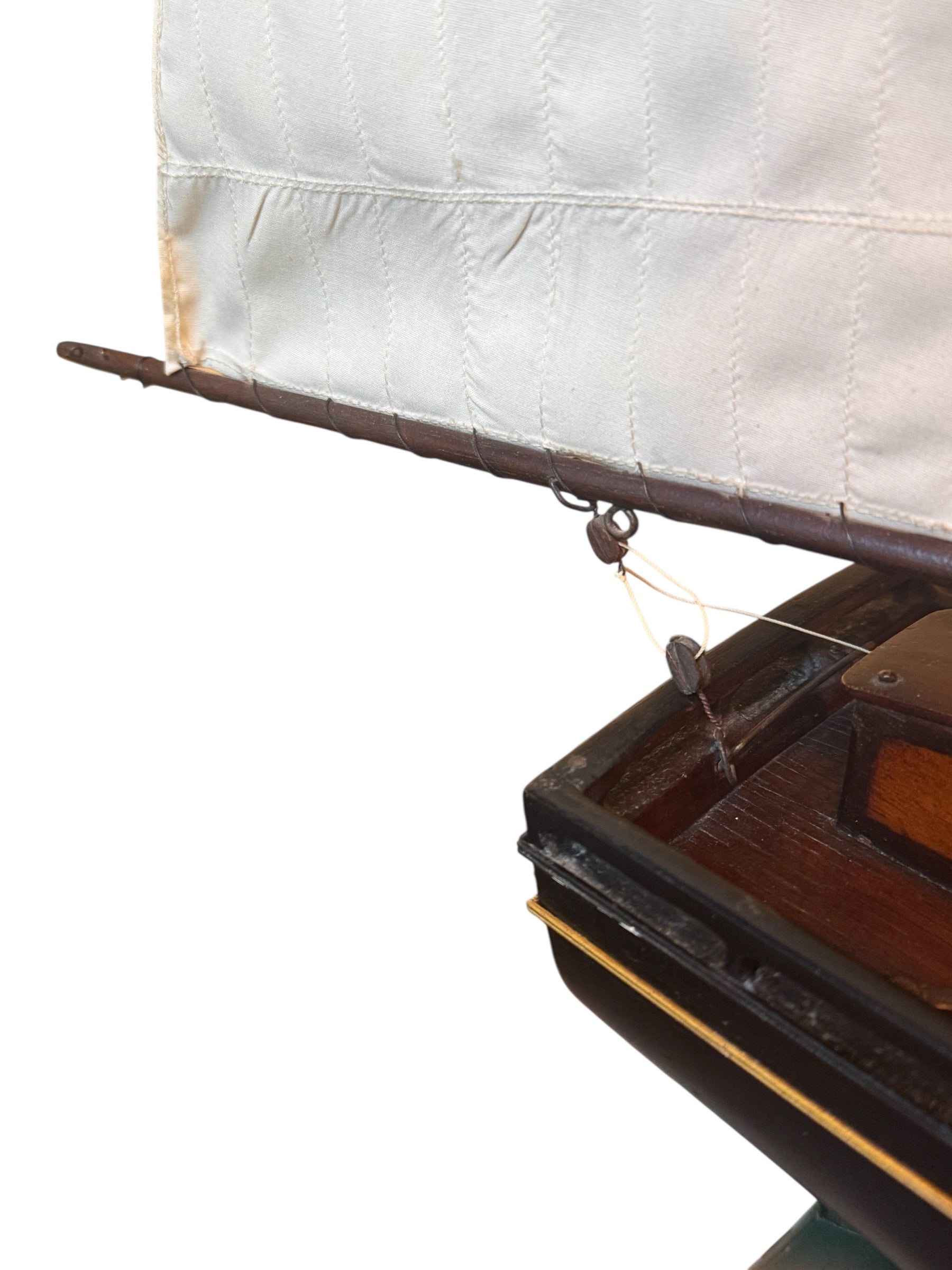 This detailed model of the schooner "Hope" is a masterclass in nautical craftsmanship and design. Built with exquisite attention to detail, it features a dark hull that contrasts with the elegant, sewn fabric sails. The model is presented on a custom stand, showcasing its fine lines and rigging.
