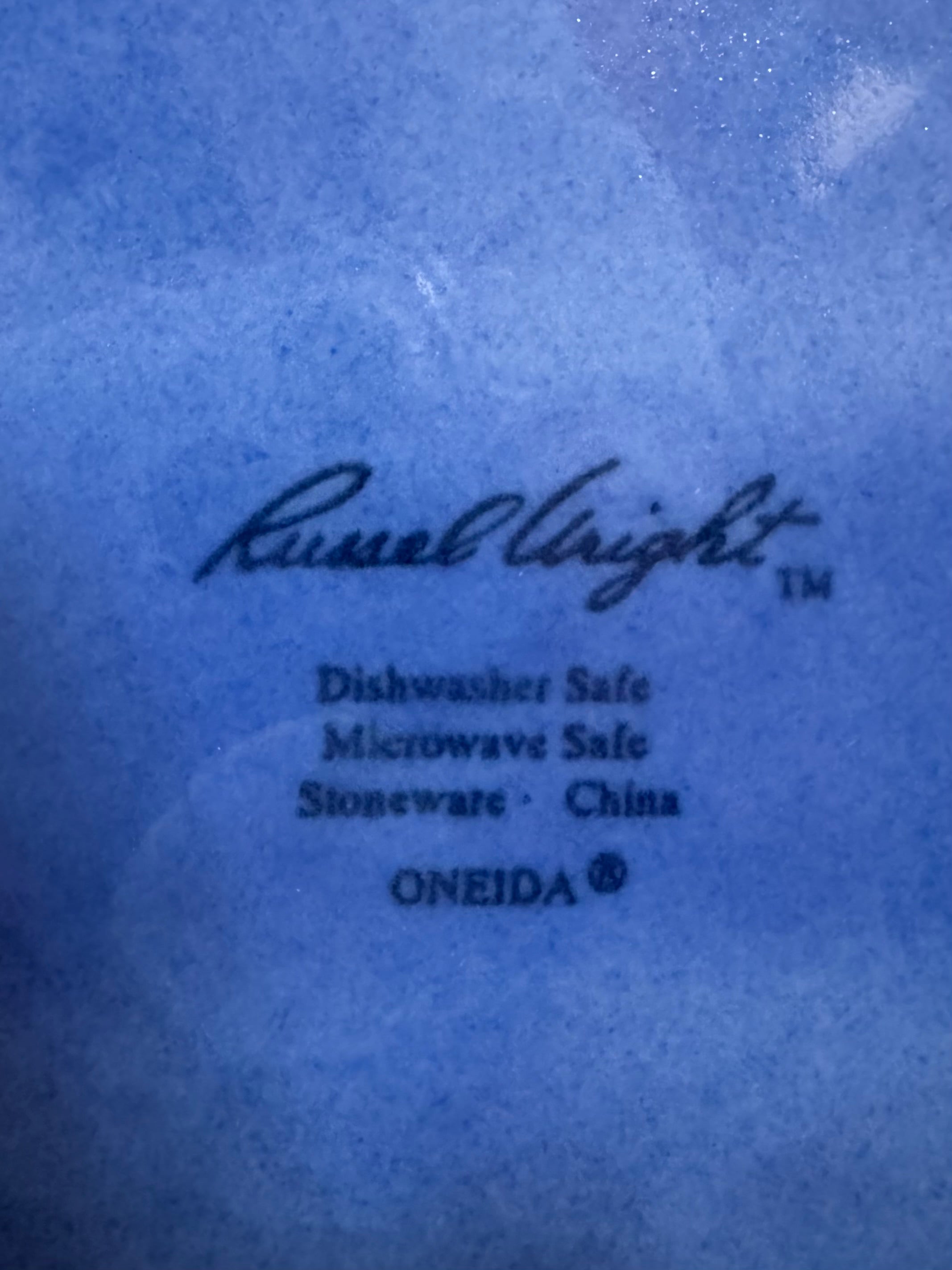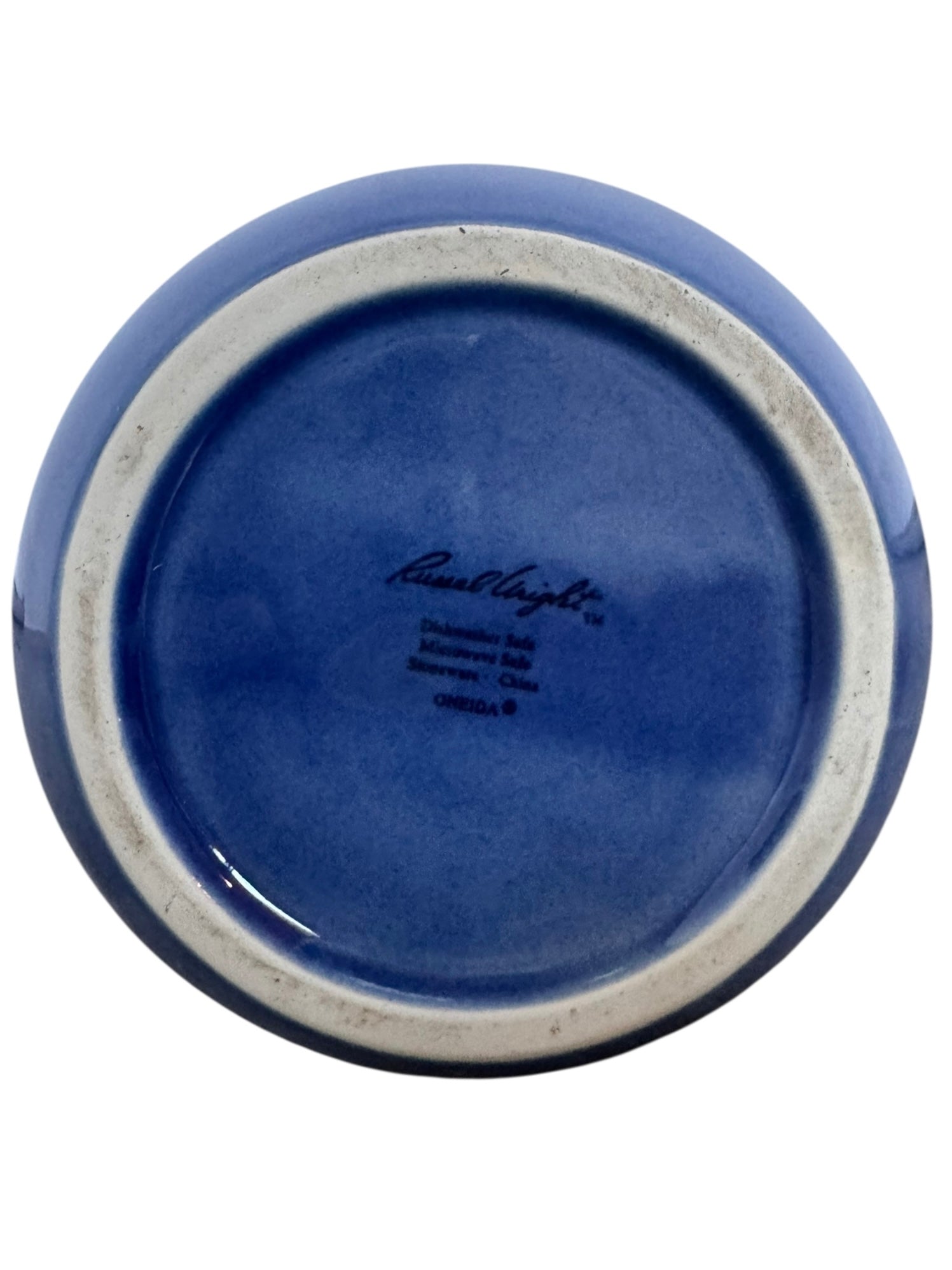 Rendered in a saturated, calming Periwinkle Blue, the glaze highlights the dimensional curves of the stoneware. Unlike its vintage earthenware predecessors, this Oneida iteration was engineered for the modern home; the underside bears the distinct mark confirming it is crafted from durable stoneware that is both dishwasher and microwave safe.