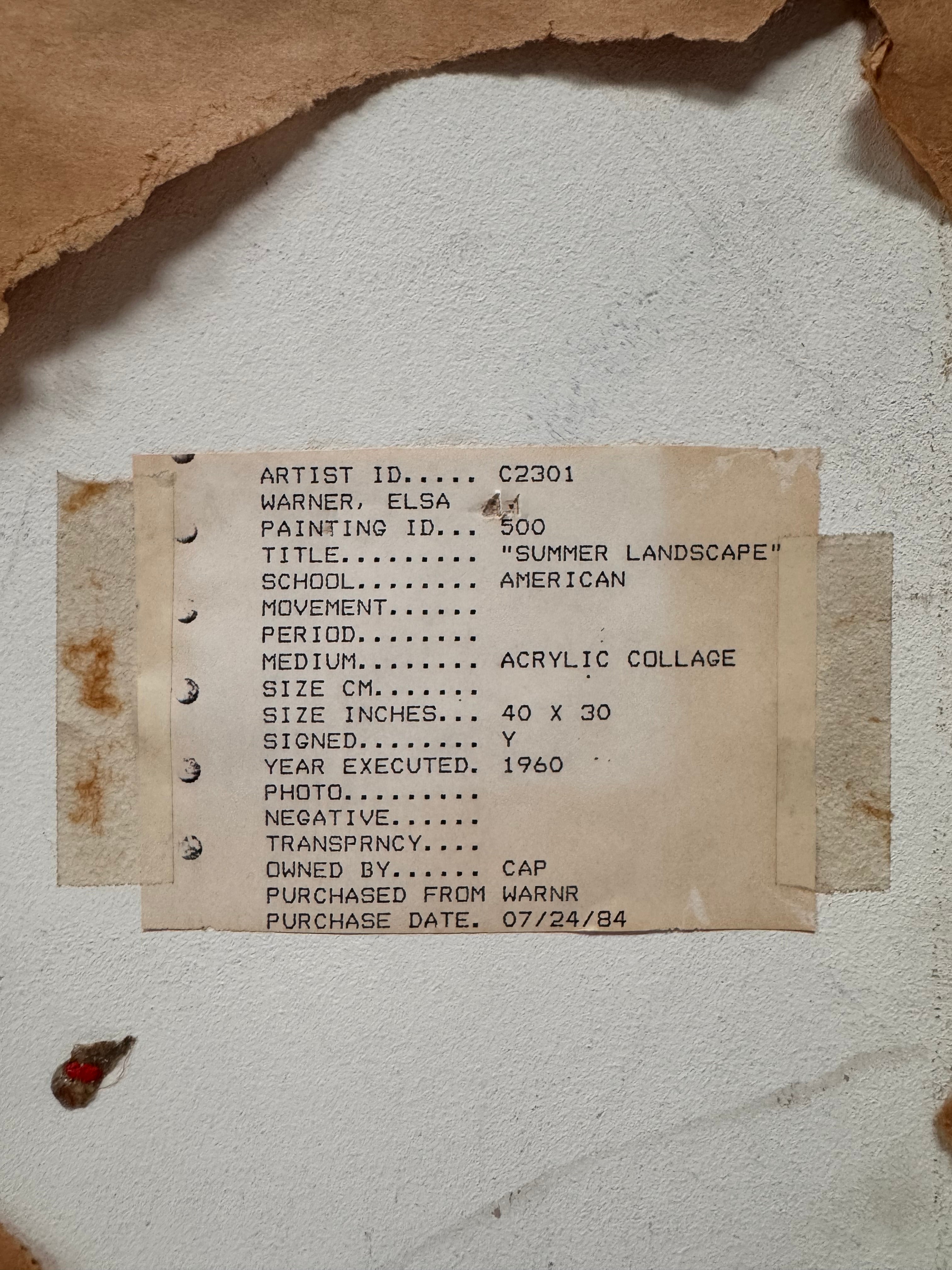 A vibrant and structurally complex work by mid-century California artist Elsa Warner, Summer Landscape represents a bold departure from traditional scenic painting into the realm of textural abstraction.