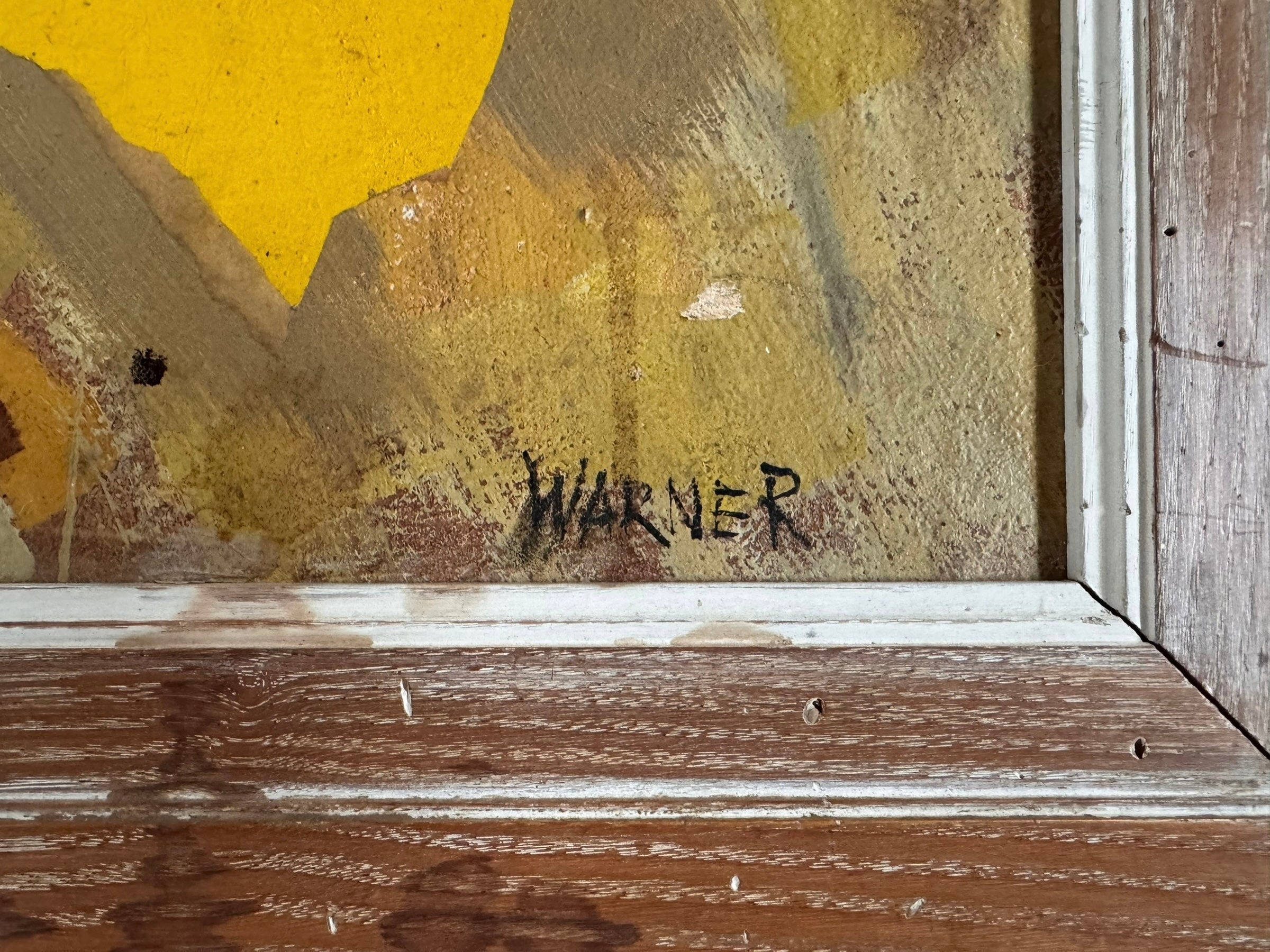 The surface is rich with tactile interest, utilizing a heavy, collage-like layering technique that suggests the use of gouache, ink, and dry media alongside pigment. This impasto approach creates a sculptural depth, inviting the viewer to explore the rugged topography of the paint itself. The work is signed "WARNER" in the lower right in black ink.