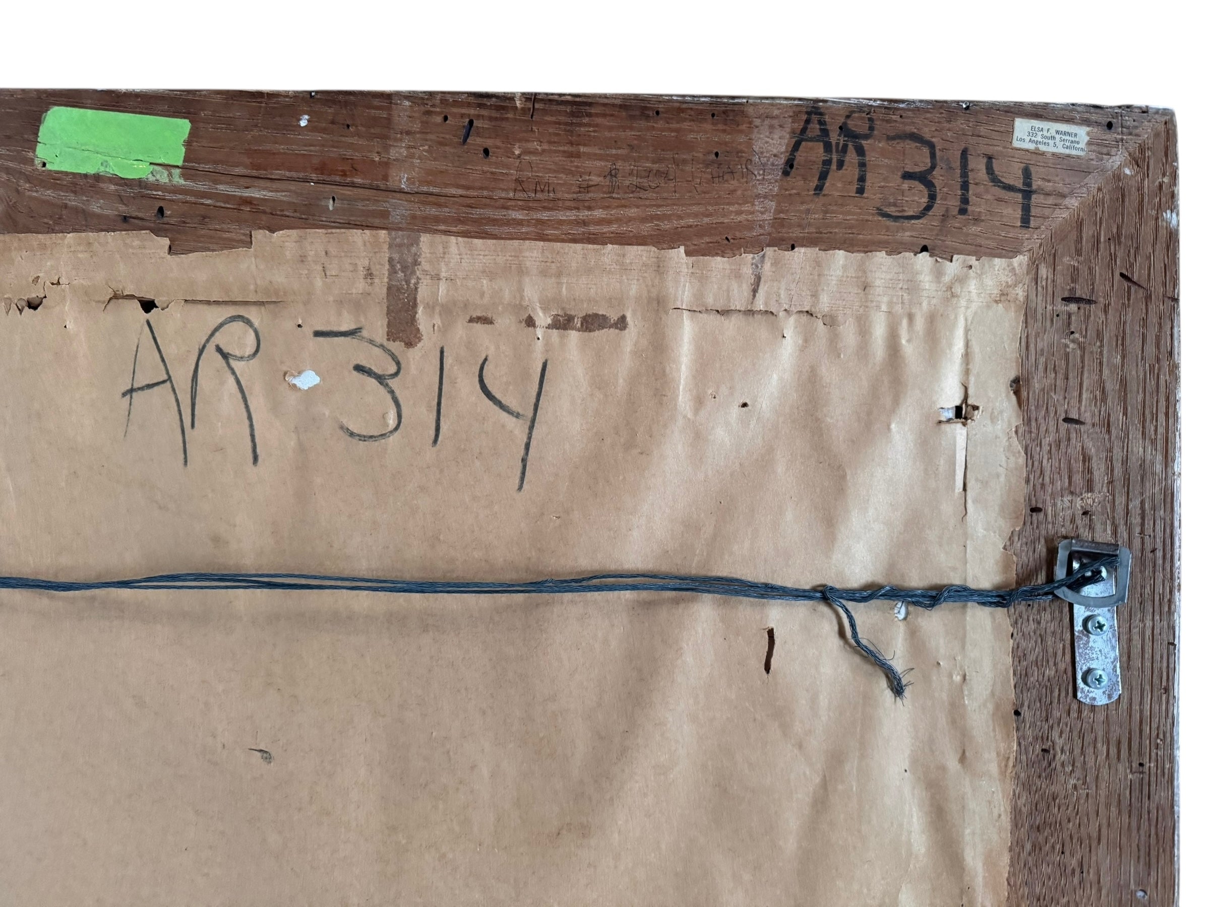 This mixed media composition on board showcases Warner’s experimental sensibility, developed during her training at the influential Otis Art Institute in Los Angeles in the 1930s. Rather than a literal depiction of nature, Warner deconstructs the summer season into its essential energies: heat, light, and shadow. The work is characterized by a dynamic interplay of jagged, geometric forms and a warm, earthy palette dominated by sun-drenched yellows, ochres, and deep forest greens.