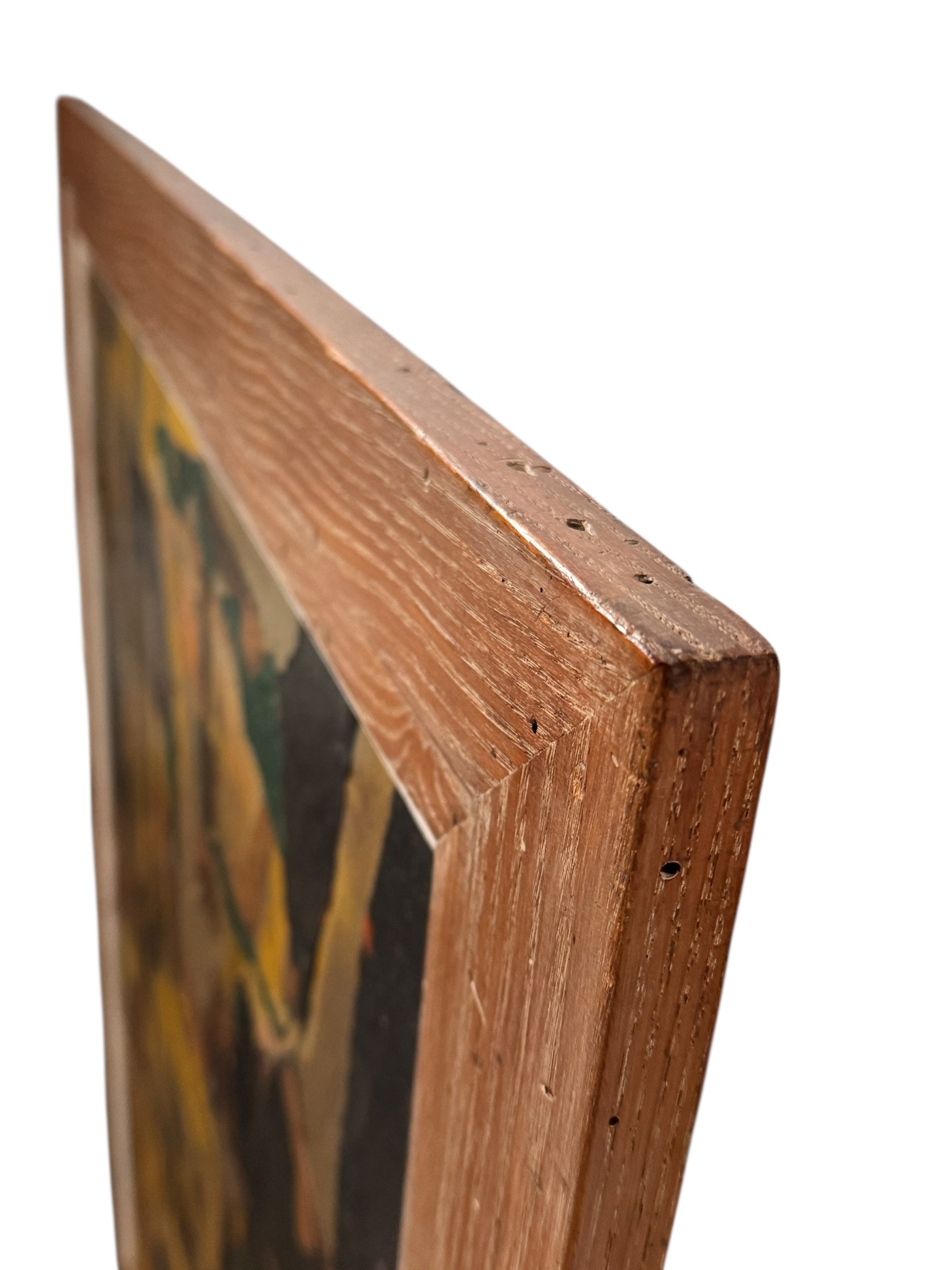 The piece is housed in its original, mid-century wood frame. The frame features a distinctive profile with a white-washed interior bevel transitioning to a rustic, textured wood exterior. It exhibits age-appropriate wear, including minor abrasions and finish loss (notably on the white inner edge), which reinforces the authentic, vintage provenance of the object without distracting from the artwork's bold energy.