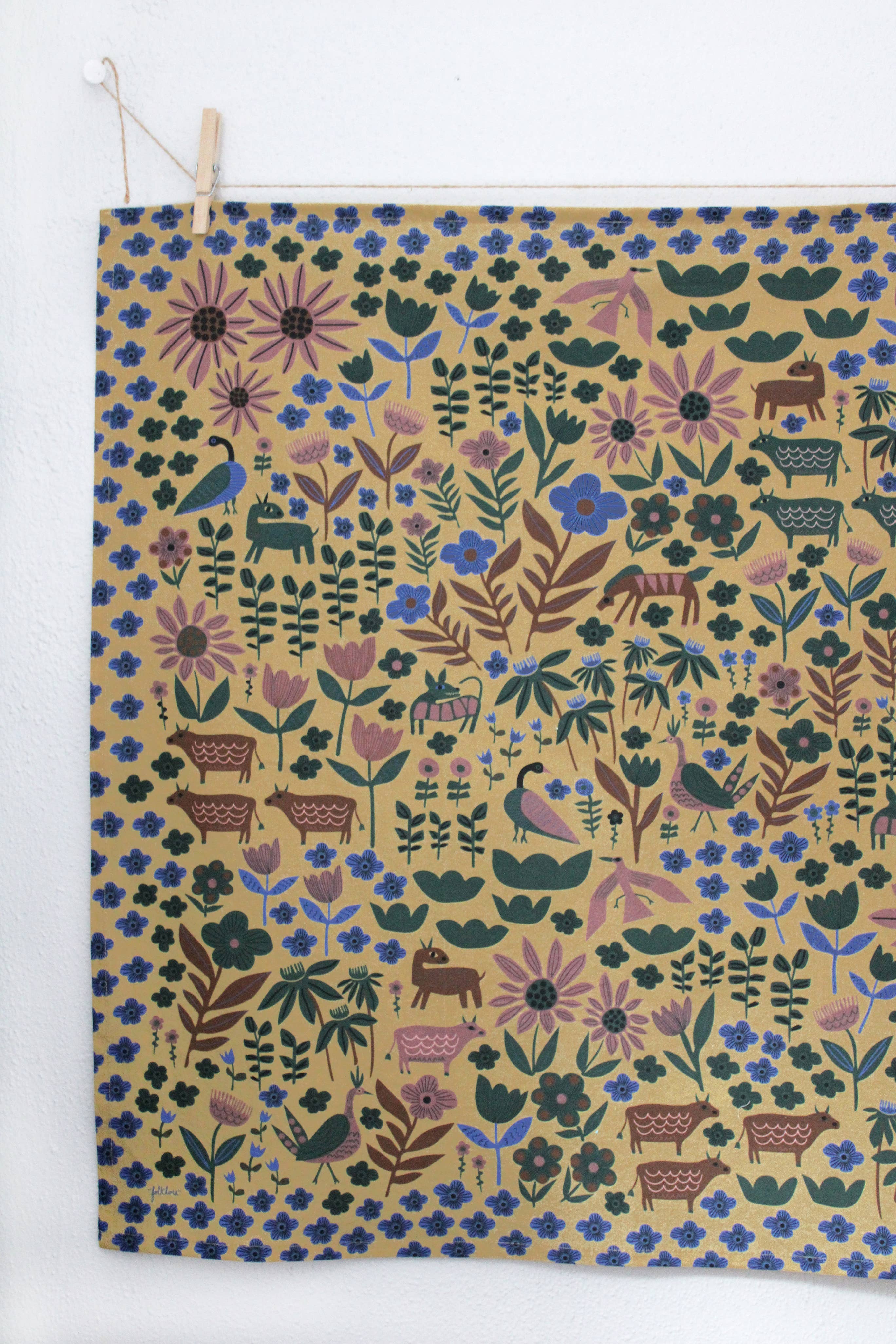 Bring a touch of whimsy to your kitchen or gallery wall with the "Folklore" art tea towel by Leah Duncan. This flour sack towel features a folk-art-inspired design showcasing an eclectic mix of animals, including cows, birds, and deer, amongst stylized flowers and foliage. The color palette includes shades of blue, brown, green, and purple set against a golden-tan background.