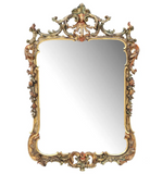 The mirror's frame exemplifies the Rococo aesthetic through its dynamic composition of hand-carved scrolls and foliate motifs. This emphasis on ornamentation, departing from strict geometric structures, introduces a sense of movement and visual interest, inviting closer examination of the intricate details.