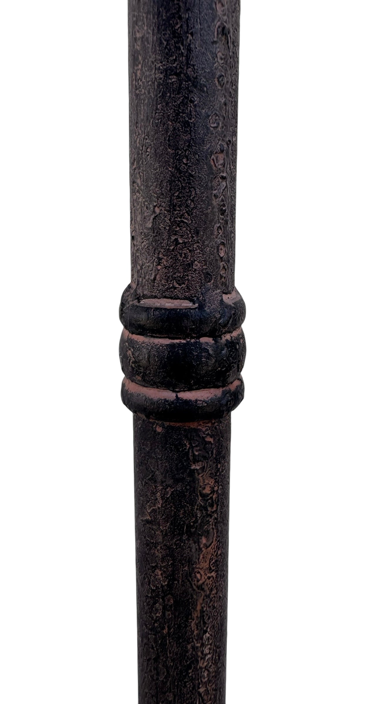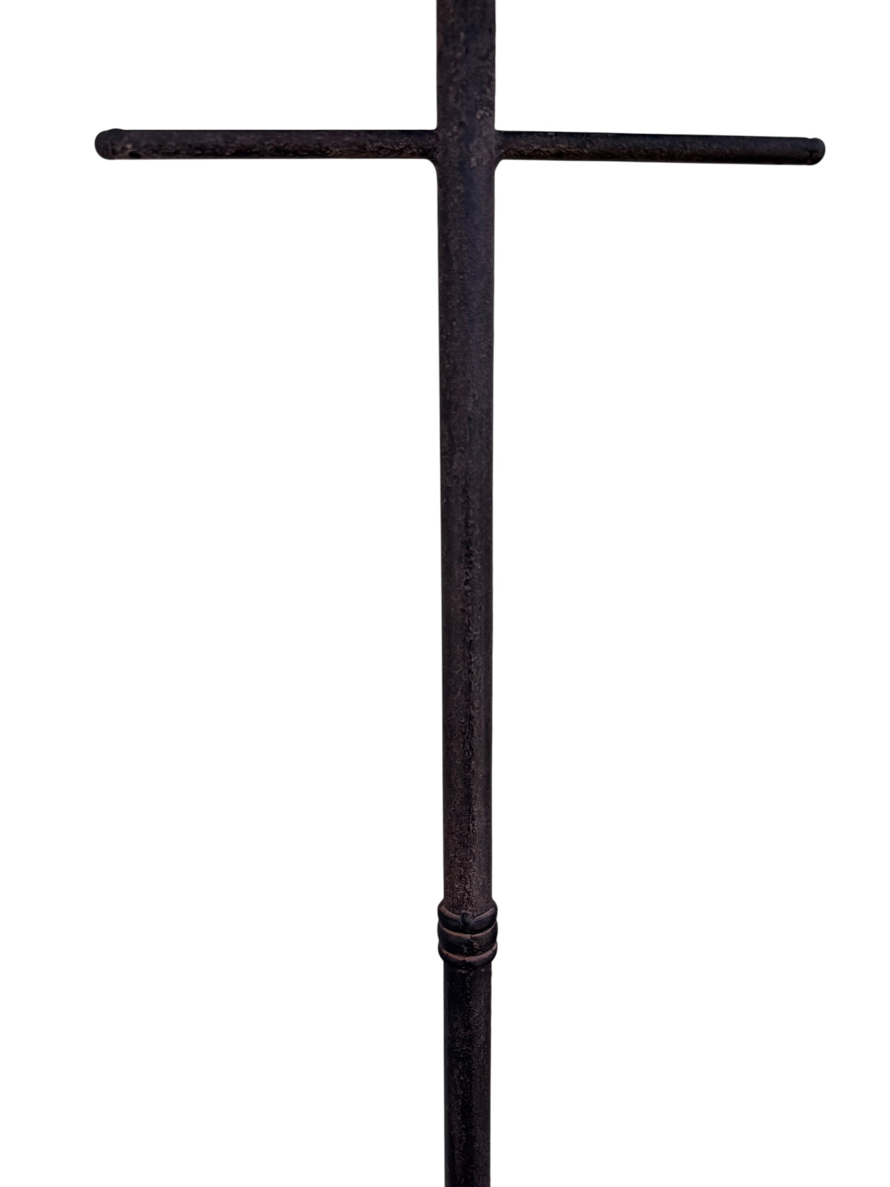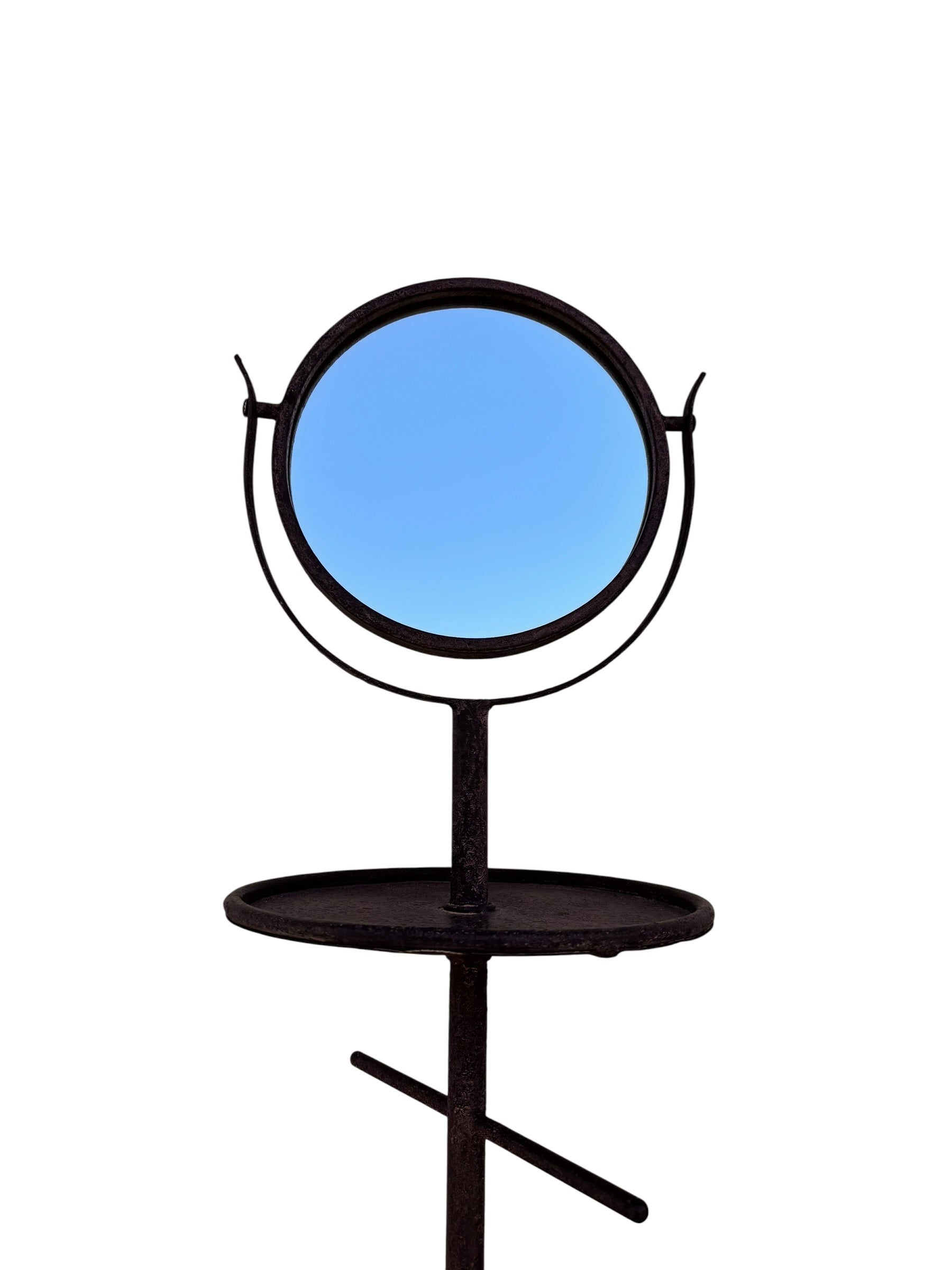 This early 2000s reproduction vanity stand serves as a sophisticated exercise in industrial romanticism, merging the utility of a traditional shaving station with the slender, gestural silhouette of modern sculptural metalwork. Forged from heavy iron, the piece is anchored by a tripod of out-swept cabriole legs that provide a grounded and deliberate footprint. Its vertical axis is punctuated by a central gallery tray and streamlined horizontal hooks, offering a minimalist solution for jewelry, linens, or daily essentials. The composition is crowned by a circular tilting mirror suspended within a graceful wishbone yoke, allowing for functional adjustment while maintaining a play on pure geometric form. A hand-applied patina softens the iron’s structural gravity, celebrating a weathered, artisanal character that allows this piece to transition effortlessly between a modern dressing suite and an eclectic entryway.