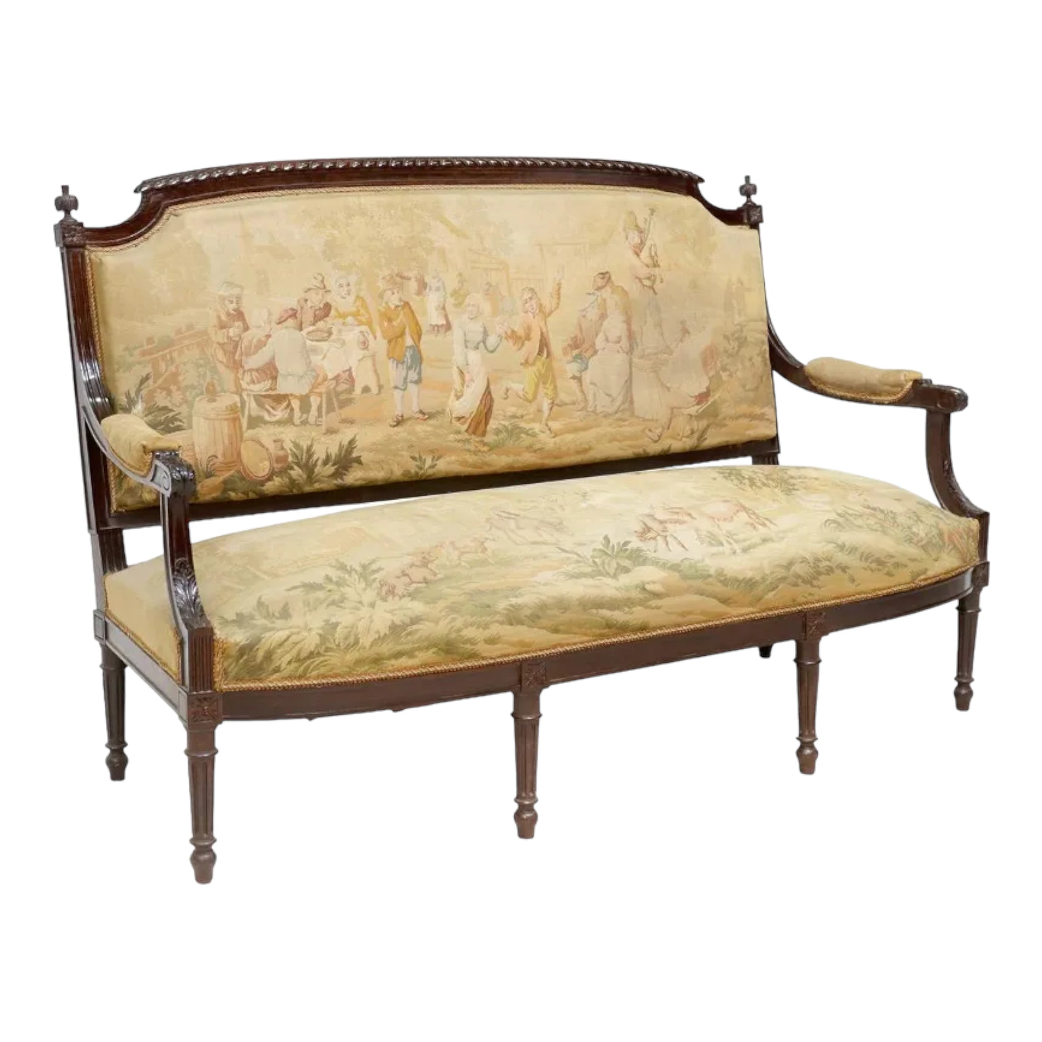 Eleve su espacio vital con la elegancia atemporal de este sofá de salón de palisandro tallado estilo francés Luis XVI de finales del siglo XIX. Esta exquisita pieza cuenta con un respaldo de forma elegante adornado con una delicada moldura de cinta y remates foliados ornamentados. Su tapicería es una obra de arte en sí misma, que representa una pintoresca escena de fiesta figurativa en contraste con un paisaje pastoral. Sostenido por patas cónicas acanaladas que culminan en patas de flecha, este sofá irradia sofisticación y encanto.