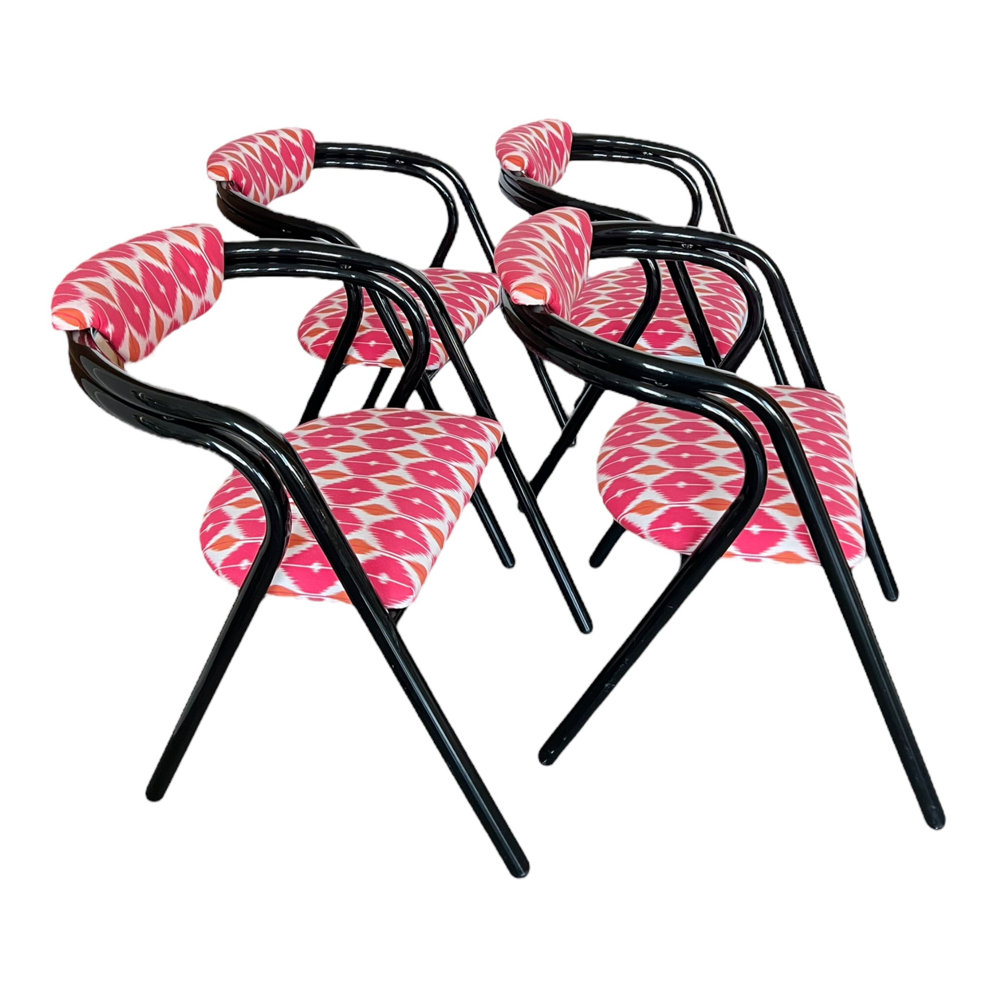 Una sensación tubular en cualquier espacio. Retapizado en tela Schumacher sobre cojines nuevos. Estructura original lacada en negro. Un fabuloso toque de rosa, naranja y blanco está conectado simétricamente por una línea casi invisible en el patrón. Alguna pérdida menor en el revestimiento de laca negra. En gran estado vintage. Pies de goma redondeados. Al estilo de Brian Kane.