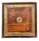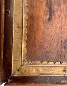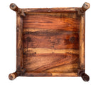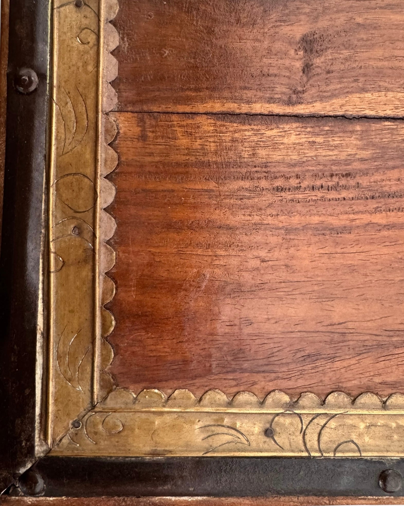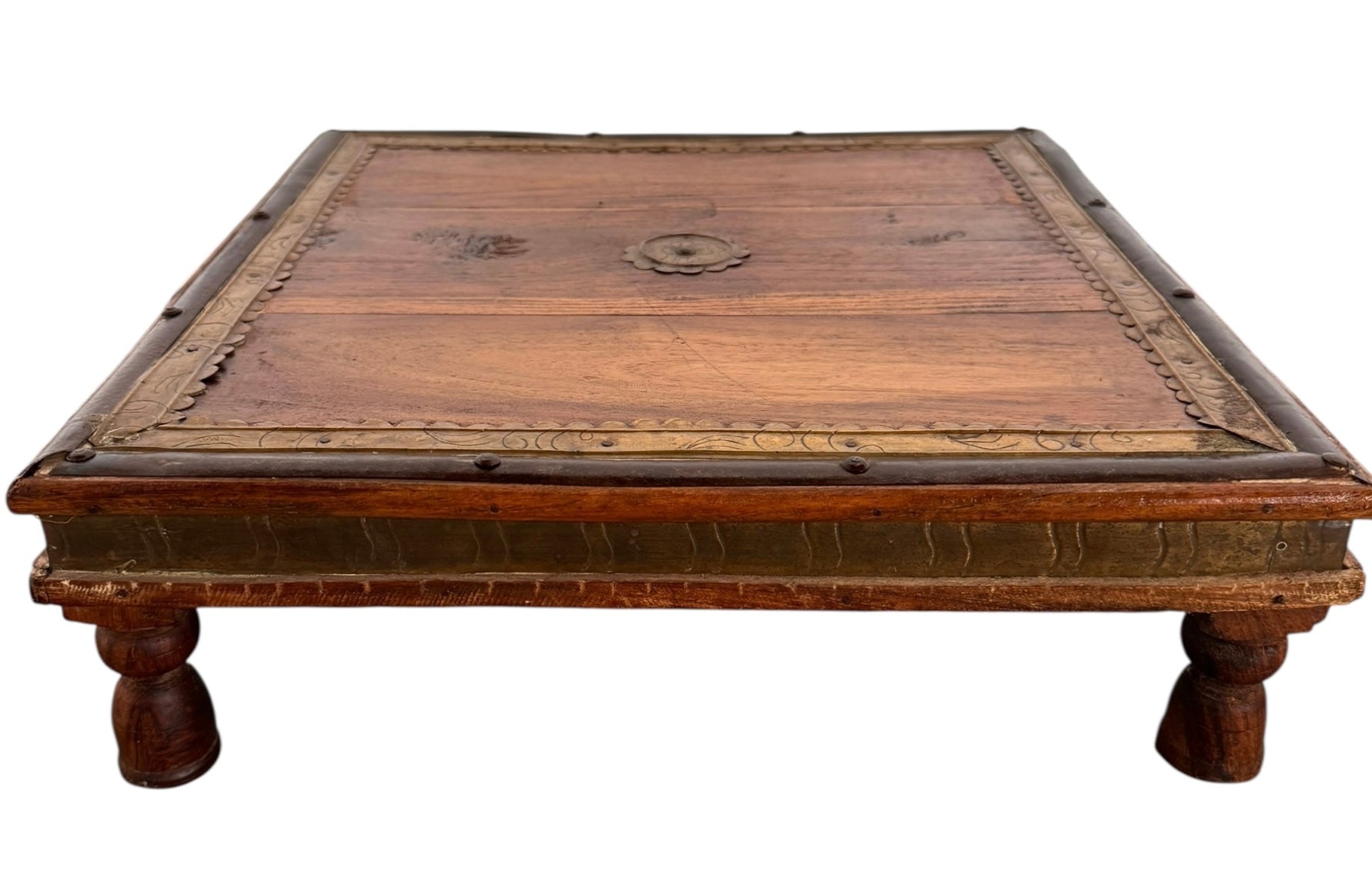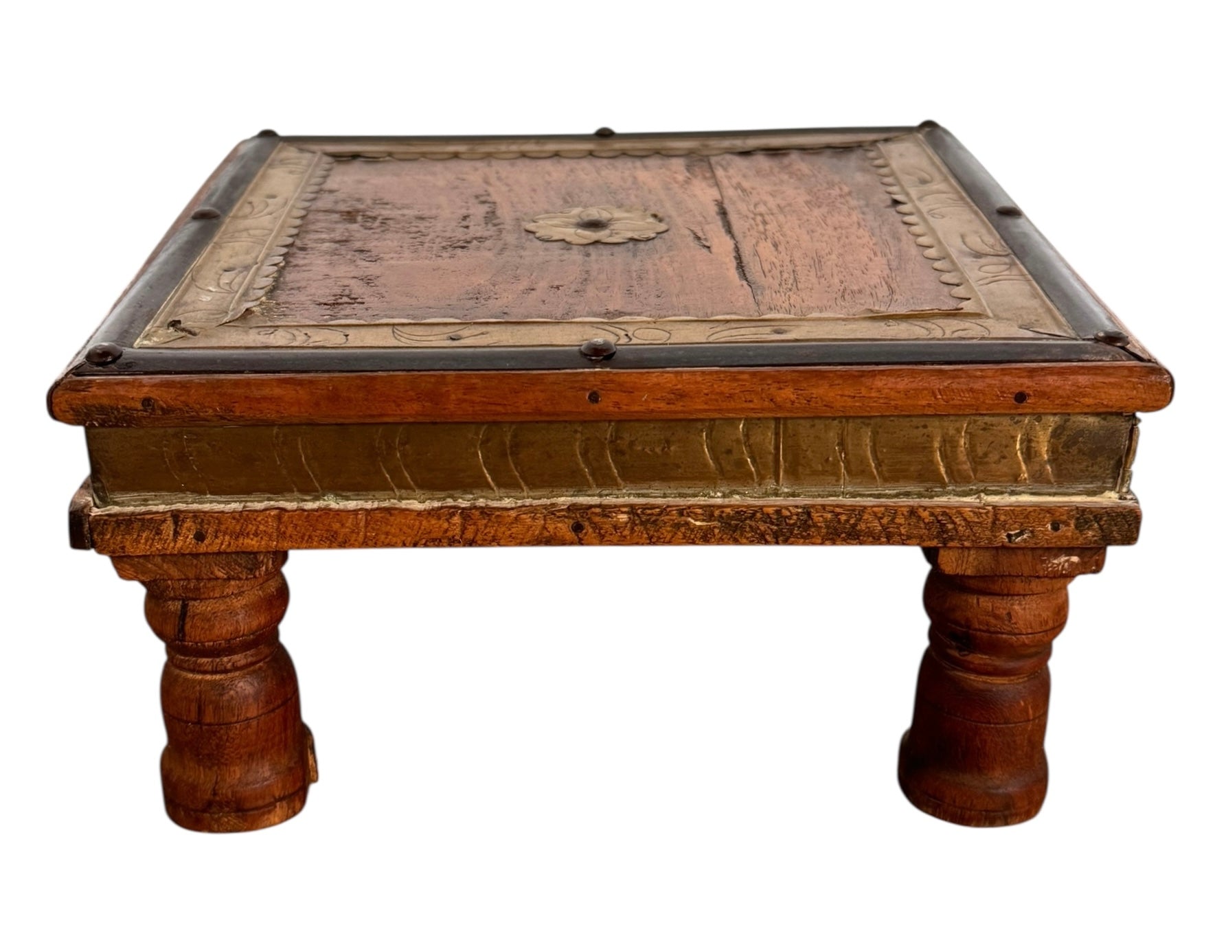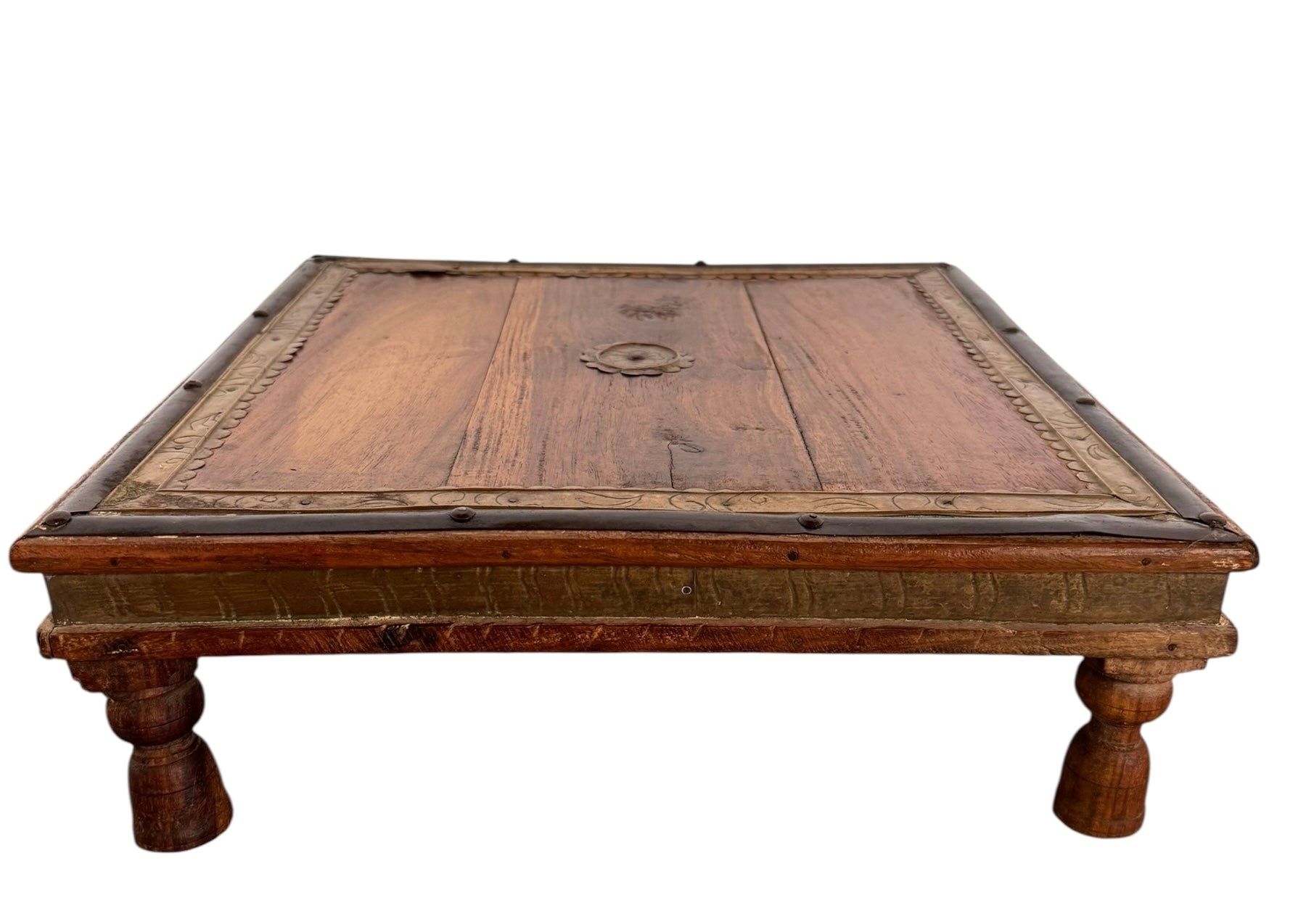 Constructed from dense, high-status teak wood, each square table is anchored by a delicate, repoussé brass rosette at its center. The wood is framed by a hand-hammered brass perimeter featuring scalloped edges and incised foliate scrollwork, while a contrasting dark metal trim—likely oxidized copper or iron—borders the outer edges to add graphic definition to the gold tones. The apron continues this metallic narrative with textured sheeting secured by decorative tacking.
