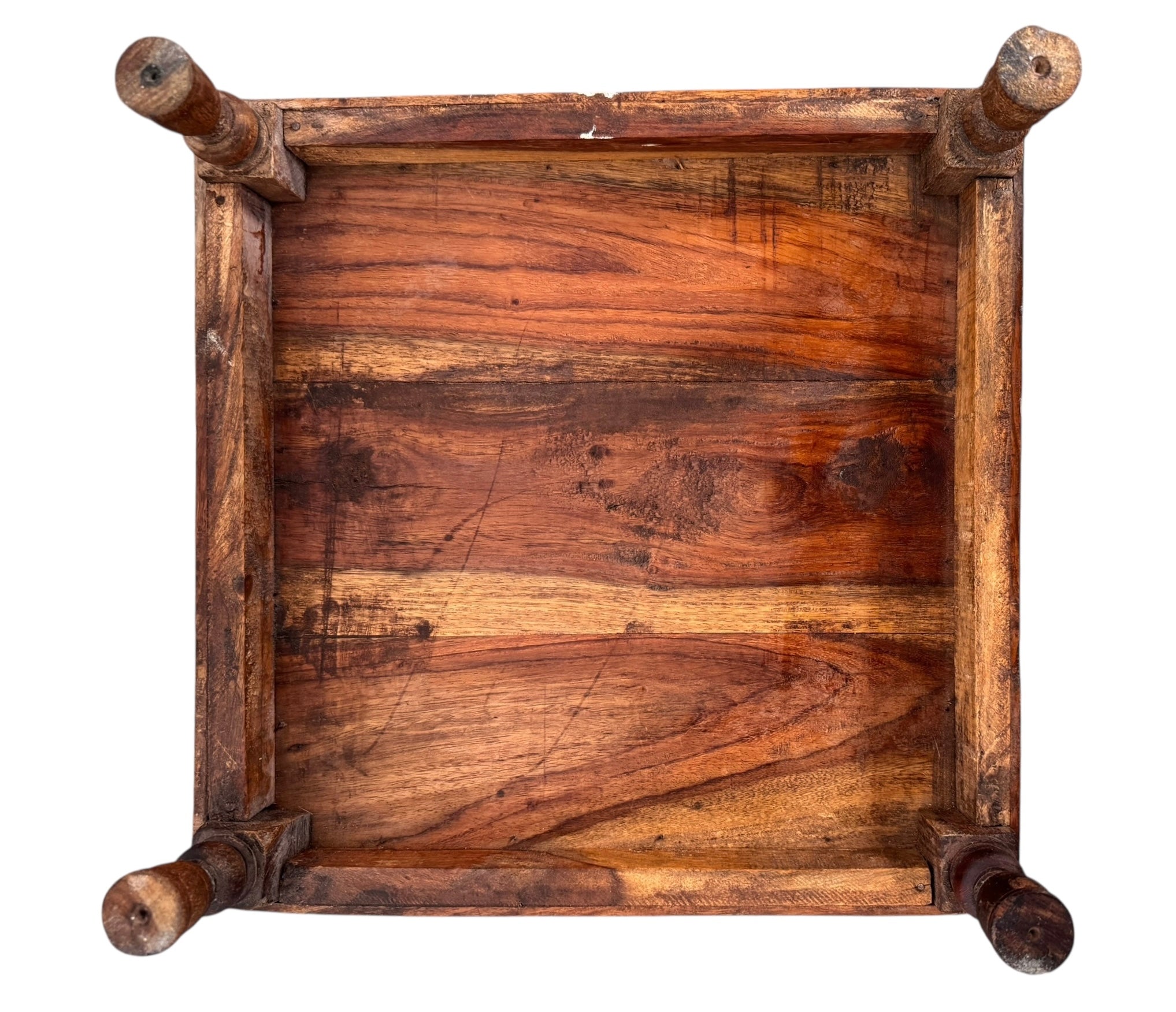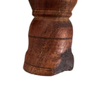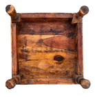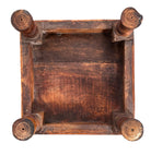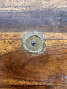 The platforms rise on stout, lathe-turned wooden baluster legs that display the pegged mortise joinery and tool marks characteristic of artisan construction rather than factory production. Visually, the set exhibits the desirable, authentic wear consistent with its mid-20th-century origins. The brass has softened into a warm, mellow glow with natural oxidation in the crevices, while the wood surfaces bear the historic character of use, confirming its lineage as a true vintage artifact.