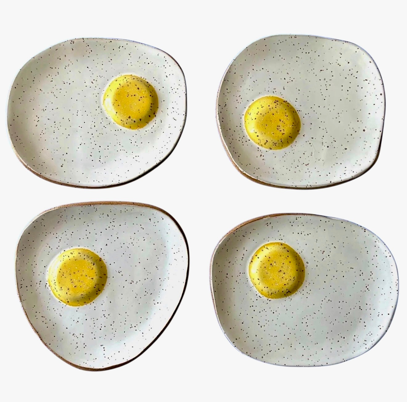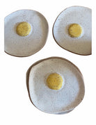 These handmade ceramic plates by Heavyweight Ceramics reinterpret the fried egg as a minimalist still life—softly irregular, speckled stoneware grounds a glossy golden yolk that rises gently from the surface. Each piece feels intentional yet organic, embracing variation as part of its charm.