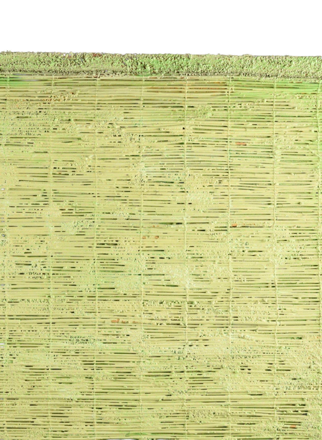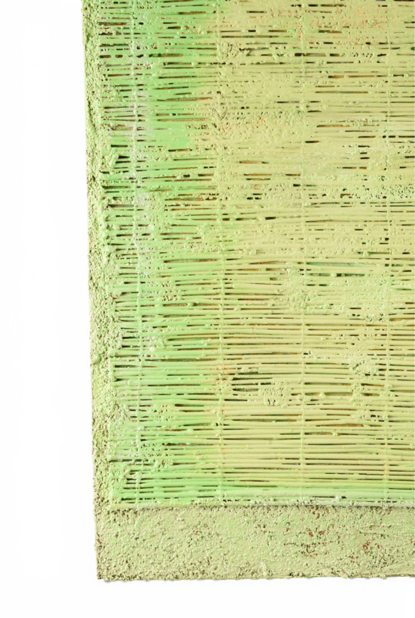The work is a rigorous study in horizontal linearity, utilizing ribbed plastic elements to create a shutter-like veil that suggests an urban landscape filtered through light. A trio of moss-toned geometric blocks anchors the lower register, providing a structural foundation for the vibrant, monochromatic study in chartreuse and sage. The surface is highly tactile, featuring a crust of stippled acrylic that catches light at varying angles. Consistent with the artist’s use of raw, repurposed materials, the piece exhibits minor surface losses and scattered paint wear. Rather than detracting from the work, these subtle abrasions underscore the gritty, resilient spirit of a New York spring, revealing the industrial substrate beneath the pigment and adding a weathered, authentic character.