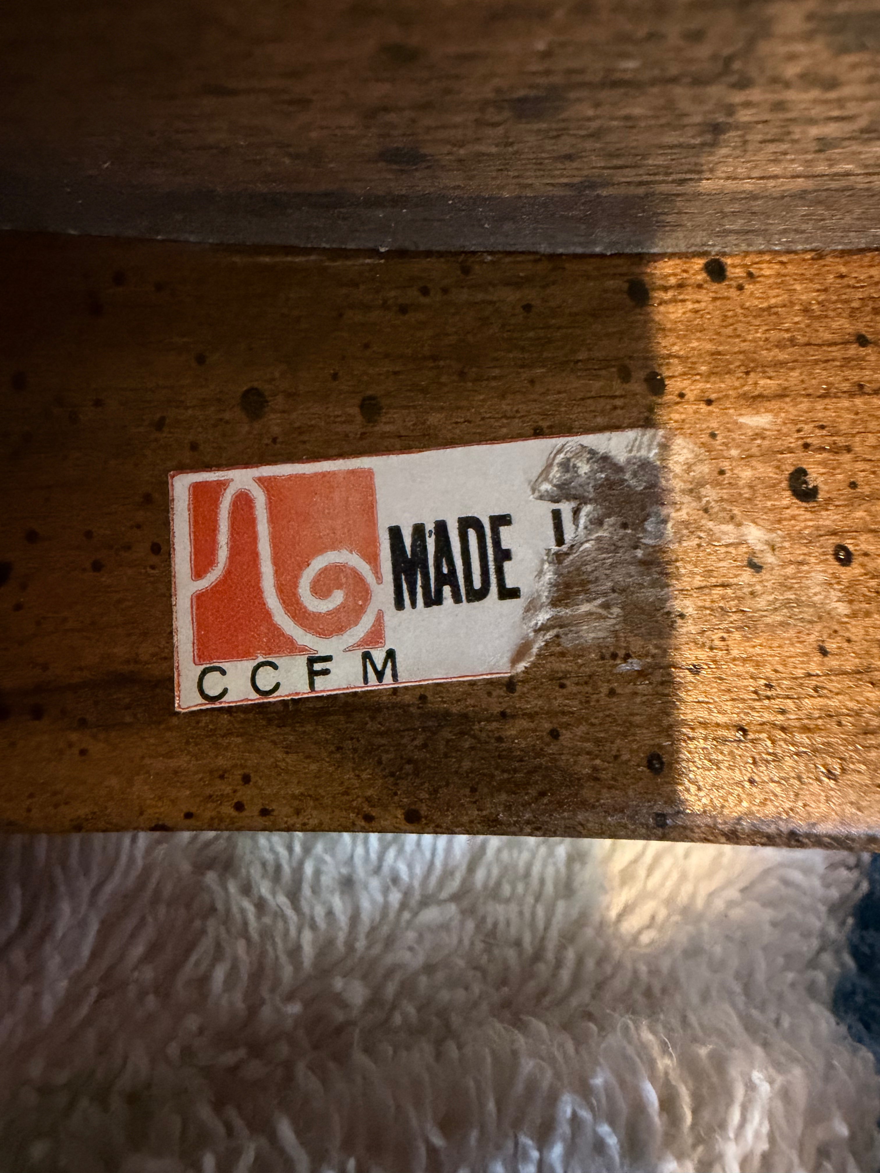 Bearing the distinguished CCFM (Canadian Council of Furniture Manufacturers) certification, this table is a testament to the exceptional craftsmanship of Canada's peak mid-century furniture era. While retaining its structural integrity and charm, this vintage piece showcases the authentic character of its age, with visible nicks and wear to the wood that tell a story of its storied past.
