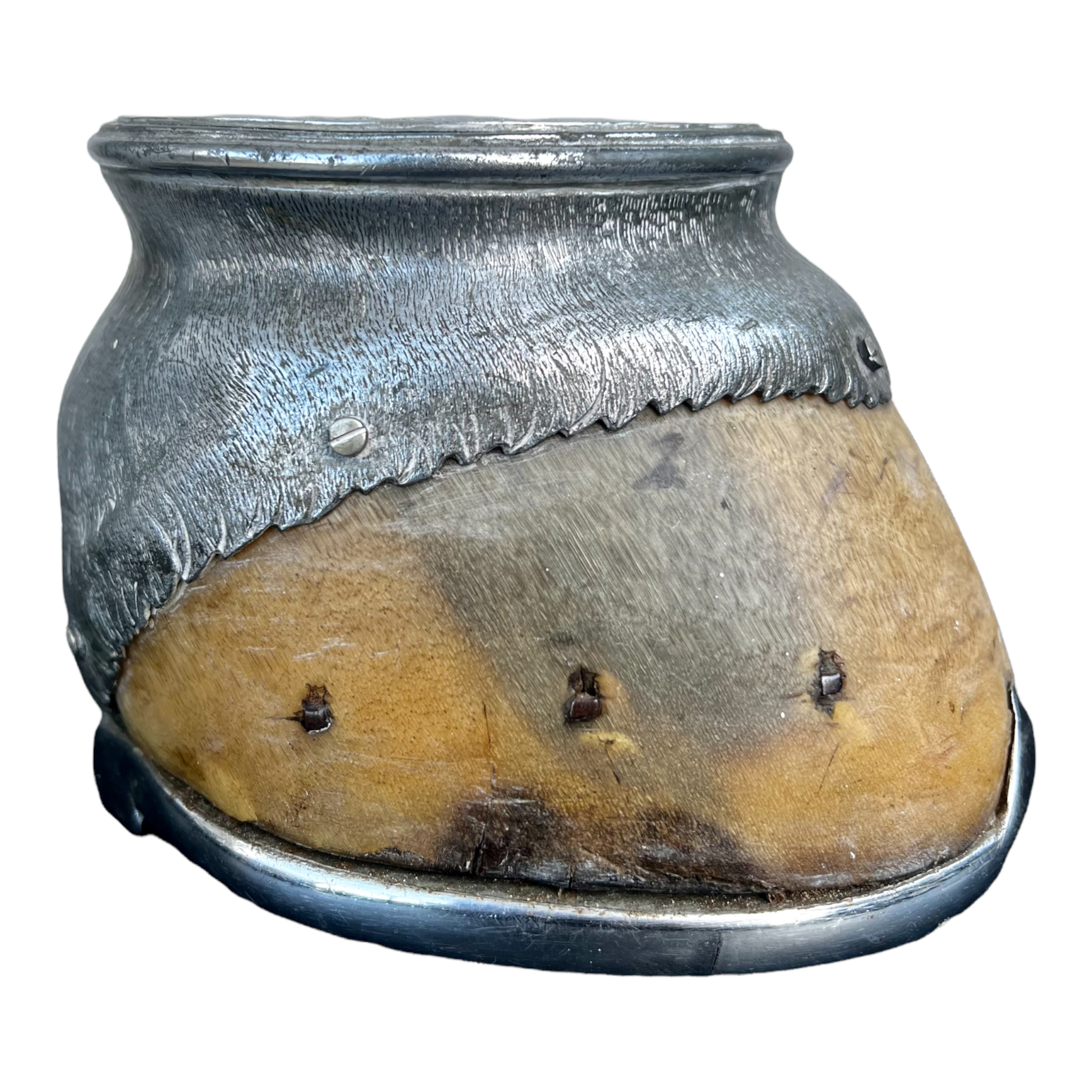 Esta obra ha sido creada a partir de la pezuña de un caballo, aplicada con una montura y tapa plateadas. Grabado para imitar el pelo de caballo real. Algunos se desgastan en el revestimiento de la parte superior y el borde. Chapado en plata, pezuña y herradura de acero. Ropa vintage en todas partes.