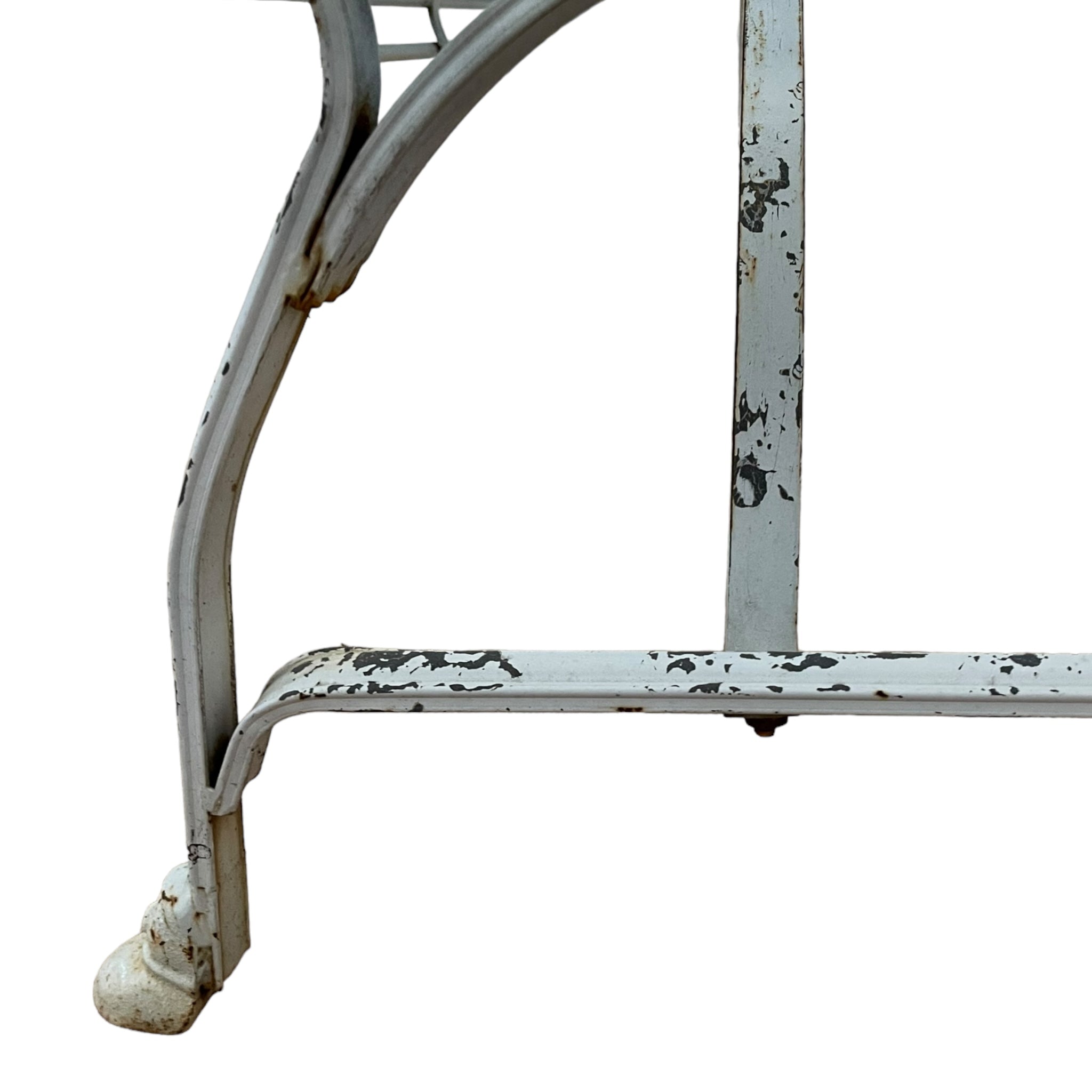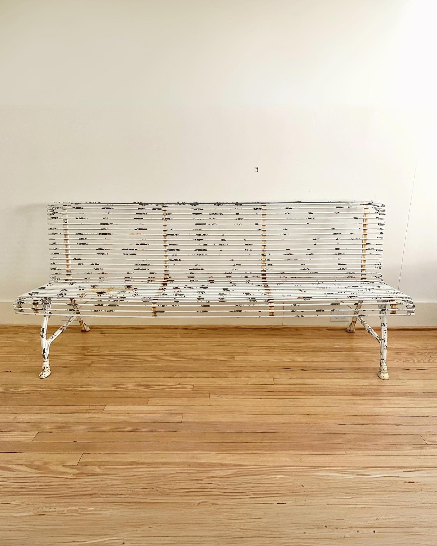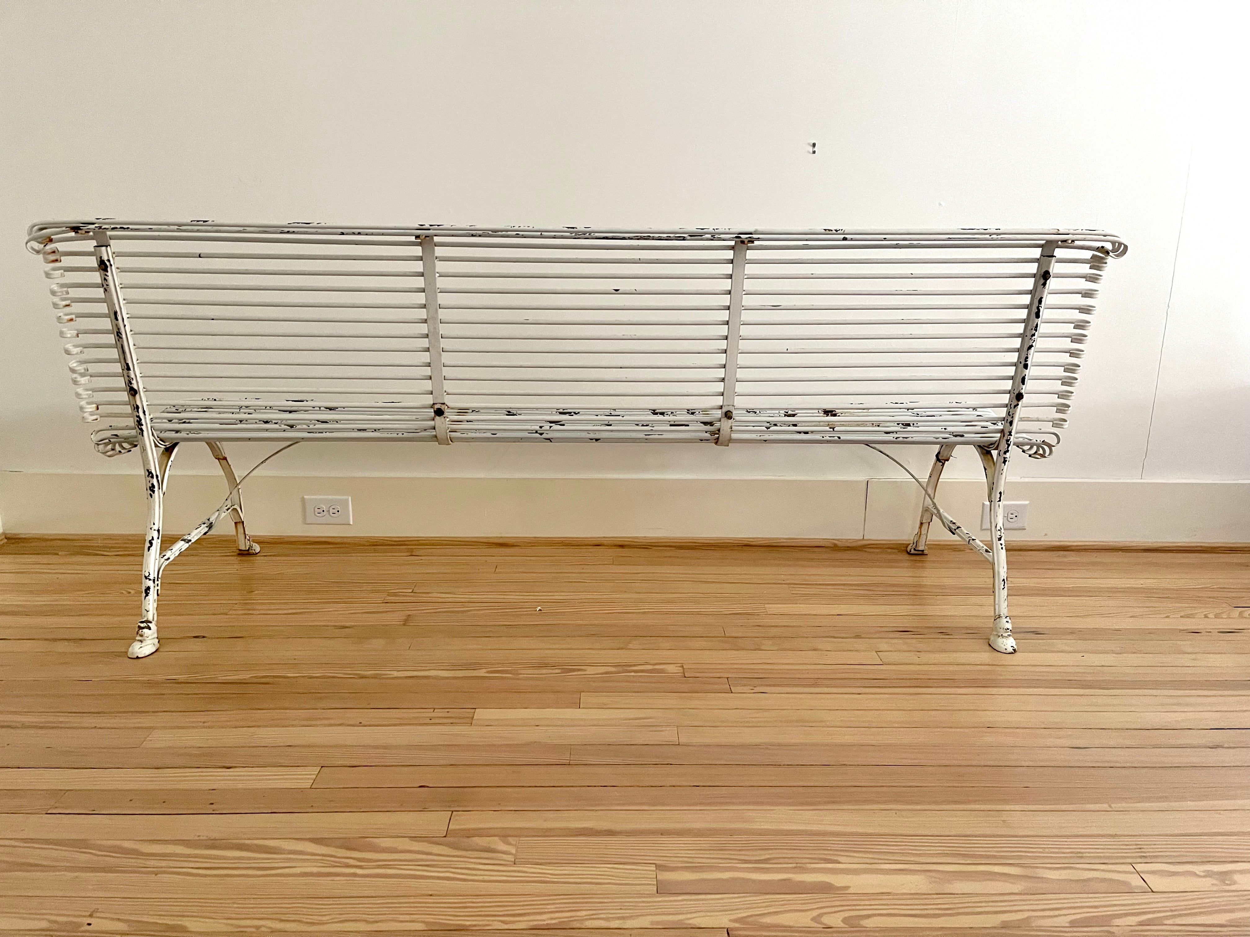 Elevate your outdoor space with this exquisite wrought-iron bench. Featuring elegant lines and lion's paw feet, this antique piece can be used indoors or outdoors. Good condition. Wear consistent with age. Some patina and rust, as shown in photos. Structurally sound and sturdy. Unmarked.