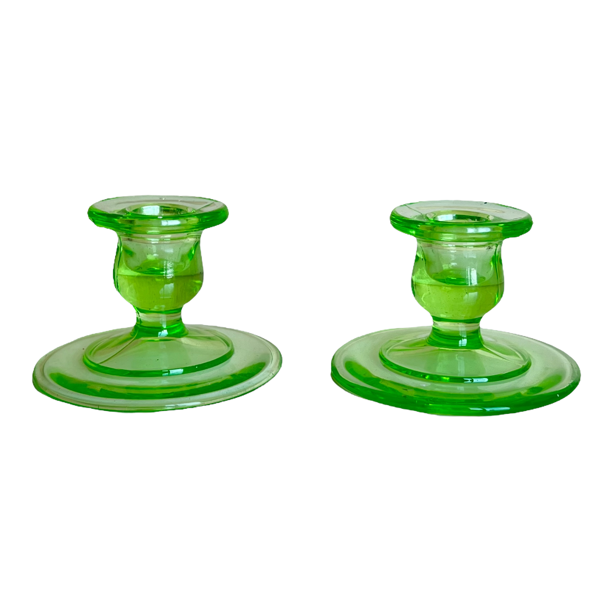 Il neon originale. Il vetro vaselina, chiamato anche vetro all'uranio, conferisce a questi portacandele un design semplice con un tocco di colore verde brillante. Particolarmente luminoso sotto una luce blu. Aggiungi un tocco in più al design del tuo tavolo. Versatile quanto bello. La coppia può essere utilizzata con una candela affusolata alta o rotonda. Basta girarlo. Favolose condizioni vintage. Niente patatine.