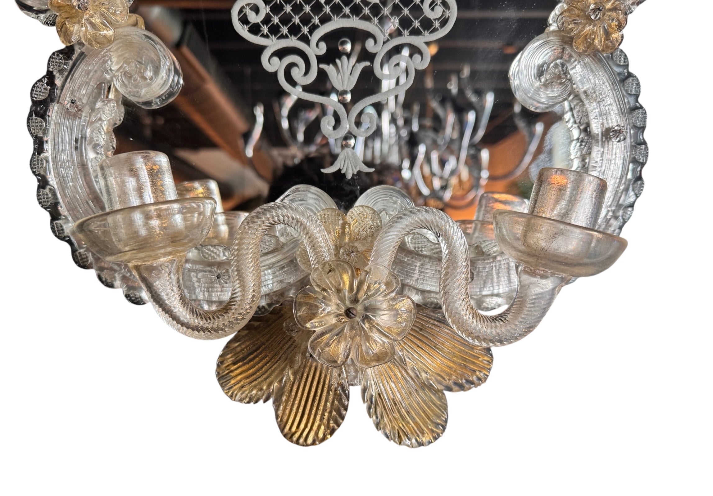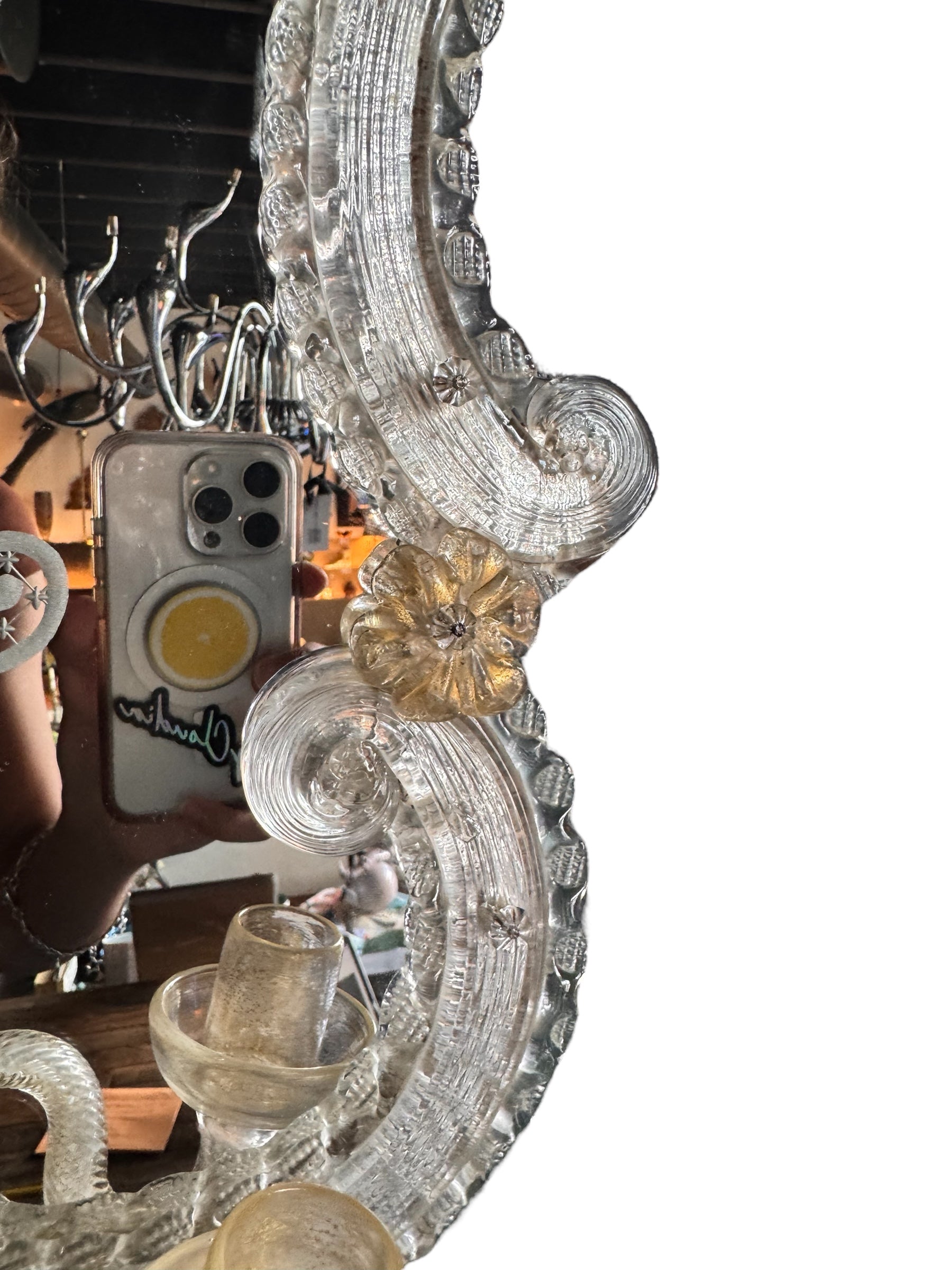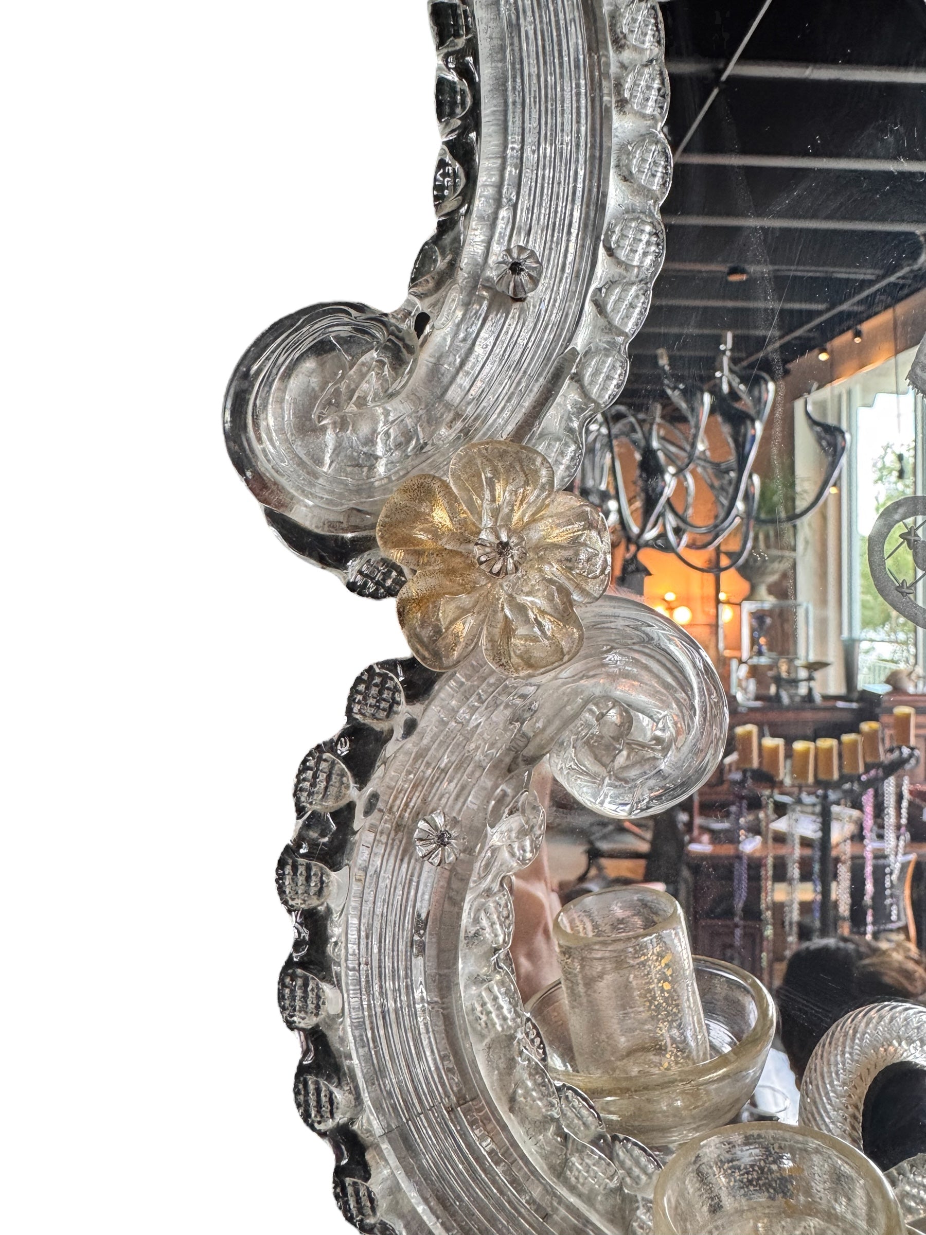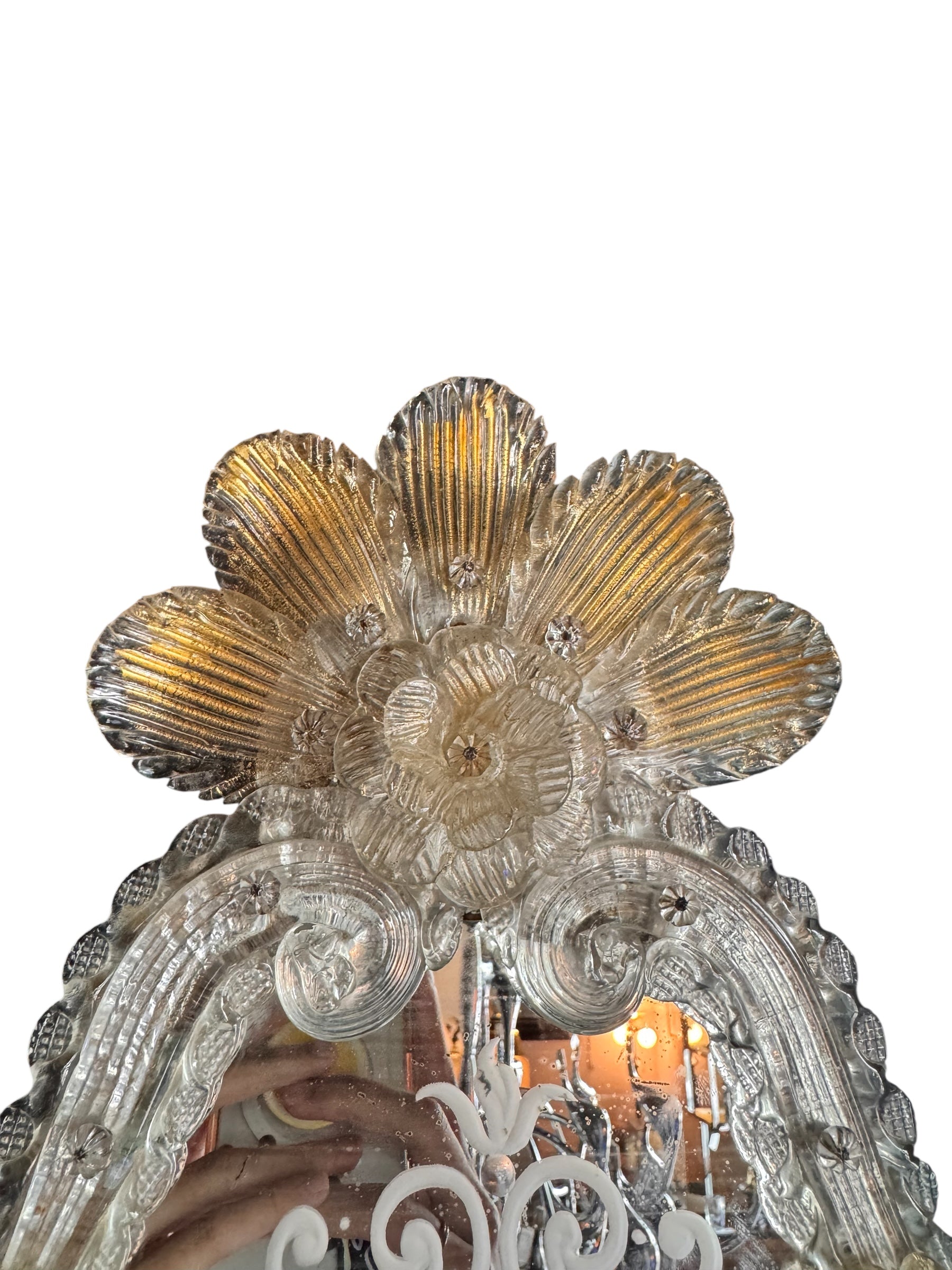 Elevate your interiors with this rare and highly desirable Italian Venetian art glass girandole parclose mirror. A masterpiece of Murano craftsmanship. The magnificent fanned floral crest cascades into a shapely frame, lavishly embellished with scrolled Murano glass cladding. This exquisite detail hints at the time-honored Venetian tradition of vetro soffiato – glassblowing – where molten glass is skillfully shaped by breath and hand, resulting in organic forms and unparalleled artistry.